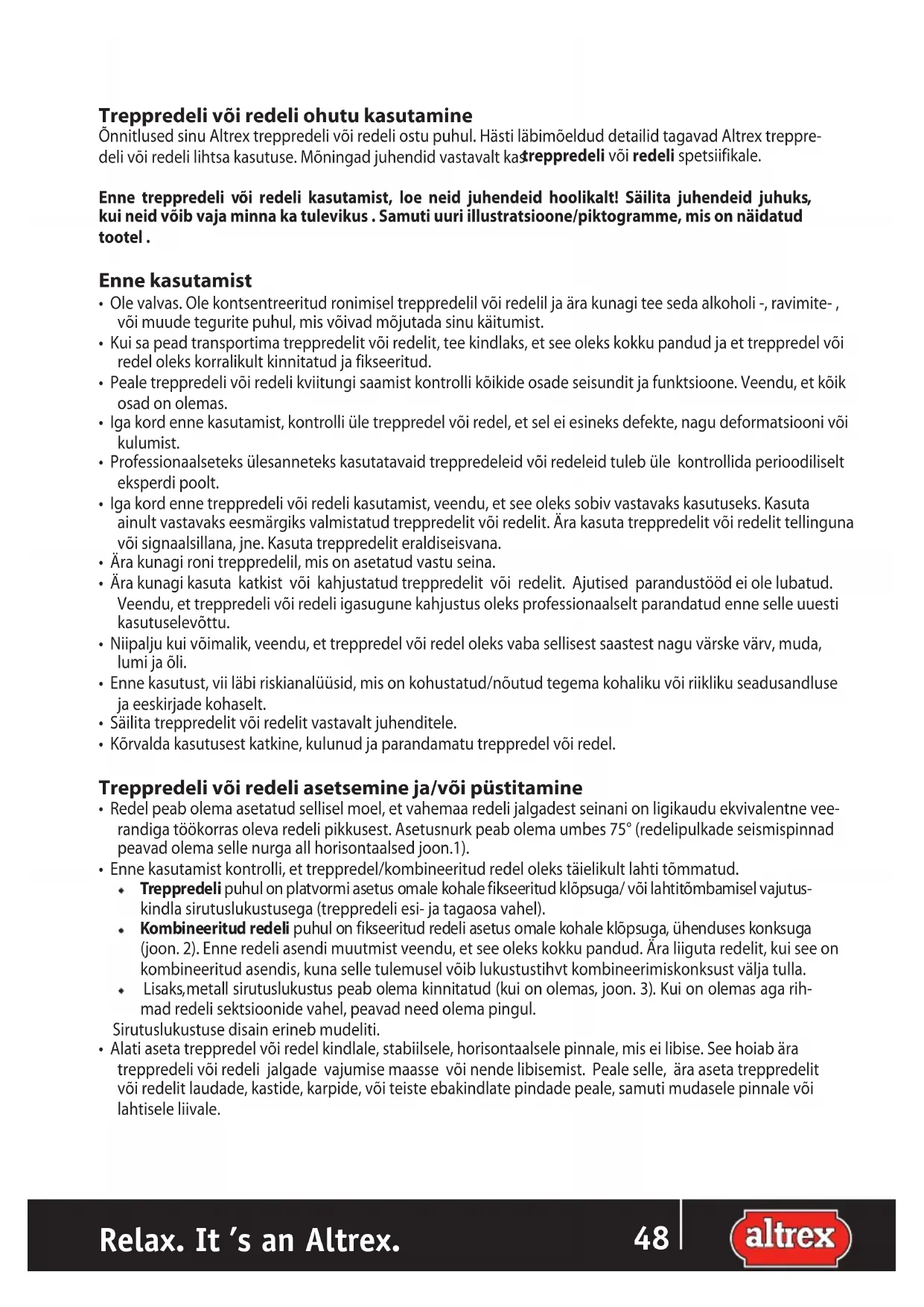Relax. It ’s an Altrex. ISTreppredeli või redeli ohutu kasutamine Õnnitlused sinu Altrex treppredeli või redeli ostu puhul. Hästi läbimõeldud detailid tagavad Altrex treppre- deli või redeli lihtsa kasutuse. Mõningad juhendid vastavalt kas treppredeli või redeli spetsiifikale. Enne treppredeli või redeli kasutamist, loe neid juhendeid hoolikalt! Säilita juhendeid juhuks, kui neid võib vaja minna ka tulevikus . Samuti uuri illustratsioone/piktogramme, mis on näidatud tootel . Enne kasutamist