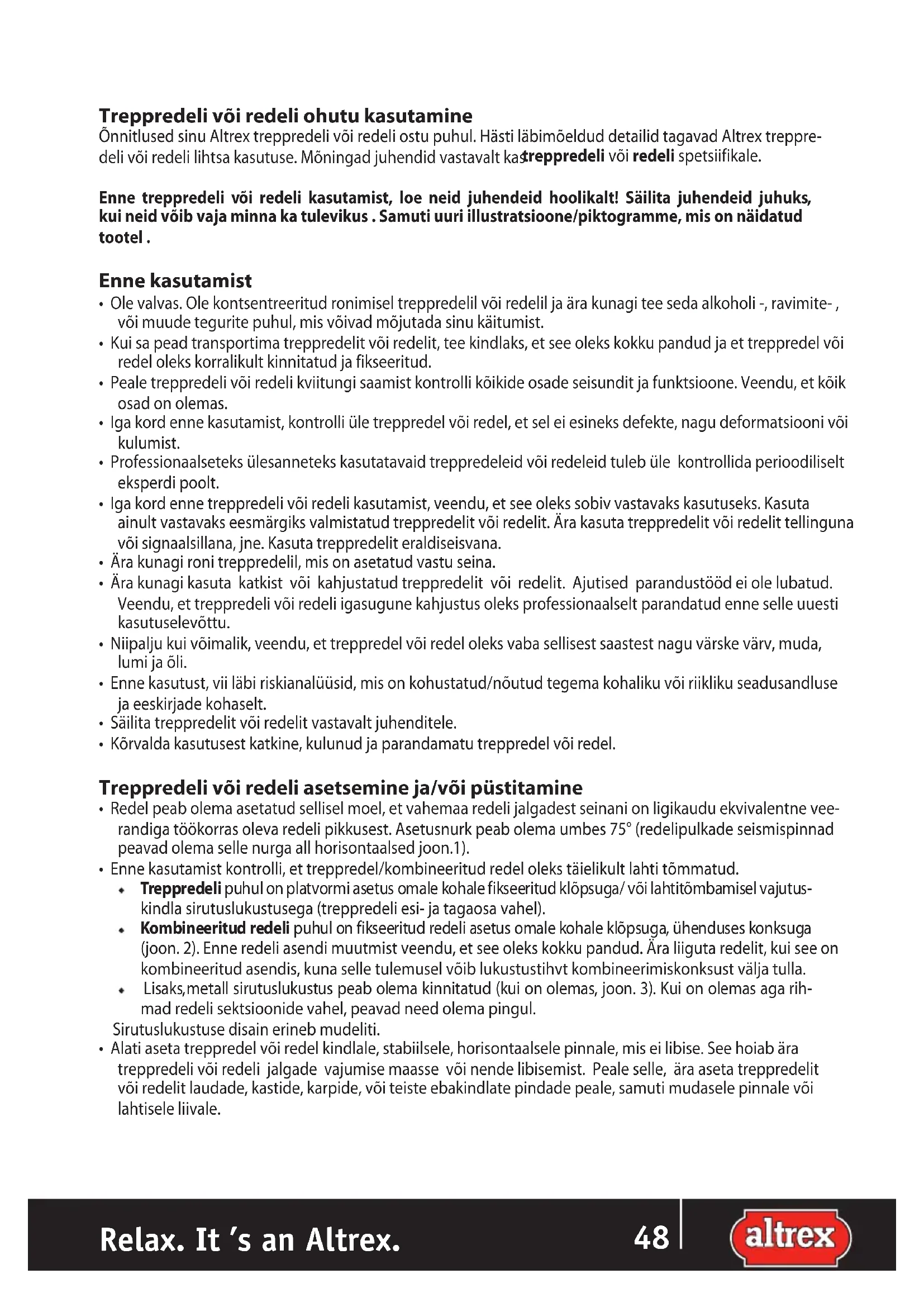 Relax. It ’s an Altrex. ISTreppredeli või redeli ohutu kasutamine Õnnitlused sinu Altrex treppredeli või redeli ostu puhul. Hästi läbimõeldud detailid tagavad Altrex treppre- deli või redeli lihtsa kasutuse. Mõningad juhendid vastavalt kas treppredeli või redeli spetsiifikale. Enne treppredeli või redeli kasutamist, loe neid juhendeid hoolikalt! Säilita juhendeid juhuks, kui neid võib vaja minna ka tulevikus . Samuti uuri illustratsioone/piktogramme, mis on näidatud tootel . Enne kasutamist