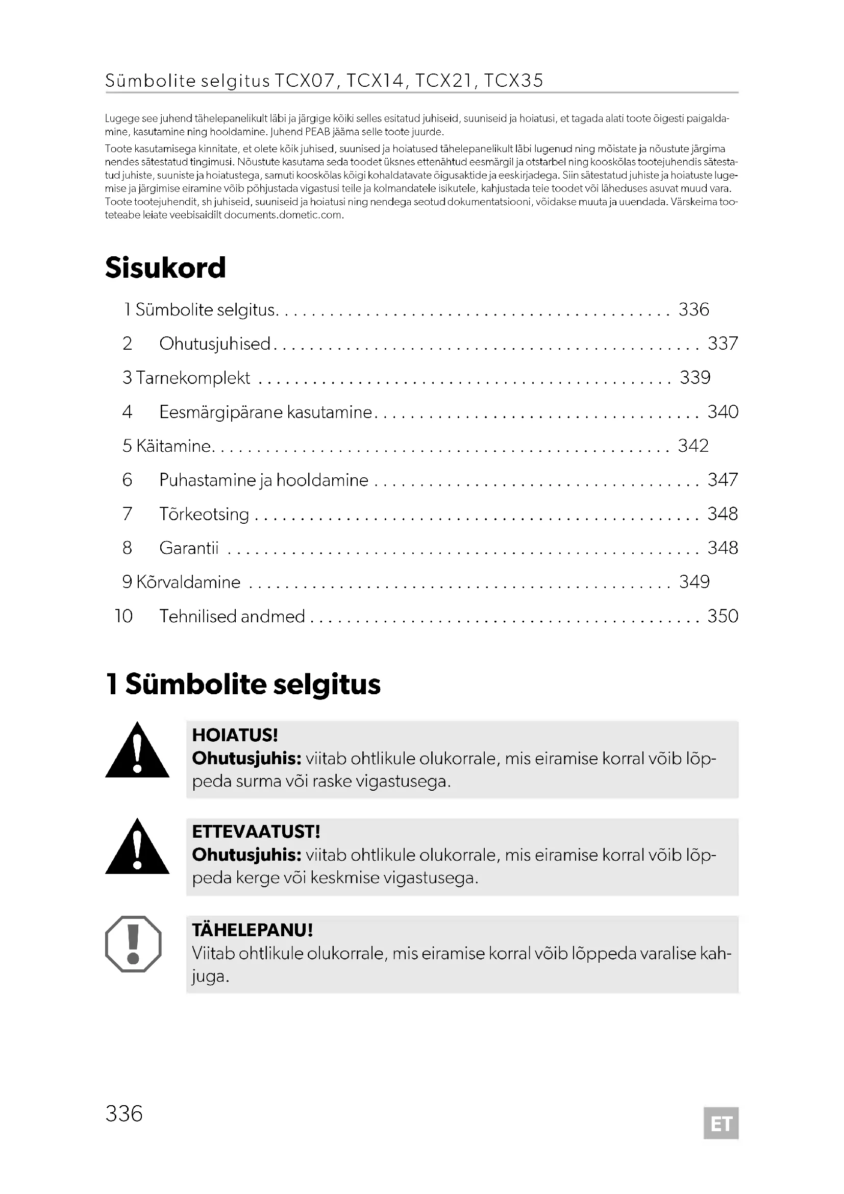 HOIATUS! Ohutusjuhis: viitab ohtlikule olukorrale, mis eiramise korral võib lõp- peda surma või raske vigastusega. ETTEVAATUST! Ohutusjuhis: viitab ohtlikule olukorrale, mis eiramise korral võib lõp- peda kerge või keskmise vigastusega. TÄ HE LE PA NU ! Viitab ohtlikule olukorrale, mis eiramise korral võib lõppeda varalise kah- juga. DometicTCX07-TCX35_OPM_4445103171_EMEA16-ar_202x-xx-xx.book Page 336 Tuesday, November 29, 2022 11:33 AMET TCX07, TCX14, TCX21, TCX35 Ohutusjuhised