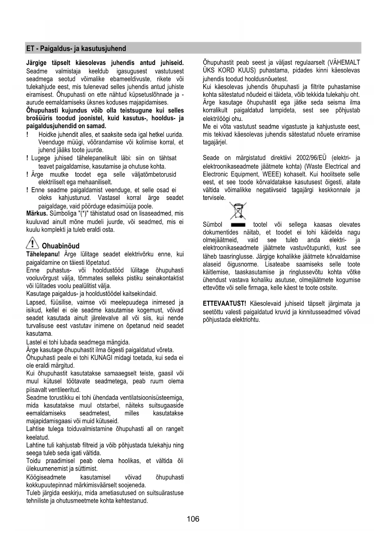 Зняти вугільний фільтр повертаючи ручки на 90° що фіксують його до ковпака. Заміна Ламп Витяжка обладнана системою освітлення на основі технології діодів (LED). ДІОДИ забезпечують оптимальне освітлення, тривалість їх в 10 раз вища від звичайних лампочок та дають 90% економії електроенергії. Щодо їх заміни звертайтеся до служби технічного обслуговування.106 ET - Paigaldus- ja kasutusjuhend Järgige täpselt käesolevas juhendis antud juhiseid. Seadme valmistaja keeldub igasugusest vastutusest seadmega seotud võimalike ebameeldivuste, rikete või tulekahjude eest, mis tulenevad selles juhendis antud juhiste eiramisest. Õhupuhasti on ette nähtud küpsetuslõhnade ja - aurude eemaldamiseks üksnes koduses majapidamises. Õhupuhasti kujundus võib olla teistsugune kui selles brošüüris toodud joonistel, kuid kasutus-, hooldus- ja paigaldusjuhendid on samad. ! Hoidke juhendit alles, et saaksite seda igal hetkel uurida. Veenduge müügi, võõrandamise või kolimise korral, et juhend jääks toote juurde. ! Lugege juhised tähelepanelikult läbi: siin on tähtsat teavet paigaldamise, kasutamise ja ohutuse kohta. ! Ärge muutke toodet ega selle väljatõmbetorusid elektriliselt ega mehaaniliselt. ! Enne seadme paigaldamist veenduge, et selle osad ei oleks kahjustunud. Vastasel korral ärge seadet paigaldage, vaid pöörduge edasimüüja poole. Märkus. Sümboliga "(*)" tähistatud osad on lisaseadmed, mis kuuluvad ainult mõne mudeli juurde, või seadmed, mis ei kuulu komplekti ja tuleb eraldi osta. Ohuabinõud Tähelepanu! Ärge lülitage seadet elektrivõrku enne, kui paigaldamine on täiesti lõpetatud. Enne puhastus- või hooldustööd lülitage õhupuhasti vooluvõrgust välja, tõmmates selleks pistiku seinakontaktist või lülitades voolu pealülitist välja. Kasutage paigaldus- ja hooldustöödel kaitsekindaid. Lapsed, füüsilise, vaimse või meelepuudega inimesed ja isikud, kellel ei ole seadme kasutamise kogemust, võivad seadet kasutada ainult järelevalve all või siis, kui nende turvalisuse eest vastutav inimene on õpetanud neid seadet kasutama. Lastel ei tohi lubada seadmega mängida. Ärge kasutage õhupuhastit ilma õigesti paigaldatud võreta. Õhupuhasti peale ei tohi KUNAGI midagi toetada, kui seda ei ole eraldi märgitud. Kui õhupuhastit kasutatakse samaaegselt teiste, gaasil või muul kütusel töötavate seadmetega, peab ruum olema piisavalt ventileeritud. Seadme torustikku ei tohi ühendada ventilatsioonisüsteemiga, mida kasutatakse muul otstarbel, näiteks suitsugaaside eemaldamiseks seadmetest, milles kasutatakse majapidamisgaasi või muid kütuseid. Lahtise tulega toiduvalmistamine õhupuhasti all on rangelt keelatud. Lahtine tuli kahjustab filtreid ja võib põhjustada tulekahju ning seega tuleb seda igati vältida. Toidu praadimisel peab olema hoolikas, et vältida õli ülekuumenemist ja süttimist. Köögiseadmete kasutamisel võivad õhupuhasti kokkupuutepinnad märkimisväärselt soojeneda. Tuleb järgida eeskirju, mida ametiasutused on suitsuärastuse tehniliste ja ohutusmeetmete kohta kehtestanud. Õhupuhastit peab seest ja väljast regulaarselt (VÄHEMALT ÜKS KORD KUUS) puhastama, pidades kinni käesolevas juhendis toodud hooldusnõuetest. Kui käesolevas juhendis õhupuhasti ja filtrite puhastamise kohta sätestatud nõudeid ei täideta, võib tekkida tulekahju oht. Ärge kasutage õhupuhastit ega jätke seda seisma ilma korralikult paigaldatud lampideta, sest see põhjustab elektrilöögi ohu. Me ei võta vastutust seadme vigastuste ja kahjustuste eest, mis tekivad käesolevas juhendis sätestatud nõuete eriramise tagajärjel. Seade on märgistatud direktiivi 2002/96/EÜ (elektri- ja elektroonikaseadmete jäätmete kohta) (Waste Electrical and Electronic Equipment, WEEE) kohaselt. Kui hoolitsete selle eest, et see toode kõrvaldatakse kasutusest õigesti, aitate vältida võimalikke negatiivseid tagajärgi keskkonnale ja tervisele. Sümbol tootel või sellega kaasas olevates dokumentides näitab, et toodet ei tohi käidelda nagu olmejäätmeid, vaid see tuleb anda elektri- ja elektroonikaseadmete jäätmete vastuvõtupunkti, kust see läheb taasringlusse. Järgige kohalikke jäätmete kõrvaldamise alaseid õigusnorme. Lisateabe saamiseks selle toote käitlemise, taaskasutamise ja ringlussevõtu kohta võtke ühendust vastava kohaliku asutuse, olmejäätmete kogumise ettevõtte või selle firmaga, kelle käest te toote ostsite. ETTEVAATUST! Käesolevaid juhiseid täpselt järgimata ja seetõttu valesti paigaldatud kruvid ja kinnitusseadmed võivad põhjustada elektriohtu.107 Kasutamine Õhupuhasti on valmistatud nii, et seda saaks kasutada nii väljatõmberežiimis kui ka õhku filtreeriva toasisese tsirkulatsiooniga režiimis. Väljatõmberežiim Aur viiakse välja ühendusääriku külge kinnitatud väljatõmbetoru abil. Väljatõmbetoru diameeter peab olema sama suur kui ühendusvõru oma. Tähelepanu! Väljatõmbetoru ei kuulu komplekti ja tuleb ise osta. Toru horisontaalne lõik peab olema kergelt ülespoole kaldu (umbes 10°), et õhku kergemini väliskeskkonda viia. Kui õhupuhastil on söefiltrid, tuleb need eemaldada. Ühendage õhupuhasti väljatõmbetorude ja seinal asuvate väljalaskeavadega, mille diameeter on võrdne õhupuhasti väljalaskeava (ühendusäärikuga) omaga. Peenemate torude ja väiksemate seinal asuvate väljalaskeavade kasutamisel väheneb tõmme ja suureneb oluliselt müra. Seetõttu ei võta meie sellisel juhul endale mingit vastutust. ! Kasutage minimaalse vajaliku pikkusega toru. ! Kasutage võimalikult väheste põlvedega toru (torupõlve maksimaalne nurk: 90°). ! Vältige toru ristlõike olulist muutumist. ! Kasutage võimalikul