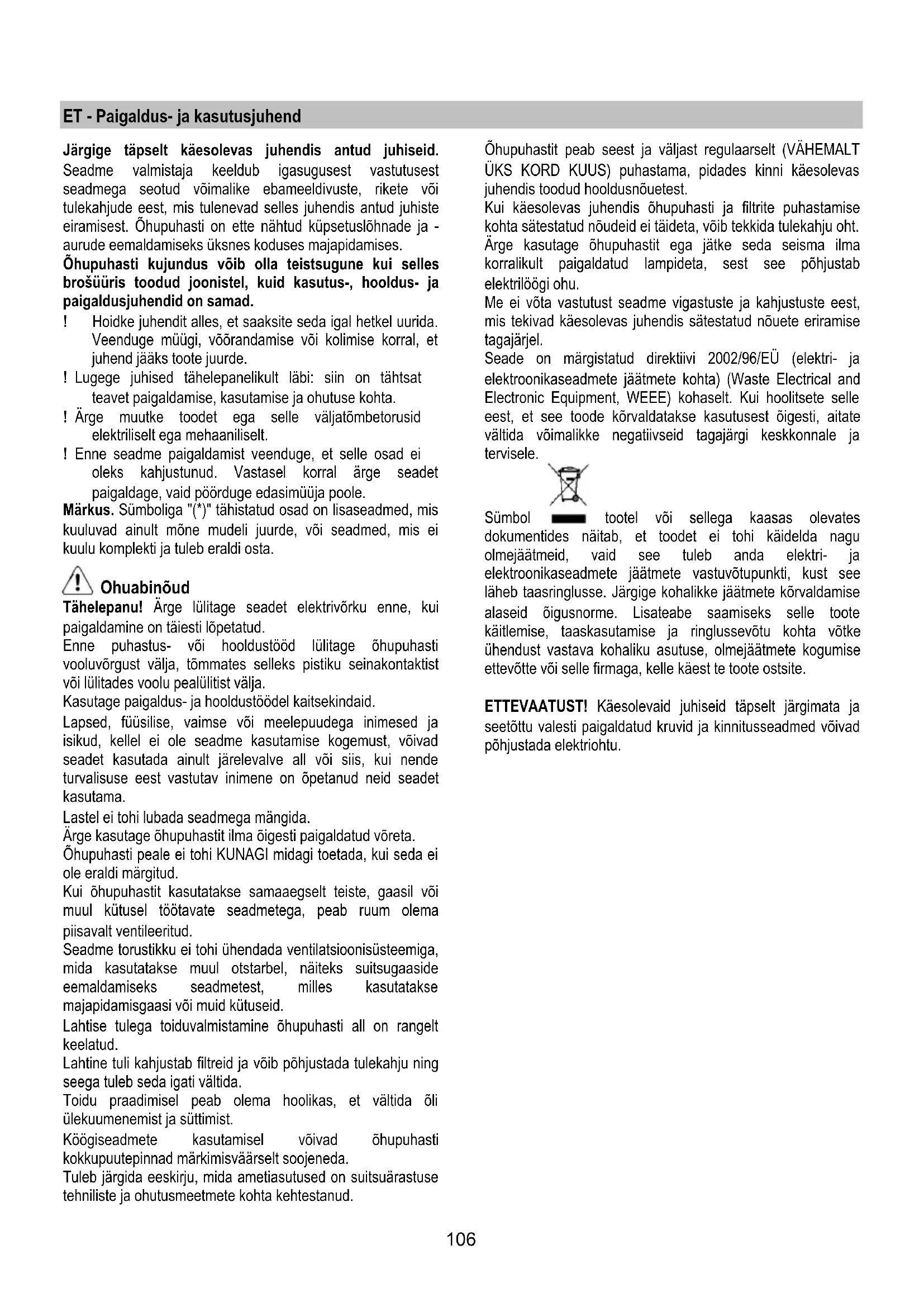 Зняти вугільний фільтр повертаючи ручки на 90° що фіксують його до ковпака. Заміна Ламп Витяжка обладнана системою освітлення на основі технології діодів (LED). ДІОДИ забезпечують оптимальне освітлення, тривалість їх в 10 раз вища від звичайних лампочок та дають 90% економії електроенергії. Щодо їх заміни звертайтеся до служби технічного обслуговування.106 ET - Paigaldus- ja kasutusjuhend Järgige täpselt käesolevas juhendis antud juhiseid. Seadme valmistaja keeldub igasugusest vastutusest seadmega seotud võimalike ebameeldivuste, rikete või tulekahjude eest, mis tulenevad selles juhendis antud juhiste eiramisest. Õhupuhasti on ette nähtud küpsetuslõhnade ja - aurude eemaldamiseks üksnes koduses majapidamises. Õhupuhasti kujundus võib olla teistsugune kui selles brošüüris toodud joonistel, kuid kasutus-, hooldus- ja paigaldusjuhendid on samad. ! Hoidke juhendit alles, et saaksite seda igal hetkel uurida. Veenduge müügi, võõrandamise või kolimise korral, et juhend jääks toote juurde. ! Lugege juhised tähelepanelikult läbi: siin on tähtsat teavet paigaldamise, kasutamise ja ohutuse kohta. ! Ärge muutke toodet ega selle väljatõmbetorusid elektriliselt ega mehaaniliselt. ! Enne seadme paigaldamist veenduge, et selle osad ei oleks kahjustunud. Vastasel korral ärge seadet paigaldage, vaid pöörduge edasimüüja poole. Märkus. Sümboliga "(*)" tähistatud osad on lisaseadmed, mis kuuluvad ainult mõne mudeli juurde, või seadmed, mis ei kuulu komplekti ja tuleb eraldi osta. Ohuabinõud Tähelepanu! Ärge lülitage seadet elektrivõrku enne, kui paigaldamine on täiesti lõpetatud. Enne puhastus- või hooldustööd lülitage õhupuhasti vooluvõrgust välja, tõmmates selleks pistiku seinakontaktist või lülitades voolu pealülitist välja. Kasutage paigaldus- ja hooldustöödel kaitsekindaid. Lapsed, füüsilise, vaimse või meelepuudega inimesed ja isikud, kellel ei ole seadme kasutamise kogemust, võivad seadet kasutada ainult järelevalve all või siis, kui nende turvalisuse eest vastutav inimene on õpetanud neid seadet kasutama. Lastel ei tohi lubada seadmega mängida. Ärge kasutage õhupuhastit ilma õigesti paigaldatud võreta. Õhupuhasti peale ei tohi KUNAGI midagi toetada, kui seda ei ole eraldi märgitud. Kui õhupuhastit kasutatakse samaaegselt teiste, gaasil või muul kütusel töötavate seadmetega, peab ruum olema piisavalt ventileeritud. Seadme torustikku ei tohi ühendada ventilatsioonisüsteemiga, mida kasutatakse muul otstarbel, näiteks suitsugaaside eemaldamiseks seadmetest, milles kasutatakse majapidamisgaasi või muid kütuseid. Lahtise tulega toiduvalmistamine õhupuhasti all on rangelt keelatud. Lahtine tuli kahjustab filtreid ja võib põhjustada tulekahju ning seega tuleb seda igati vältida. Toidu praadimisel peab olema hoolikas, et vältida õli ülekuumenemist ja süttimist. Köögiseadmete kasutamisel võivad õhupuhasti kokkupuutepinnad märkimisväärselt soojeneda. Tuleb järgida eeskirju, mida ametiasutused on suitsuärastuse tehniliste ja ohutusmeetmete kohta kehtestanud. Õhupuhastit peab seest ja väljast regulaarselt (VÄHEMALT ÜKS KORD KUUS) puhastama, pidades kinni käesolevas juhendis toodud hooldusnõuetest. Kui käesolevas juhendis õhupuhasti ja filtrite puhastamise kohta sätestatud nõudeid ei täideta, võib tekkida tulekahju oht. Ärge kasutage õhupuhastit ega jätke seda seisma ilma korralikult paigaldatud lampideta, sest see põhjustab elektrilöögi ohu. Me ei võta vastutust seadme vigastuste ja kahjustuste eest, mis tekivad käesolevas juhendis sätestatud nõuete eriramise tagajärjel. Seade on märgistatud direktiivi 2002/96/EÜ (elektri- ja elektroonikaseadmete jäätmete kohta) (Waste Electrical and Electronic Equipment, WEEE) kohaselt. Kui hoolitsete selle eest, et see toode kõrvaldatakse kasutusest õigesti, aitate vältida võimalikke negatiivseid tagajärgi keskkonnale ja tervisele. Sümbol tootel või sellega kaasas olevates dokumentides näitab, et toodet ei tohi käidelda nagu olmejäätmeid, vaid see tuleb anda elektri- ja elektroonikaseadmete jäätmete vastuvõtupunkti, kust see läheb taasringlusse. Järgige kohalikke jäätmete kõrvaldamise alaseid õigusnorme. Lisateabe saamiseks selle toote käitlemise, taaskasutamise ja ringlussevõtu kohta võtke ühendust vastava kohaliku asutuse, olmejäätmete kogumise ettevõtte või selle firmaga, kelle käest te toote ostsite. ETTEVAATUST! Käesolevaid juhiseid täpselt järgimata ja seetõttu valesti paigaldatud kruvid ja kinnitusseadmed võivad põhjustada elektriohtu.107 Kasutamine Õhupuhasti on valmistatud nii, et seda saaks kasutada nii väljatõmberežiimis kui ka õhku filtreeriva toasisese tsirkulatsiooniga režiimis. Väljatõmberežiim Aur viiakse välja ühendusääriku külge kinnitatud väljatõmbetoru abil. Väljatõmbetoru diameeter peab olema sama suur kui ühendusvõru oma. Tähelepanu! Väljatõmbetoru ei kuulu komplekti ja tuleb ise osta. Toru horisontaalne lõik peab olema kergelt ülespoole kaldu (umbes 10°), et õhku kergemini väliskeskkonda viia. Kui õhupuhastil on söefiltrid, tuleb need eemaldada. Ühendage õhupuhasti väljatõmbetorude ja seinal asuvate väljalaskeavadega, mille diameeter on võrdne õhupuhasti väljalaskeava (ühendusäärikuga) omaga. Peenemate torude ja väiksemate seinal asuvate väljalaskeavade kasutamisel väheneb tõmme ja suureneb oluliselt müra. Seetõttu ei võta meie sellisel juhul endale mingit vastutust. ! Kasutage minimaalse vajaliku pikkusega toru. ! Kasutage võimalikult väheste põlvedega toru (torupõlve maksimaalne nurk: 90°). ! Vältige toru ristlõike olulist muutumist. ! Kasutage võimalikul