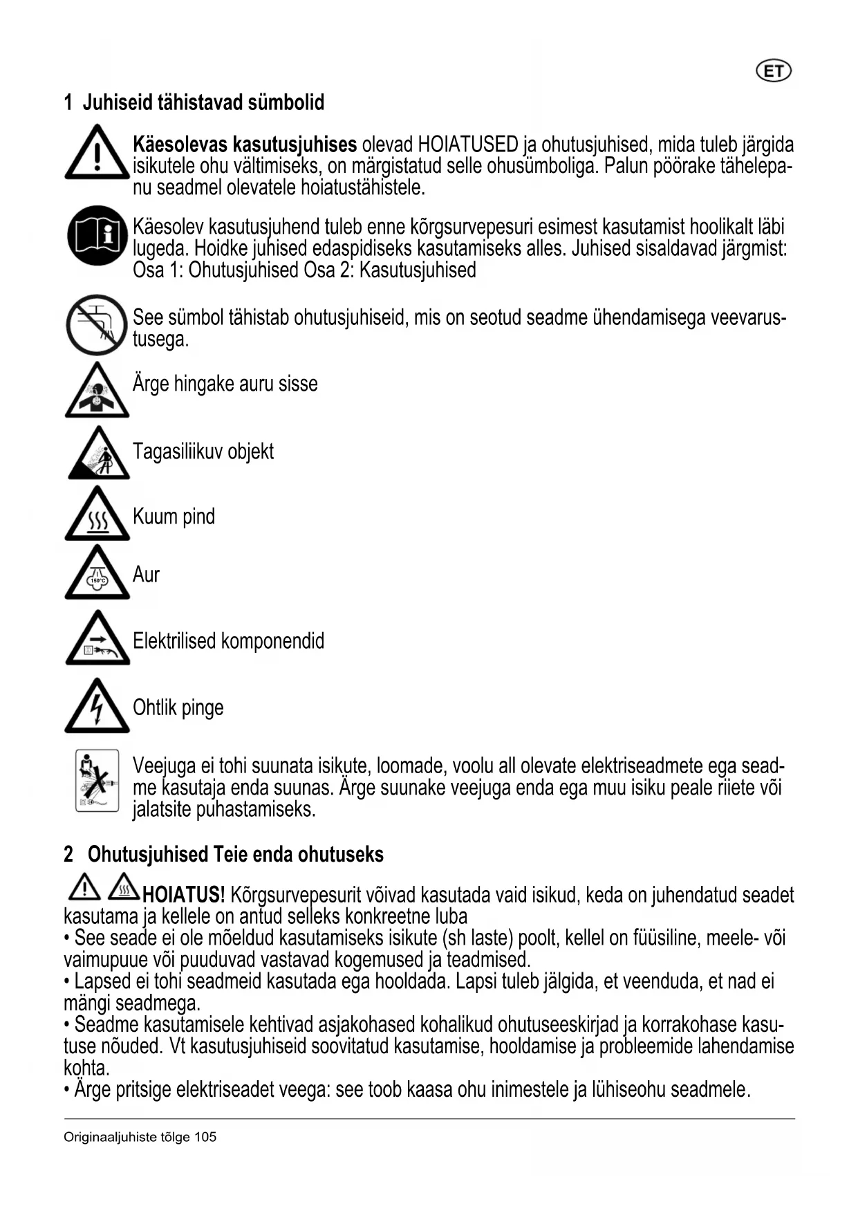 - В случае повреждения шнур питания должен быть заменён производителем, его сервис- ным агентом или специалистами с соответствующей квалификацией.Originaaljuhiste tõlge 105 1 Juhiseid tähistavad sümbolid Käesolevas kasutusjuhises olevad HOIATUSED ja ohutusjuhised, mida tuleb järgida isikutele ohu vältimiseks, on märgistatud selle ohusümboliga. Palun pöörake tähelepa- nu seadmel olevatele hoiatustähistele. Käesolev kasutusjuhend tuleb enne kõrgsurvepesuri esimest kasutamist hoolikalt läbi lugeda. Hoidke juhised edaspidiseks kasutamiseks alles. Juhised sisaldavad järgmist: Osa 1: Ohutusjuhised Osa 2: Kasutusjuhised See sümbol tähistab ohutusjuhiseid, mis on seotud seadme ühendamisega veevarus- tusega. Ärge hingake auru sisse Tagasiliikuv objekt Kuum pind Aur Elektrilised komponendid Ohtlik pinge Veejuga ei tohi suunata isikute, loomade, voolu all olevate elektriseadmete ega sead- me kasutaja enda suunas. Ärge suunake veejuga enda ega muu isiku peale riiete või jalatsite puhastamiseks. 2 Ohutusjuhised Teie enda ohutuseks HOIATUS! Kõrgsurvepesurit võivad kasutada vaid isikud, keda on juhendatud seadet kasutama ja kellele on antud selleks konkreetne luba