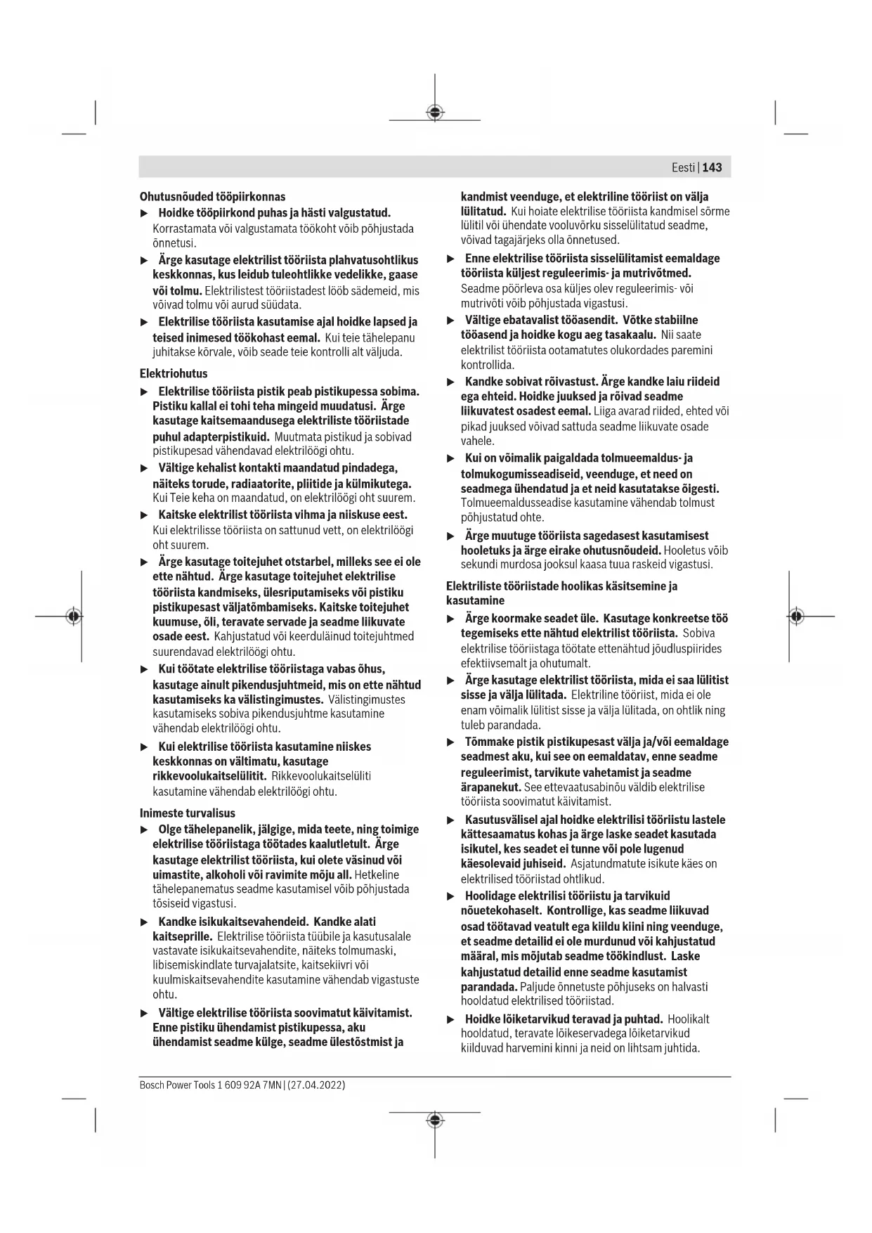 Servisna služba i savjeti o uporabi Naša servisna služba će odgovoriti na vaša pitanja o popravku i održavanju vašeg proizvoda, kao i o rezervnim dijelovima. Crteže u rastavljenom obliku i informacije o rezervnim dijelovima možete naći i na našoj adresi: www.bosch-pt.com Tim Bosch savjetnika o uporabi rado će odgovoriti na vaša pitanja o našim proizvodima i njihovom priboru. U slučaju upita ili naručivanja rezervnih dijelova, molimo vas obavezno navedite 10‑znamenkasti kataloški broj s tipske pločice proizvoda. Hrvatski Robert Bosch d.o.o PT/SHR-BSC Kneza Branimira 22 10040 Zagreb Tel.: +385 12 958 051 Fax: +385 12 958 050 E-Mail: RBKN-bsc@hr.bosch.com www.bosch.hr Ostale adrese servisa možete pronaći na: www.bosch-pt.com/serviceaddresses Zbrinjavanje Električne alate, pribor i ambalažu treba dovesti na ekološki prihvatljivo recikliranje. Električne alate ne bacajte u kućni otpad! Samo za zemljeEU: Sukladno europskoj Direktivi 2012/19/EU za električne i elektroničke stare uređaje električni alati, koji više nisu uporabivi, moraju se odvojeno sakupljati i dovesti na ekološki prihvatljivo recikliranje. U slučaju nepravilnog zbrinjavanja električni i elektronički stari uređaji mogu imati štetne učinke na okoliš i ljudsko zdravlje zbog moguće prisutnosti opasnih tvari. Eesti Ohutusnõuded Üldised ohutusnõuded elektriliste tööriistade kasutamisel HOIATUS Lugege läbi kõik tööriistaga kaasas olevad ohutusnõuded ja juhised ning tutvuge kõigi jooniste ja spetsifikatsioonidega. Ohutusnõuete ja juhiste eiramise tagajärjeks võib olla elektrilöök, tulekahju ja/või rasked vigastused. Hoidke kõik ohutusnõuded ja juhised edasiseks kasutamiseks hoolikalt alles. Ohutusnõuetes sisalduv mõiste "elektriline tööriist" käib nii vooluvõrku ühendatud (juhtmega) elektriliste tööriistade kui ka akutoitega (juhtmeta) elektriliste tööriistade kohta. 1 609 92A 7MN | (27.04.2022) Bosch Power ToolsEesti | 143 Ohutusnõuded tööpiirkonnas u Hoidke tööpiirkond puhas ja hästi valgustatud. Korrastamata või valgustamata töökoht võib põhjustada õnnetusi. u Ärge kasutage elektrilist tööriista plahvatusohtlikus keskkonnas, kus leidub tuleohtlikke vedelikke, gaase või tolmu. Elektrilistest tööriistadest lööb sädemeid, mis võivad tolmu või aurud süüdata. u Elektrilise tööriista kasutamise ajal hoidke lapsed ja teised inimesed töökohast eemal. Kui teie tähelepanu juhitakse kõrvale, võib seade teie kontrolli alt väljuda. Elektriohutus u Elektrilise tööriista pistik peab pistikupessa sobima. Pistiku kallal ei tohi teha mingeid muudatusi. Ärge kasutage kaitsemaandusega elektriliste tööriistade puhul adapterpistikuid. Muutmata pistikud ja sobivad pistikupesad vähendavad elektrilöögi ohtu. u Vältige kehalist kontakti maandatud pindadega, näiteks torude, radiaatorite, pliitide ja külmikutega. Kui Teie keha on maandatud, on elektrilöögi oht suurem. u Kaitske elektrilist tööriista vihma ja niiskuse eest. Kuielektrilisse tööriista on sattunud vett, on elektrilöögi oht suurem. u Ärge kasutage toitejuhet otstarbel, milleks see ei ole ette nähtud. Ärge kasutage toitejuhet elektrilise tööriista kandmiseks, ülesriputamiseks või pistiku pistikupesast väljatõmbamiseks. Kaitske toitejuhet kuumuse, õli, teravate servade ja seadme liikuvate osade eest. Kahjustatud või keerduläinud toitejuhtmed suurendavad elektrilöögi ohtu. u Kui töötate elektrilise tööriistaga vabas õhus, kasutage ainult pikendusjuhtmeid, mis on ette nähtud kasutamiseks ka välistingimustes. Välistingimustes kasutamiseks sobiva pikendusjuhtme kasutamine vähendab elektrilöögi ohtu. u Kui elektrilise tööriista kasutamine niiskes keskkonnas on vältimatu, kasutage rikkevoolukaitselülitit. Rikkevoolukaitselüliti kasutamine vähendab elektrilöögi ohtu. Inimeste turvalisus u Olge tähelepanelik, jälgige, mida teete, ning toimige elektrilise tööriistaga töötades kaalutletult. Ärge kasutage elektrilist tööriista, kui olete väsinud või uimastite, alkoholi või ravimite mõju all. Hetkeline tähelepanematus seadme kasutamisel võib põhjustada tõsiseid vigastusi. u Kandke isikukaitsevahendeid. Kandke alati kaitseprille. Elektrilise tööriista tüübile ja kasutusalale vastavate isikukaitsevahendite, näiteks tolmumaski, libisemiskindlate turvajalatsite, kaitsekiivri või kuulmiskaitsevahendite kasutamine vähendab vigastuste ohtu. u Vältige elektrilise tööriista soovimatut käivitamist. Enne pistiku ühendamist pistikupessa, aku ühendamist seadme külge, seadme ülestõstmist ja kandmist veenduge, et elektriline tööriist on välja lülitatud. Kui hoiate elektrilise tööriista kandmisel sõrme lülitil või ühendate vooluvõrku sisselülitatud seadme, võivad tagajärjeks olla õnnetused. u Enne elektrilise tööriista sisselülitamist eemaldage tööriista küljest reguleerimis- ja mutrivõtmed. Seadme pöörleva osa küljes olev reguleerimis- või mutrivõti võib põhjustada vigastusi. u Vältige ebatavalist tööasendit. Võtke stabiilne tööasend ja hoidke kogu aeg tasakaalu. Nii saate elektrilist tööriista ootamatutes olukordades paremini kontrollida. u Kandke sobivat rõivastust. Ärge kandke laiu riideid ega ehteid. Hoidke juuksed ja rõivad seadme liikuvatest osadest eemal. Liiga avarad riided, ehted või pikad juuksed võivad sattuda seadme liikuvate osade vahele. u Kui on võimalik paigaldada tolmueemaldus- ja tolmukogumisseadiseid, veenduge, etneed on seadmega ühendatud ja et neid kasutatakse õigesti. Tolmueemaldusseadise kasutamine vähendab tolmust põhjustatud ohte. u Ärge muutuge tööriista sagedasest kasutamisest hooletuks ja ärge eirake ohutusnõudeid. Hooletus võib sekundi murdosa jooksul kaasa tuua raskeid vigastusi. Elektriliste tööriistade hoolikas käsitsemine ja kasutamine u Ärge koormake seadet üle. Kasutage konkreetse töö tegemiseks ette nähtud elektrilist tööriista. Sobiva elektri