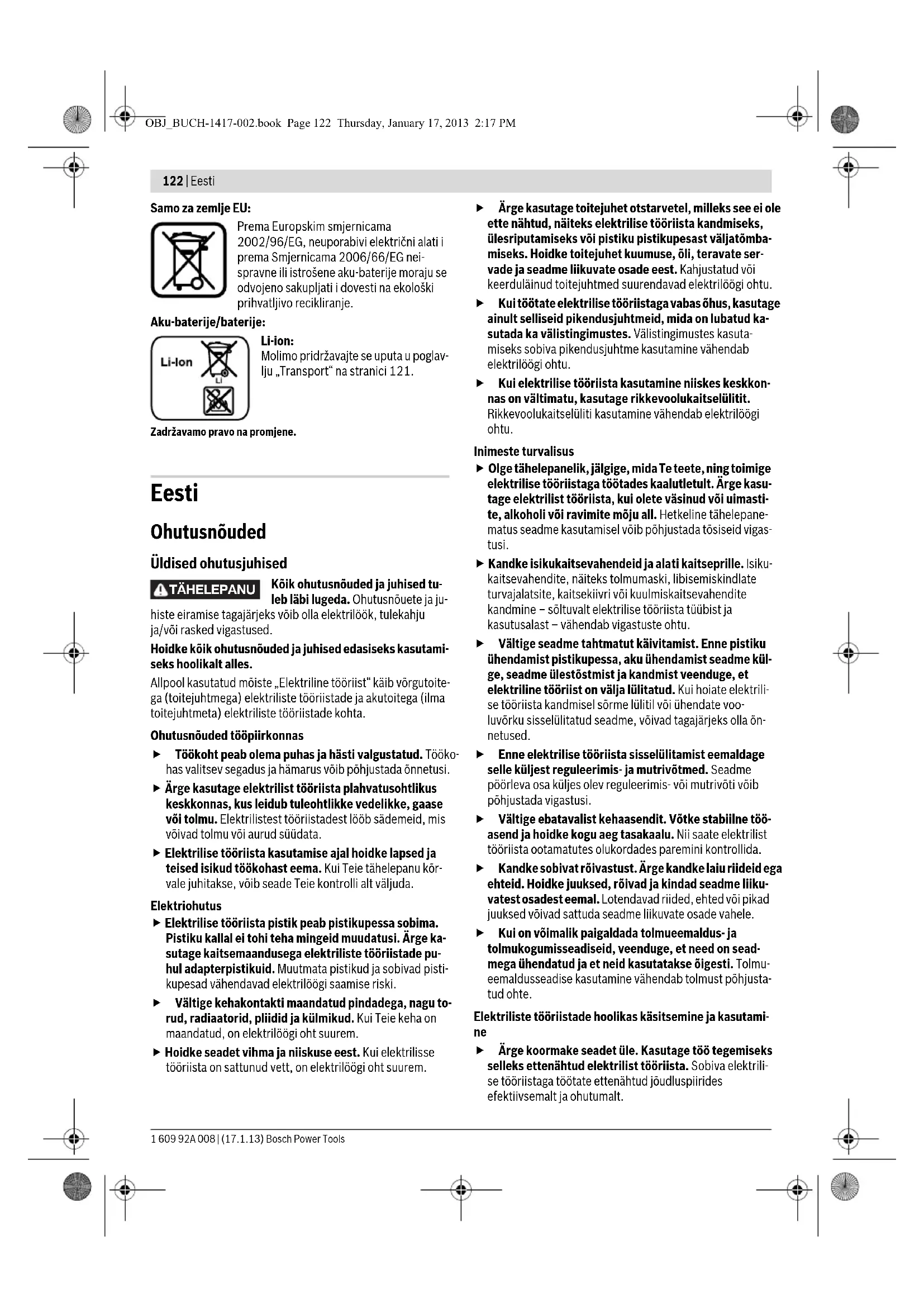 Ärge koormake seadet üle. Kasutage töö tegemiseks selleks ettenähtud elektrilist tööriista. Sobiva elektrili- se tööriistaga töötate ettenähtud jõudluspiirides efektiivsemalt ja ohutumalt. TÄHELEPANU OBJ_BUCH-1417-002.book Page 122 Thursday, January 17, 2013 2:17 PMEesti | 123 Bosch Power Tools 1 609 92A 008 | (17.1.13) Ärge kasutage elektrilist tööriista, mille lüliti on rikkis. Elektriline tööriist, mida ei ole enam võimalik lülitist sisse ja välja lülitada, on ohtlik ning tuleb parandada. Tõmmake pistik pistikupesast välja ja/või eemaldage seadmest aku enne seadme reguleerimist, tarvikute vahetamist ja seadme ärapanekut. See ettevaatus- abinõu väldib elektrilise tööriista soovimatut käivitamist. Kasutusvälisel ajal hoidke elektrilisi tööriistu lastele kättesaamatus kohas. Ärge laske seadet kasutada isi- kutel, kes seadet ei tunne või pole siintoodud juhiseid lugenud. Asjatundmatute isikute käes on elektrilised töö- riistad ohtlikud. Hoolitsege seadme eest korralikult. Kontrollige, kas seadme liikuvad osad töötavad veatult ega kiildu kiini. Veenduge, et seadme detailid ei ole murdunud või kah- justatud määral, mis mõjutab seadme töökindlust. Las- ke kahjustatud detailid enne seadme kasutamist parandada. Paljude õnnetuste põhjuseks on halvasti hool- datud elektrilised tööriistad. Hoidke lõiketarvikud teravad ja puhtad. Hoolikalt hool- datud, teravate lõikeservadega lõiketarvikud kiilduvad harvemini kinni ja neid on lihtsam juhtida. Kasutage elektrilist tööriista, lisavarustust, tarvikuid jne vastavalt siintoodud juhistele ning nii, nagu konk- reetse seadmetüübi jaoks ette nähtud. Arvestage see- juures töötingimuste ja teostatava töö iseloomuga. Elektriliste tööriistade nõuetevastane kasutamine võib põhjustada ohtlikke olukordi. Akutööriistade hoolikas käsitsemine ja kasutamine Laadige akusid ainult tootja poolt soovitatud akulaadi- jatega. Akulaadija, mis sobib teatud tüüpi akudele, muu- tub tuleohtlikuks, kui seda kasutatakse teiste akudega. Kasutage elektrilistes tööriistades ainult selleks ette- nähtud akusid. Teiste akude kasutamine võib põhjustada vigastusi ja tulekahjuohtu. Hoidke kasutusel mitteolevad akud eemal kirjaklamb- ritest, müntidest, võtmetest, naeltest, kruvidest või teistest väikestest metallesemetest, mis võivad kon- taktid omavahel ühendada. Akukontaktide vahel tekkiva lühise tagajärjeks võivad olla põletused või tulekahju. Väärkasutuse korral võib akuvedelik välja voolata. Väl- tige sellega kokkupuudet. Juhusliku kokkupuute kor- ral loputage kahjustatud kohta veega. Kui vedelik sa- tub silma, pöörduge lisaks arsti poole. Väljavoolav aku- vedelik võib põhjustada nahaärritusi või põletusi. Teenindus Laske elektrilist tööriista parandada ainult kvalifitsee- ritud spetsialistidel, kes kasutavad originaalvaruosi. Nii tagate püsivalt seadme ohutu töö. Ohutusnõuded aku-universaallõikuri kasutamisel Asbestisisaldava materjali töötlemine on keelatud. As- best võib tekitada vähki. Lõikamisel pöörake tähelepanu pingestatud elektri- juhtmetele. Vigastuste oht. Lõikamisel ärge viige kunagi oma käsi lõiketera ette. Vi- gastuste oht. Vältige juhuslikku sisselülitamist. Kui hoiate elektrilise tööriista transportimisel sõrme lülitil (sisse/välja), võivad tagajärjeks olla õnnetused. Ärge avage akut. Esineb lühise oht. Kaitske akut kuumuse, sealhulgas pideva päikese- kiirguse eest, samuti vee, tule ja niiskuse eest. Esi- neb plahvatusoht. Aku vigastamisel ja ebaõigel käsitsemisel võib akust eralduda aure. Õhutage ruumi, halva enesetunde kor- ral pöörduge arsti poole. Aurud võivad ärritada hingamis- teid. Kasutage akut üksnes koos Boschi elektrilise tööriista- ga. Ainult nii on aku kaitstud ohtliku ülekoormuse eest. Kasutage üksnes Boschi originaalakusid, mille pinge vastab elektrilise tööriista andmesildil toodud pingele. Muude akude, nt järeletehtud või parandatud akude või teiste tootjate akude kasutamine põhjustab plahvatus- ja varalise kahju ohu. Seadme ja selle funktsioonide kirjel- dus Kõik ohutusnõuded ja juhised tuleb läbi lu- geda. Ohutusnõuete ja juhiste eiramise taga- järjeks võib olla elektrilöök, tulekahju ja/või rasked vigastused. Avage kokkuvolditud lehekülg, millel on toodud joonised sead- me kohta, ja jätke see kasutusjuhendi lugemise ajaks lahti. Nõuetekohane kasutamine Elektriline tööriist on ette nähtud elastsete, pehmete materja- lide lõikamiseks, mille paksus on 11 mm, näiteks vaipkate, PVC, papp, nahk, tekstiil jm materjalid. Seade sobib sirg- ja figuurlõigete tegemiseks. Seadme osad Seadme osade numeratsiooni aluseks on jooniste lehekülge- del toodud numbrid. 1 Rihveldatud kruvi 2 Lõikejoone märgistus „Cut Control“ 3 Reguleeritav kaitseplekk (2 –11 mm) 4 Lüliti (sisse/välja) 5 Käepide (isoleeritud haardepind) 6 Aku 7 Aku vabastusklahv 8 Laetuse astme kuvamise klahv 9 Aku täituvusastme indikaator 10 Lõiketera 11 Kruvi tera kinnitamiseks 12 Juhtjalas Tarnekomplekt ei sisalda kõiki kasutusjuhendis olevatel joonistel kujutatud või kasutusjuhendis nimetatud lisatarvikuid. Lisatarvi- kute täieliku loetelu leiate meie lisatarvikute kataloogist. OBJ_BUCH-1417-002.book Page 123 Thursday, January 17, 2013 2:17 PM124 | Eesti 1 609 92A 008 | (17.1.13) Bosch Power Tools Tehnilised andmed Andmed müra/vibratsiooni kohta Müra mõõdetud vastavalt standardile EN 60745. Seadme A-karakteristikuga mõõdetud helirõhu tase on väi- ksem kui 70 dB(A). Mõõtemääramatus K =3 dB. Müratase võib töötamisel ületada 80 dB(A). Kandke kuulmiskaitsevahendeid! Vibratsioonitase a