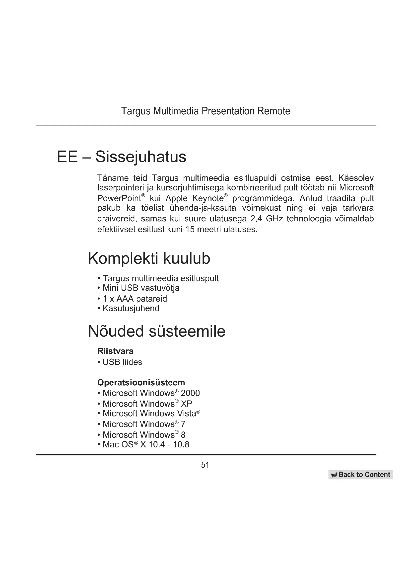 X 10.4 - 10.8 EE – Sissejuhatus Täname teid Targus multimeedia esitluspuldi ostmise eest. Käesolev laserpointeri ja kursorjuhtimisega kombineeritud pult töötab nii Microsoft PowerPoint