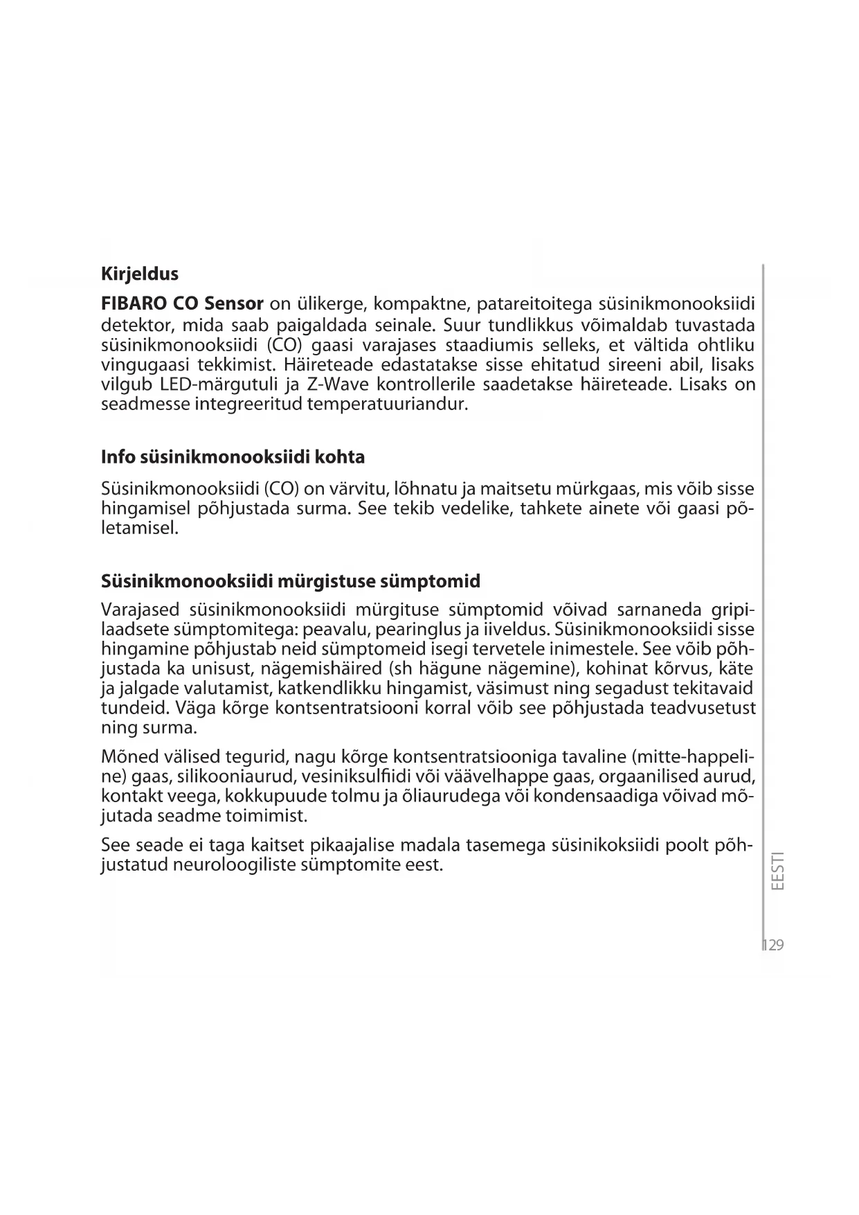 та Устройства. Производитель не несет ответственности за случайные, специальные, косвенные убытки или за моральный ущерб, включая, среди прочего, потерю прибыли, сбережений, данных, потерю льгот, претензии со стороны третьих лиц или другие убытки, возникающие из или связанные с использованием Устройства. РУССКИЙ129 Kirjeldus FIBARO CO Sensor on ülikerge, kompaktne, patareitoitega süsinikmonooksiidi detektor, mida saab paigaldada seinale. Suur tundlikkus võimaldab tuvastada süsinikmonooksiidi (CO) gaasi varajases staadiumis selleks, et vältida ohtliku vingugaasi tekkimist. Häireteade edastatakse sisse ehitatud sireeni abil, lisaks vilgub LED-märgutuli ja Z-Wave kontrollerile saadetakse häireteade. Lisaks on seadmesse integreeritud temperatuuriandur. Info süsinikmonooksiidi kohta Süsinikmonooksiidi (CO) on värvitu, lõhnatu ja maitsetu mürkgaas, mis võib sisse hingamisel põhjustada surma. See tekib vedelike, tahkete ainete või gaasi põ- letamisel. Süsinikmonooksiidi mürgistuse sümptomid Varajased süsinikmonooksiidi mürgituse sümptomid võivad sarnaneda gripi- laadsete sümptomitega: peavalu, pearinglus ja iiveldus. Süsinikmonooksiidi sisse hingamine põhjustab neid sümptomeid isegi tervetele inimestele. See võib põh- justada ka unisust, nägemishäired (sh hägune nägemine), kohinat kõrvus, käte ja jalgade valutamist, katkendlikku hingamist, väsimust ning segadust tekitavaid tundeid. Väga kõrge kontsentratsiooni korral võib see põhjustada teadvusetust ning surma. Mõned välised tegurid, nagu kõrge kontsentratsiooniga tavaline (mitte-happeli- ne) gaas, silikooniaurud, vesiniksulidi või väävelhappe gaas, orgaanilised aurud, kontakt veega, kokkupuude tolmu ja õliaurudega või kondensaadiga võivad mõ- jutada seadme toimimist. See seade ei taga kaitset pikaajalise madala tasemega süsinikoksiidi poolt põh- justatud neuroloogiliste sümptomite eest. EESTI130 Hoiatused Kui kasutusjuhendis toodud juhiseid ei järgita, võib see põhjustada seadme rik- nemist või ohtu elule ja tervisele. Tootja, Fibar Group S.A. ei vastuta kahjude eest juhul kui kasutusjuhendis toodud juhiseid ei ole järgitud. Seadme blokeerimine võib põhjustada selle riknemise. Seade tuleb paigaldada laest allapoole. Seade ei tohi paigaldada vannituppa, soojusallikate vahetusse lähedusse, laste käeulatusse, süsinikmonooksiidi levimist takistavatesse kohtadesse või otsese päikesevalguse kätte. Seade ei asenda asjakohaseid ventilatsiooni- ja heitgaasi süsteeme. Ärge värvige seadet. Seadet tuleb puhastada kergelt niiske lapiga või paberrätikuga. Asendage seade kui seadmel toodud viimane kasutuskuupäev on möödunud või anduri rikke korral. See toode ei ole mänguasi. Hoida lastele ja loomadele kättesaamatus kohas! ETTEVAATUST: plahvatusoht kui aku asendatakse vale tüüpi akuga. Utiliseerige kasutatud akud vastavalt juhistele. ETTEVAATUST: Seadmed ei pruugi vältida süsinikmonooksiidiga kokkupuute kroonilisi mõjusid. Seade ei kaitse täielikult erilise ohu all olevaid isikuid. Kaughäire vaigistamise funktsiooni tuleks kasutada ainult seadme nägemisula- tuses. Kui on kahtlusi häire põhjuse osas, tuleb eeldada, et häire on tingitud ohtlikust süsinikmonooksiidi tasemest, ja eluruum tuleb evakueerida. Paigalduskoha valik (lk 4) Paigaldage seade seinale, vähemalt 30 cm kaugusele nurgast. Soovitatav paigalduskõrgus sõltub ruumi kasutuseesmärgist ja lae kõrgusest. EESTI131 EESTI Paigaldamine (lk 6, 7)
