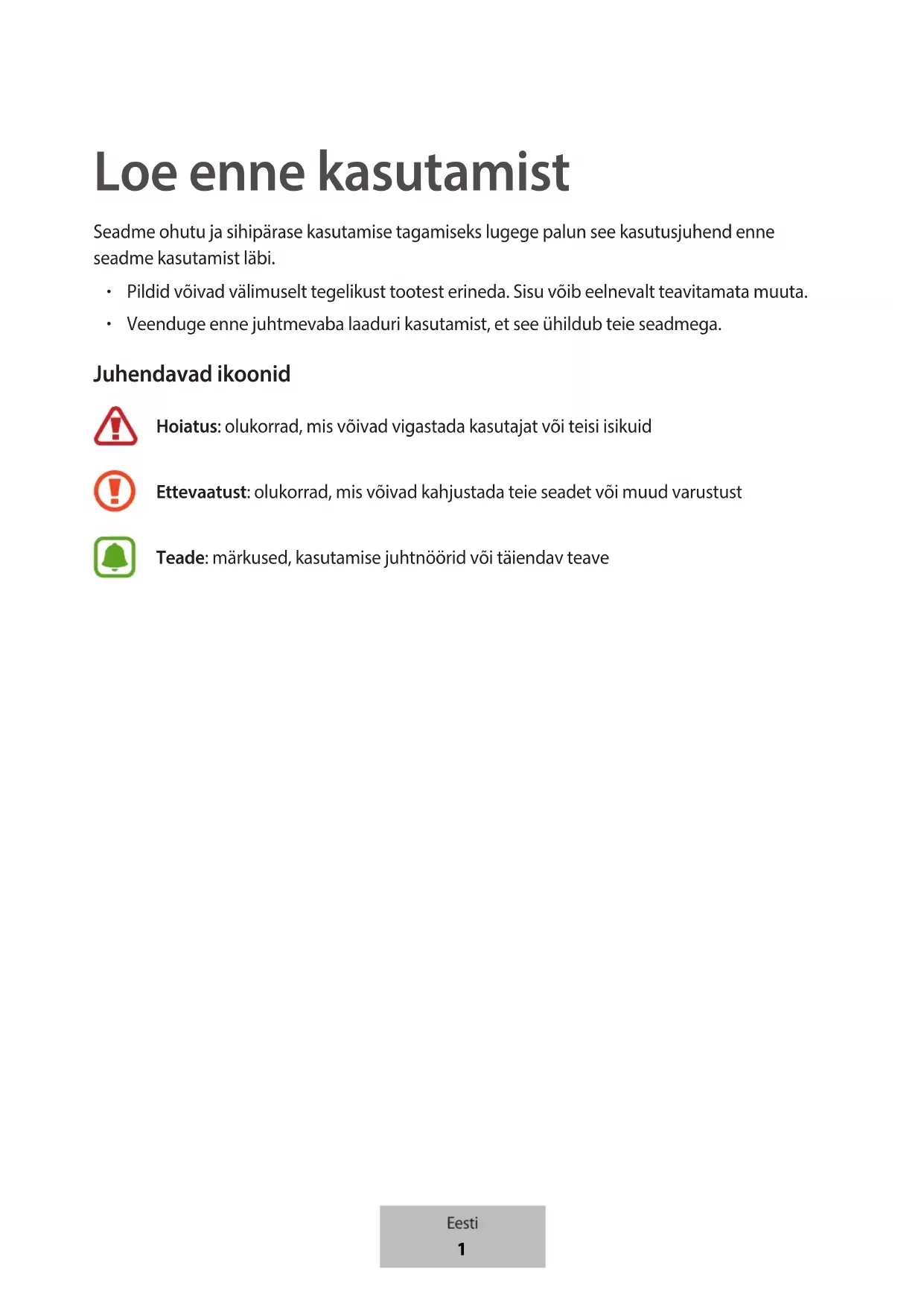 Loe enne kasutamist Seadme ohutu ja sihipärase kasutamise tagamiseks lugege palun see kasutusjuhend enne seadme kasutamist läbi.