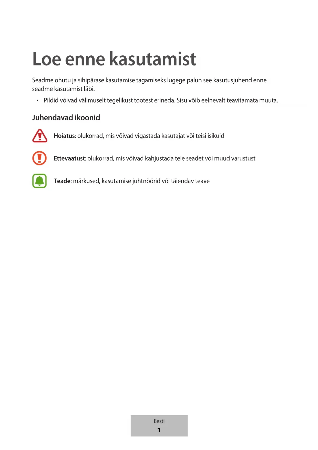 Pildid võivad välimuselt tegelikust tootest erineda. Sisu võib eelnevalt teavitamata muuta. Juhendavad ikoonid Hoiatus: olukorrad, mis võivad vigastada kasutajat või teisi isikuid Ettevaatust: olukorrad, mis võivad kahjustada teie seadet või muud varustust Teade: märkused, kasutamise juhtnöörid või täiendav teave Eesti