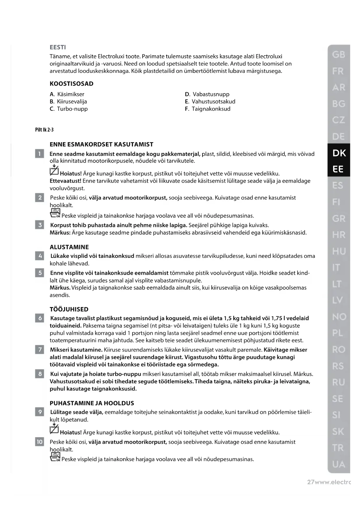 EESTI Täname, et valisite Electroluxi toote. Parimate tulemuste saamiseks kasutage alati Electroluxi originaaltarvikuid ja -varuosi. Need on loodud spetsiaalselt teie tootele. Antud toote loomisel on arvestatud looduskeskkonnaga. Kõik plastdetailid on ümbertöötlemist lubava märgistusega. KOOSTISOSAD A. Käsimikser B. Kiirusevalija C. Turbo-nupp D. Vabastusnupp E. Vahustusotsakud F. Taignakonksud Pilt lk 2-3