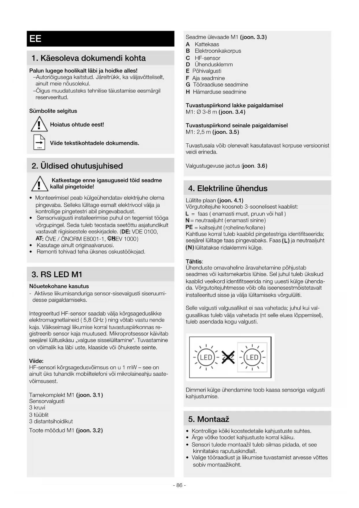 Nõuetekohane kasutus - Aktiivse liikumisanduriga sensor-sisevalgusti siseruumi- desse paigaldamiseks. Integreeritud HF-sensor saadab välja kõrgsageduslikke elektromagnetlaineid ( 5,8 GHz ) ning võtab vastu nende kaja. Väikseimagi liikumise korral tuvastuspiirkonnas re- gistreerib sensor kaja muutused. Mikroprotsessor käivitab seejärel lülituskäsu „valguse sisselülitamine“. Tuvastamine on võimalik ka läbi uste, klaaside või õhukeste seinte. Viide: HF-sensori kõrgsagedusvõimsus on u 1 mW – see on ainult üks tuhandik mobiiltelefoni või mikrolaineahju saate- võimsusest. Tarnekomplekt M1 ( joon.3.1 ) Sensorvalgusti 3 kruvi 3 tüüblit 3 distantsihoidikut Toote mõõdud M1 ( joon.3.2 ) !- 87 - Montaažisammud
