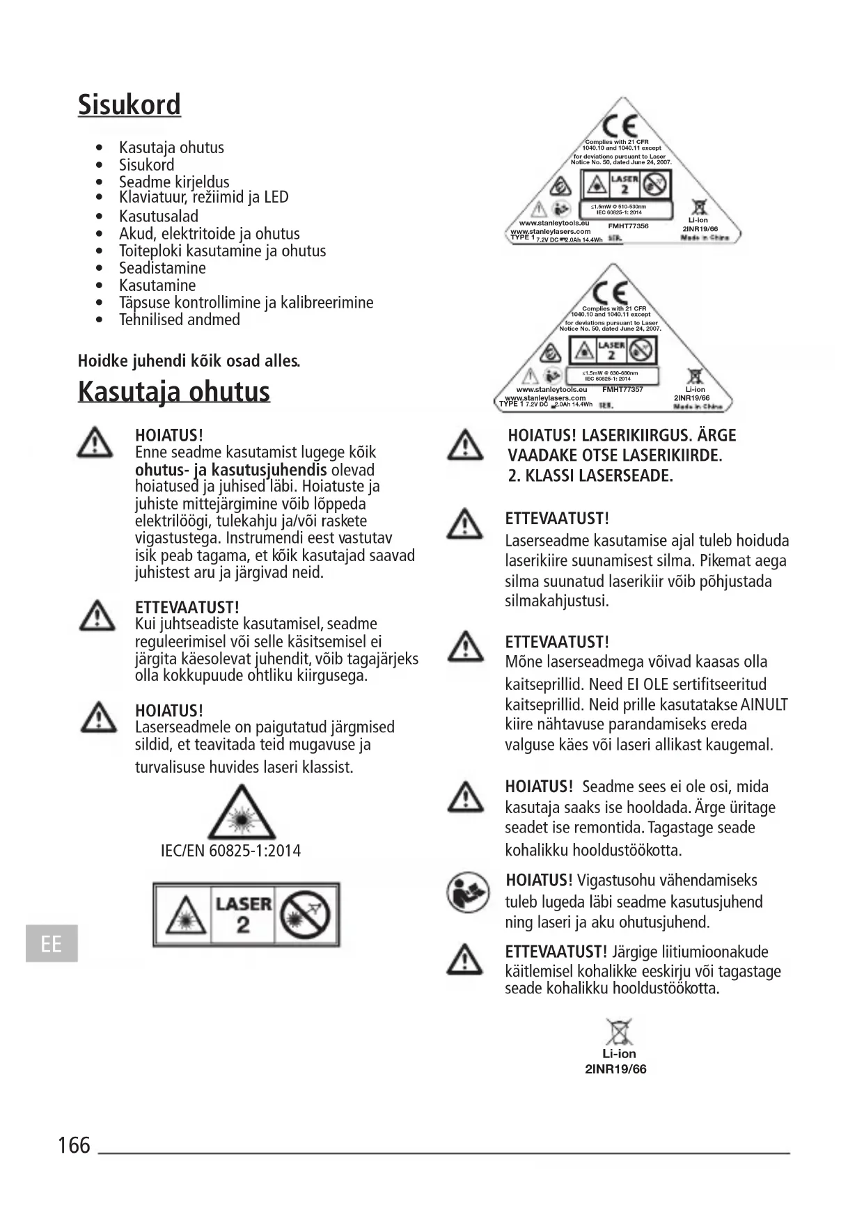 - Laserseadet ei saa hooldada kasutaja ise. Rikke või kahjustuse korral tuleb see toimetada kohaliku edasimüüja kätte või Stanley garantiiteenindusse/hooldustöökotta. Seadet tohib hooldada ainult pädev hooldustehnik, kes kasutab ainult identseid varuosi. See kindlustab seadme ohutuse.169