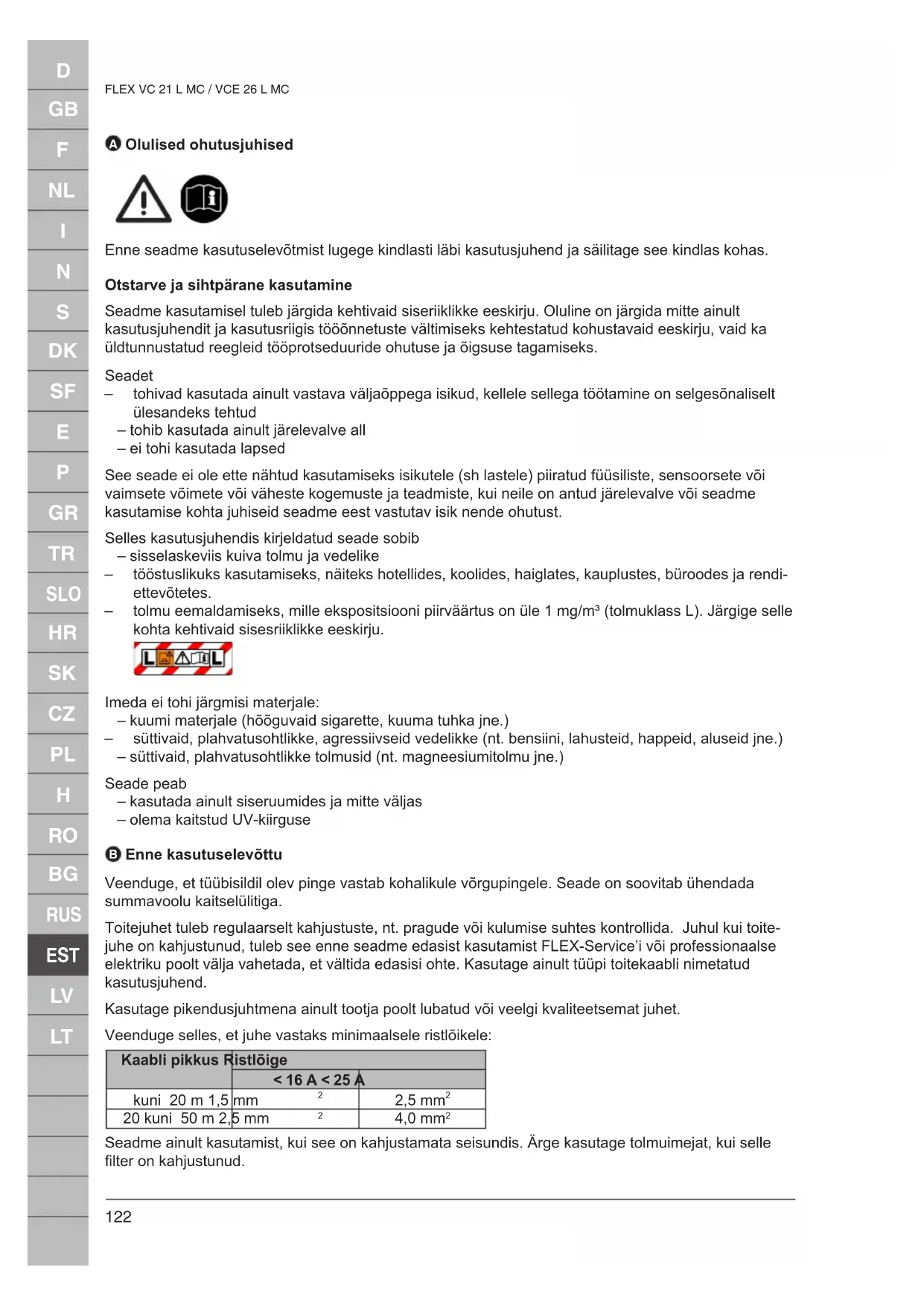 FLEX VC 21 L MC / VCE 26 L MC Tolmu eemaldamisel peab ruumis olema piisav õhuvahetus sel juhul, kui seadmest väljuv õhk juhitak- se tagasi ruumi (järgige selle kohta kehtivaid sisesriiklikke eeskirju). Seadme kasutajaid tuleb enne töö alustamist informeerida – seadme käsitsemisest – imetavast materjalist tulenevatest ohtudest – imetava materjali turvalisest käitlemisest
