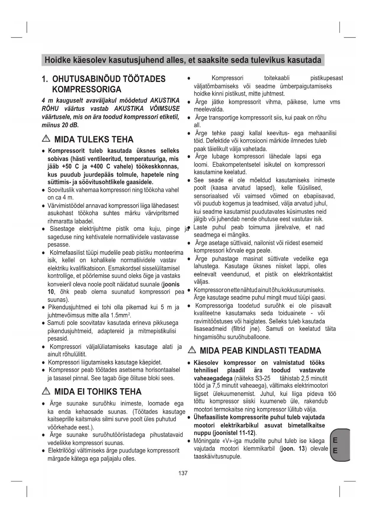 - Arge lubage kompressori lahedale lapsi ega loomi. Ebakompetentsetel isikutel on kompressori kasutamine keelatud.
