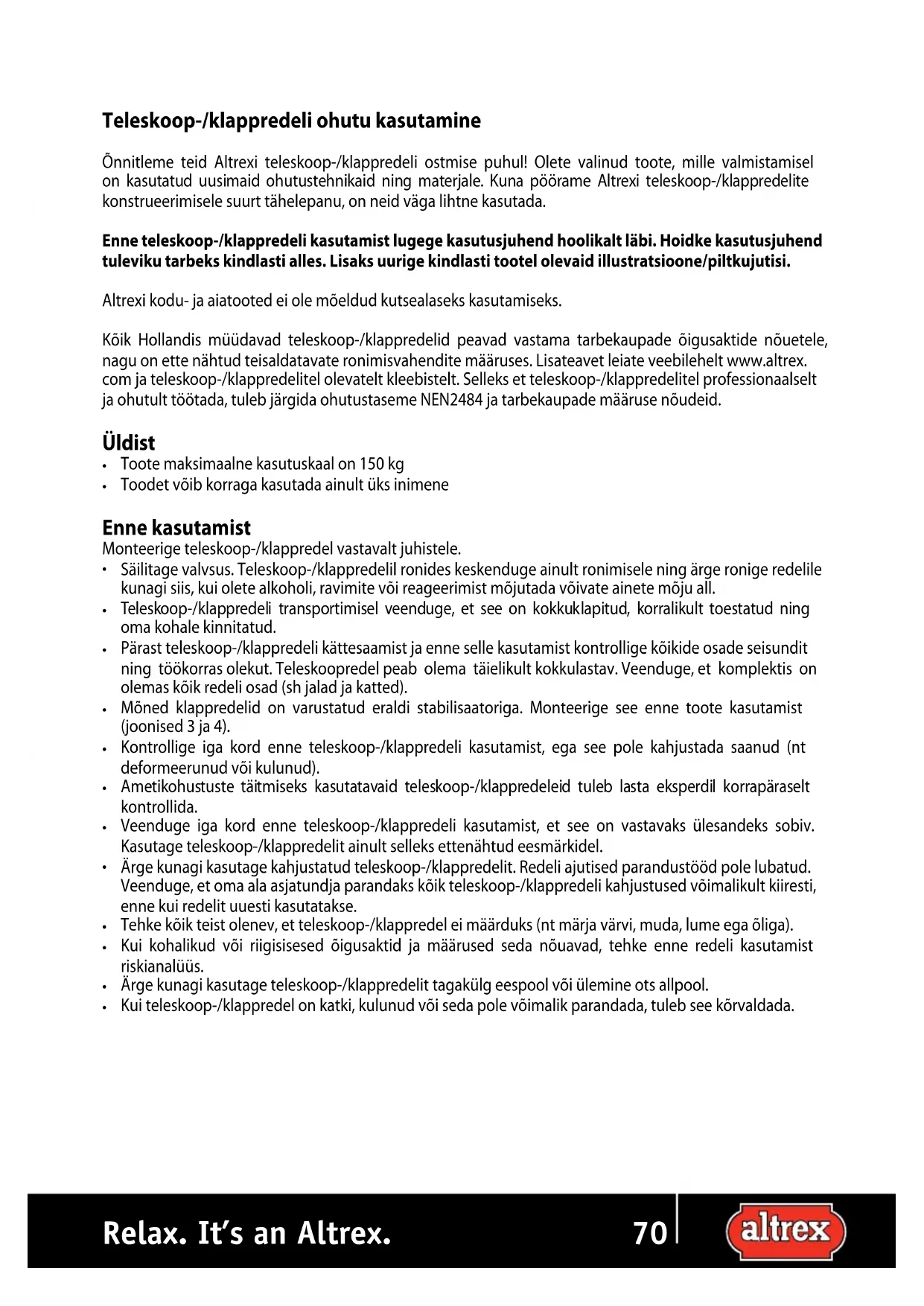 b.70 71 Relax. It’s an Altrex. Teleskoop-/klappredeli ohutu kasutamine Õnnitleme teid Altrexi teleskoop-/klappredeli ostmise puhul! Olete valinud toote, mille valmistamisel on kasutatud uusimaid ohutustehnikaid ning materjale. Kuna pöörame Altrexi teleskoop-/klappredelite konstrueerimisele suurt tähelepanu, on neid väga lihtne kasutada. Enne teleskoop-/klappredeli kasutamist lugege kasutusjuhend hoolikalt läbi. Hoidke kasutusjuhend tuleviku tarbeks kindlasti alles. Lisaks uurige kindlasti tootel olevaid illustratsioone/piltkujutisi. Altrexi kodu- ja aiatooted ei ole mõeldud kutsealaseks kasutamiseks. Kõik Hollandis müüdavad teleskoop-/klappredelid peavad vastama tarbekaupade õigusaktide nõuetele, nagu on ette nähtud teisaldatavate ronimisvahendite määruses. Lisateavet leiate veebilehelt www.altrex. com ja teleskoop-/klappredelitel olevatelt kleebistelt. Selleks et teleskoop-/klappredelitel professionaalselt ja ohutult töötada, tuleb järgida ohutustaseme NEN2484 ja tarbekaupade määruse nõudeid. Üldist Toote maksimaalne kasutuskaal on 150 kg Toodet võib korraga kasutada ainult üks inimene Enne kasutamist Monteerige teleskoop-/klappredel vastavalt juhistele. Säilitage valvsus. Teleskoop-/klappredelil ronides keskenduge ainult ronimisele ning ärge ronige redelile kunagi siis, kui olete alkoholi, ravimite või reageerimist mõjutada võivate ainete mõju all. Teleskoop-/klappredeli transportimisel veenduge, et see on kokkuklapitud, korralikult toestatud ning oma kohale kinnitatud. Pärast teleskoop-/klappredeli kättesaamist ja enne selle kasutamist kontrollige kõikide osade seisundit ning töökorras olekut. Teleskoopredel peab olema täielikult kokkulastav. Veenduge, et komplektis on olemas kõik redeli osad (sh jalad ja katted). Mõned klappredelid on varustatud eraldi stabilisaatoriga. Monteerige see enne toote kasutamist (joonised 3 ja 4). Kontrollige iga kord enne teleskoop-/klappredeli kasutamist, ega see pole kahjustada saanud (nt deformeerunud või kulunud). Ametikohustuste täitmiseks kasutatavaid teleskoop-/klappredeleid tuleb lasta eksperdil korrapäraselt kontrollida. Veenduge iga kord enne teleskoop-/klappredeli kasutamist, et see on vastavaks ülesandeks sobiv. Kasutage teleskoop-/klappredelit ainult selleks ettenähtud eesmärkidel. Ärge kunagi kasutage kahjustatud teleskoop-/klappredelit. Redeli ajutised parandustööd pole lubatud. Veenduge, et oma ala asjatundja parandaks kõik teleskoop-/klappredeli kahjustused võimalikult kiiresti, enne kui redelit uuesti kasutatakse. Tehke kõik teist olenev, et teleskoop-/klappredel ei määrduks (nt märja värvi, muda, lume ega õliga). Kui kohalikud või riigisisesed õigusaktid ja määrused seda nõuavad, tehke enne redeli kasutamist riskianalüüs. Ärge kunagi kasutage teleskoop-/klappredelit tagakülg eespool või ülemine ots allpool. Kui teleskoop-/klappredel on katki, kulunud või seda pole võimalik parandada, tuleb see kõrvaldada.