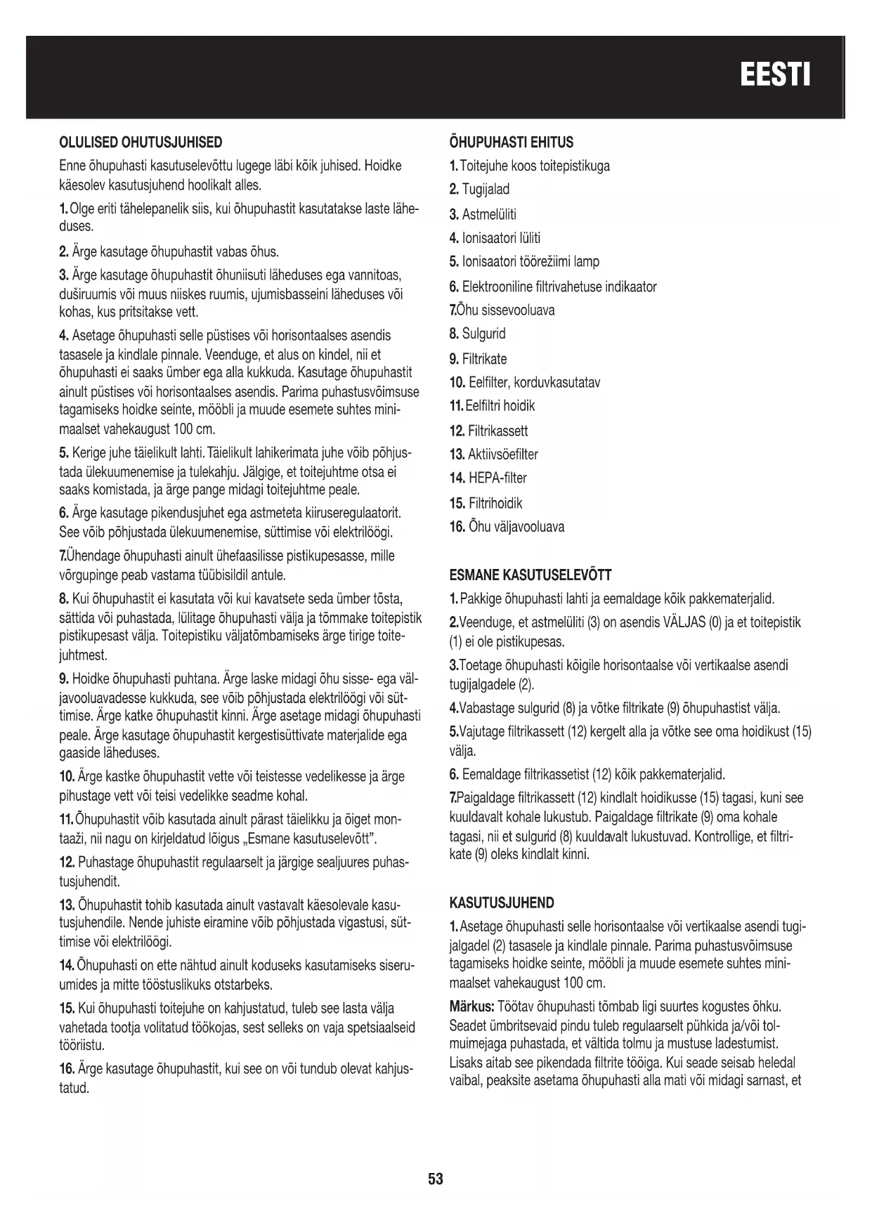 15. Kui õhupuhasti toitejuhe on kahjustatud, tuleb see lasta välja