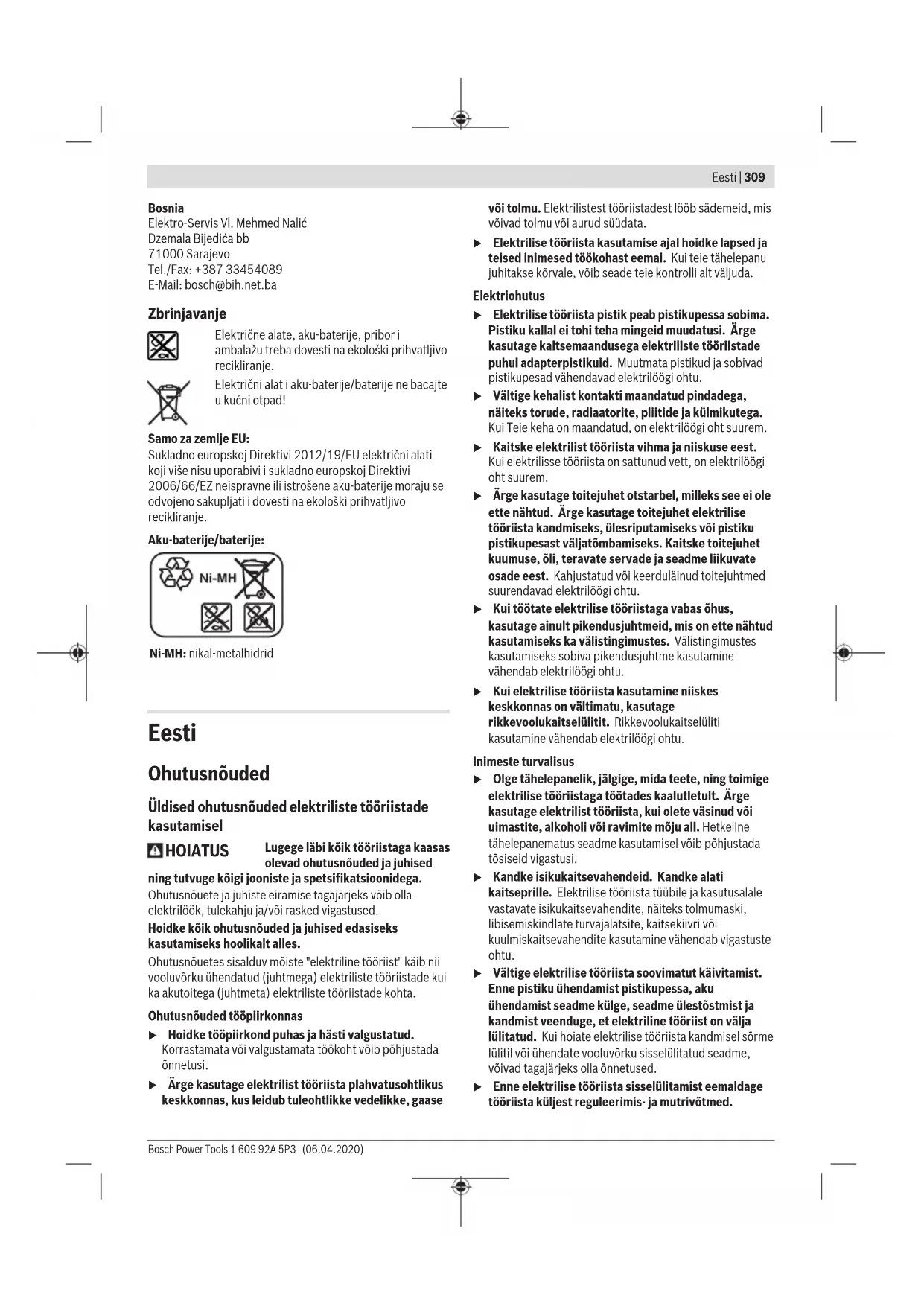 mõõdetud 20‒25°C juures akuga 2 607 335 685. B) piiratud võimsus temperatuuril <0°C Ni-MH-aku 9,6 12,0 14,4 Tootenumber