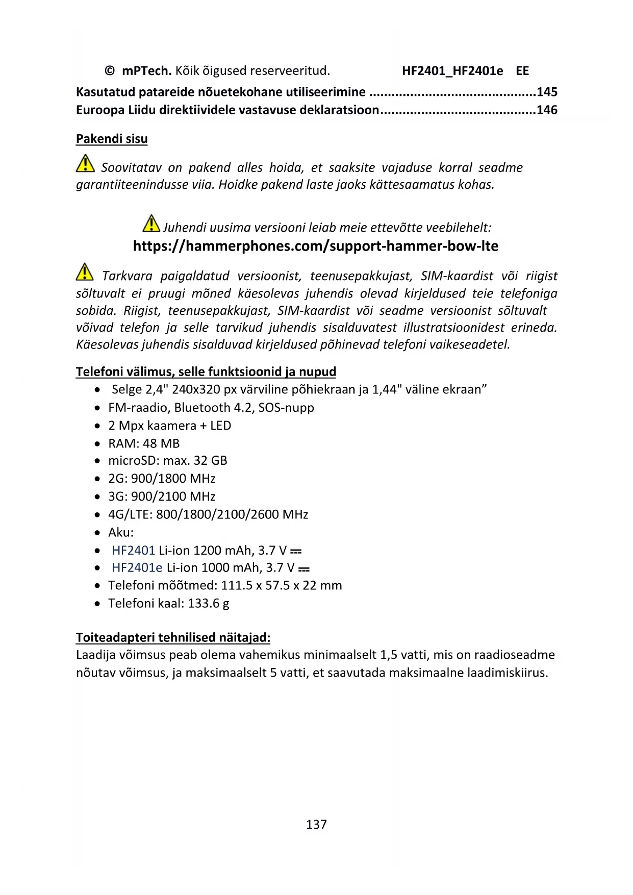 palun ühendust kohaliku kontori või jäätmekäitlusasutusega. Euroopa Liidu direktiividele vastavuse deklaratsioon mPTech Ltd. deklareerib käesolevaga, et mobiiltelefon HAMMER vastab direktiivile 2014/53/EL. ELi vastavusdeklaratsiooni täistekst on kättesaadav järgmisel internetiaadressil: https://hammerphones.com/support-hammer-bow-lte© mPTech. Visas tiesības aizsargātas. HF2401_HF2401e LV