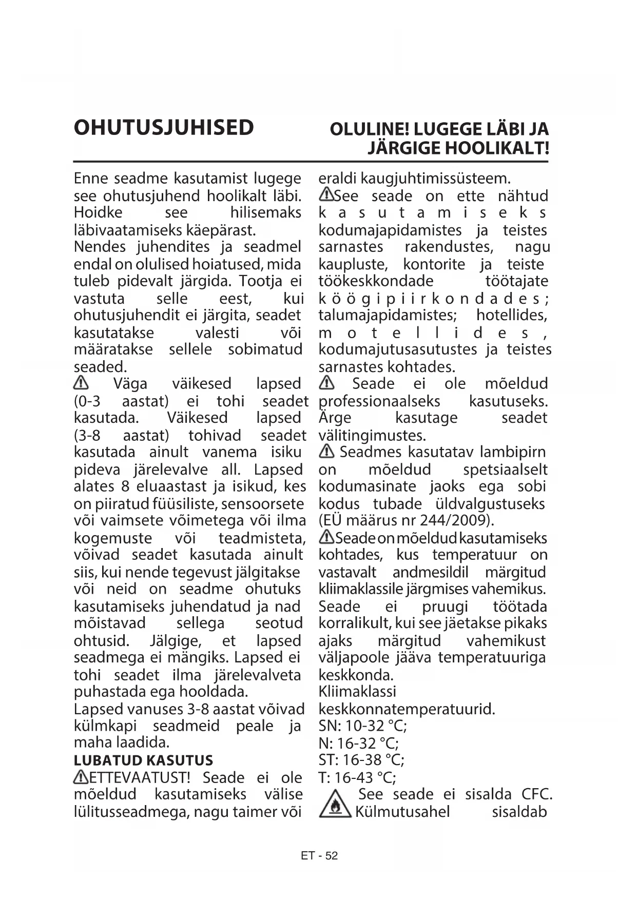 JÄRGIGE HOOLIKALT! Enne seadme kasutamist lugege see ohutusjuhend hoolikalt läbi. Hoidke see hilisemaks läbivaatamiseks käepärast. Nendes juhendites ja seadmel endal on olulised hoiatused, mida tuleb pidevalt järgida. Tootja ei vastuta selle eest, kui ohutusjuhendit ei järgita, seadet kasutatakse valesti või määratakse sellele sobimatud seaded. Väga väikesed lapsed (0-3 aastat) ei tohi seadet kasutada. Väikesed lapsed (3-8 aastat) tohivad seadet kasutada ainult vanema isiku pideva järelevalve all. Lapsed alates 8 eluaastast ja isikud, kes on piiratud füüsiliste, sensoorsete või vaimsete võimetega või ilma kogemuste või teadmisteta, võivad seadet kasutada ainult siis, kui nende tegevust jälgitakse või neid on seadme ohutuks kasutamiseks juhendatud ja nad mõistavad sellega seotud ohtusid. Jälgige, et lapsed seadmega ei mängiks. Lapsed ei tohi seadet ilma järelevalveta puhastada ega hooldada. Lapsed vanuses 3-8 aastat võivad külmkapi seadmeid peale ja maha laadida. LUBATUD KASUTUS ETTEVAATUST! Seade ei ole mõeldud kasutamiseks välise lülitusseadmega, nagu taimer või eraldi kaugjuhtimissüsteem. See seade on ette nähtud kasutamiseks kodumajapidamistes ja teistes sarnastes rakendustes, nagu kaupluste, kontorite ja teiste töökeskkondade töötajate köögipiirkondades; talumajapidamistes; hotellides, motellides, kodumajutusasutustes ja teistes sarnastes kohtades. Seade ei ole mõeldud professionaalseks kasutuseks. Ärge kasutage seadet välitingimustes. Seadmes kasutatav lambipirn on mõeldud spetsiaalselt kodumasinate jaoks ega sobi kodus tubade üldvalgustuseks (EÜ määrus nr 244/2009). Seade on mõeldud kasutamiseks kohtades, kus temperatuur on vastavalt andmesildil märgitud kliimaklassile järgmises vahemikus. Seade ei pruugi töötada korralikult, kui see jäetakse pikaks ajaks märgitud vahemikust väljapoole jääva temperatuuriga keskkonda. Kliimaklassi keskkonnatemperatuurid. SN: 10-32 °C; N: 16-32 °C; ST: 16-38 °C; T: 16-43 °C; See seade ei sisalda CFC. Külmutusahel sisaldab ET - 52külmaainet R600a (HC). Isobutaaniga (R600a) seadmed: isobutaan on looduslik gaas, millel puudub keskkonnamõju, kuid mis süttib kergesti. Seetõttu jälgige, et külmaaineahela torud ei oleks kahjustatud, eriti kui hakkate ahelat tühjaks laskma. HOIATUS! Ärge kahjustage seadme külmaaineahela torusid. HOIATUS: Veenduge, et seadme korpuses ja konstruktsioonis olevad ventilatsiooniavad ei ole blokeeritud. HOIATUS! Ärge kasutage sulamise kiirendamiseks muid kui tootja soovitatud mehaanilisi, elektrilisi või keemilisi vahendeid. HOIATUS: Ärge asetage seadme sektsioonidesse elektriseadmeid, kui need ei ole tootja poolt selgesõnaliselt lubatud tüüpi. HOIATUS: Veevarustusega mitteühendatud jäävalmistajaid ja/või veeautomaate võib täita ainult joogiveega. HOIATUS! Automaatsed jäävalmistajad ja/või veeautomaadid tohib ühendada ainult joogiveetorustikuga, kus veesurve on vahemikus 0,17 kuni 0,81MPa (1,7 kuni 8,1 bar). Ärge hoidke seadmes plahvatusohtlikke aineid, nt aerosoolipurke! Ärge hoidke seadmes ega kasutage selle läheduses bensiini või muid tuleohtlikke materjale! Ärge neelake (mõne mudeliga kaasasolevate) jääpakkide sisu (mittemürgine). Ärge sööge jääkuubikuid või jääpulki kohe pärast nende sügavkülmikust võtmist, sest need võivad põhjustada külmapõletust. Toodetel, millel on ette nähtud õhultri kasutamine ligipääsetava ventilaatorikatte sees, peab lter asuma seadme töötamise ajal alati ettenähtud kohal. Ärge hoidke külmutussektsioonis vedelikega klaasnõusid, sest need võivad puruneda. Ärge blokeerige ventilaatorit (kui see on paigaldatud) toiduainetega. Pärast toidu paigutamist kontrollige, et sügavkülmiku uks oleks korralikult kinni. Kahjustatud tihend tuleb võimalikult kiiresti välja vahetada. Kasutage sügavkülmikut ainult külmutatud toidu hoidmiseks, värske toidu külmutamiseks ja jääkuubikute tegemiseks. Vältige katmata toidu hoidmist otseses kontaktis külmutussektsioonide sisepindadega. C-pentaani kasutatakse isolatsioonivahus puhumisvahendina ja see on kergesti süttiv gaas. Kõige sobilikumad seadme sektsioonid, kus säilitada teatud ET - 53tüüpi toiduaineid, võttes arvesse erinevat temperatuurijaotust erinevates seadme sektsioonides, on jaotatud järgnevalt: 4 tärni tsooni (****) sektsioon on sobilik toatemperatuuril olevate toiduainete külmutamiseks ning külmutatud toidu hoiustamiseks, kuna sealne temperatuur on ühtlaselt terves sektsioonis jagunenud. Ostetud külmutatud toidul on pakendil märgitud selle säilivusaeg. See võtab arvesse hoiustatava toiduaine tüüpi ning seega peaks seda kuupäeva arvesse võtma. Värsket toitu tohib säilitada järgmiste ajaperioodide jooksul: 1-3 kuud juustu, koorikloomade, jäätise, singi/ vorstide, piima, värskete vedelike jaoks; 4 kuud praetüki või karbonaadi (loom, lammas, siga) jaoks; 6 kuud või/margariini, linnuliha (kana, kalkun) jaoks; 8-12 puuviljade (va.tsiruselised), praeliha (loomaliha, siga, lammas), köögiviljad, jaoks. 2 tärni tsoonis olevate pakendatud toiduainete aegumiskuupäevasid tuleks hoolikalt järgida. Toidu saastumise vältimisks järgige palun järgmist: – Ukse avamine pikkadeks perioodideks võib põhjustada märkimisväärset temperatuuri tõusu seadme sektsioonides. – Puhastage regulaarselt pindu, mis puutuvad kokku toiduga ning ligipääsetavate äravoolusüsteemidega. – Puhastage veepaake, kui neid pole 48h kasutatud; loputage veesüsteemi, mis on ühendatud veevarustusega, kui vesi ei ole 5 päeva jooksul välja voolanud. – Hoiustage toorest liha ja kala külmkapis sobivates anumates, et need ei puutuks kokku või ei tilguks muudele toiduainetele. – Kahe tärniga külmutatud toidu sektsioonid on sobilikud eelkülmutatud toidu hoiustamiseks, jääkuubikute ja jäätise valmistamiseks või hoiustamiseks. – Ärge külmutage värsket toitu ühe, kahe või kolme tärniga sektsioonides. – Kui kül