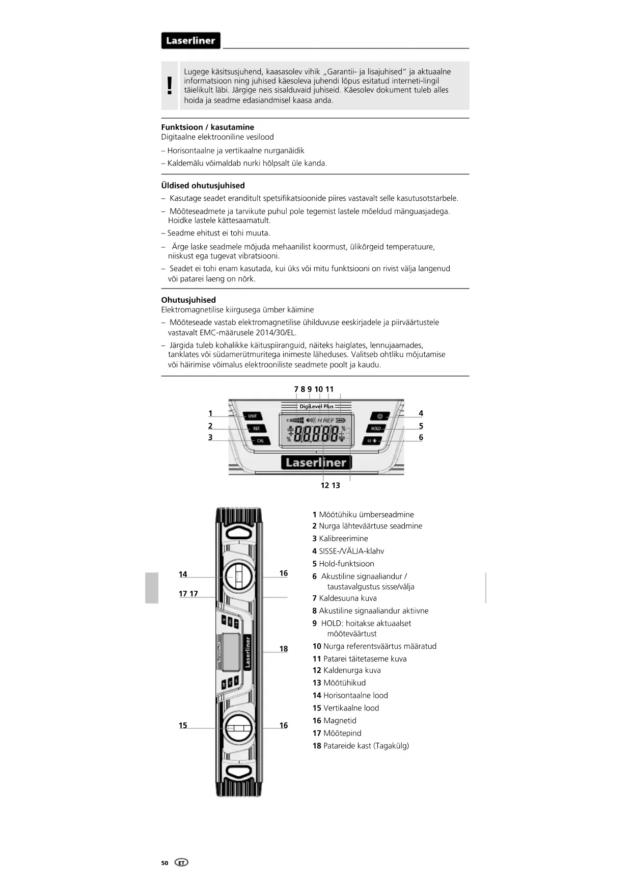 1 Mõõtühiku ümberseadmine 2 Nurga lähteväärtuse seadmine 3 Kalibreerimine 4 SISSE-/VÄLJA-klahv 5 Hold-funktsioon 6 Akustiline signaaliandur / taustavalgustus sisse/välja 7 Kaldesuuna kuva 8 Akustiline signaaliandur aktiivne 9 HOLD: hoitakse aktuaalset mõõteväärtust 10 Nurga referentsväärtus määratud 11 Patarei täitetaseme kuva 12 Kaldenurga kuva 13 Mõõtühikud 14 Horisontaalne lood 15 Vertikaalne lood 16 Magnetid 17 Mõõtepind 18 Patareide kast (Tagakülg)DigiLevel Plus