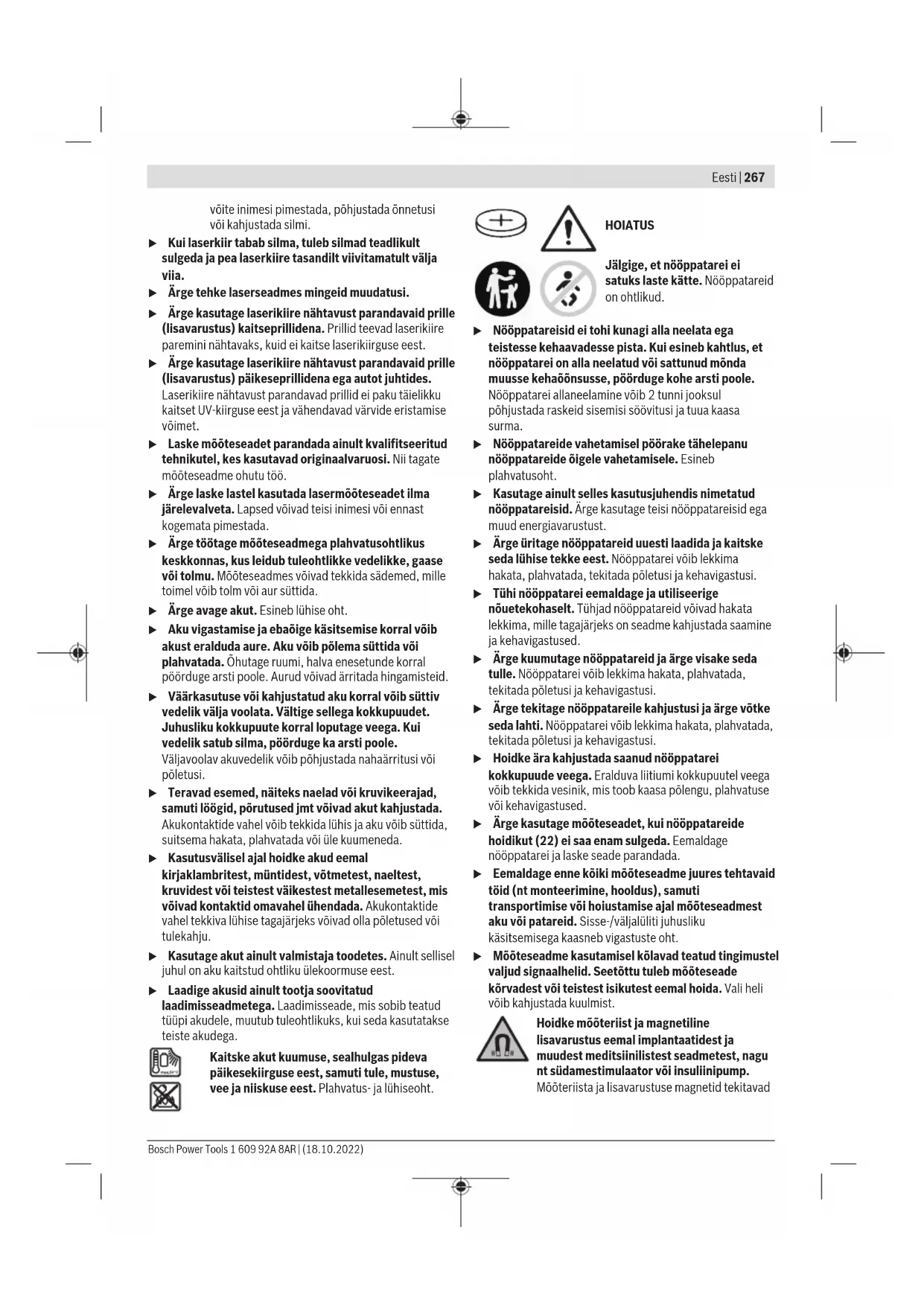 JUHISED. u Ettevaatust – käesolevas juhendis nimetatud käsitsus- või justeerimisseadmetest erinevate seadmete kasutamisel või muul viisil toimides võib laserkiirgus muutuda ohtlikuks. u Mõõteseade tarnitakse koos laseri hoiatussildiga (tähistatud mõõteriista kujutisel jooniste leheküljel). u Kui laseri hoiatussildi tekst ei ole teie riigis kõneldavas keeles, kleepige see enne tööriista esmakordset kasutuselevõttu üle kaasasoleva, teie riigikeeles oleva kleebisega. Ärge juhtige laserkiirt inimeste ega loomade suunas ja ärge viige ka ise pilku otsese või peegelduva laserkiire suunas. Vastasel korral 1 609 92A 8AR | (18.10.2022) Bosch Power ToolsEesti | 267 võite inimesi pimestada, põhjustada õnnetusi või kahjustada silmi. u Kui laserkiir tabab silma, tuleb silmad teadlikult sulgeda ja pea laserkiire tasandilt viivitamatult välja viia. u Ärge tehke laserseadmes mingeid muudatusi. u Ärge kasutage laserikiire nähtavust parandavaid prille (lisavarustus) kaitseprillidena. Prillid teevad laserikiire paremini nähtavaks, kuid ei kaitse laserikiirguse eest. u Ärge kasutage laserikiire nähtavust parandavaid prille (lisavarustus) päikeseprillidena ega autot juhtides. Laserikiire nähtavust parandavad prillid ei paku täielikku kaitset UV-kiirguse eest ja vähendavad värvide eristamise võimet. u Laske mõõteseadet parandada ainult kvalifitseeritud tehnikutel, kes kasutavad originaalvaruosi. Nii tagate mõõteseadme ohutu töö. u Ärge laske lastel kasutada lasermõõteseadet ilma järelevalveta. Lapsed võivad teisi inimesi või ennast kogemata pimestada. u Ärge töötage mõõteseadmega plahvatusohtlikus keskkonnas, kus leidub tuleohtlikke vedelikke, gaase või tolmu. Mõõteseadmes võivad tekkida sädemed, mille toimel võib tolm või aur süttida. u Ärge avage akut. Esineb lühise oht. u Aku vigastamise ja ebaõige käsitsemise korral võib akust eralduda aure. Aku võib põlema süttida või plahvatada. Õhutage ruumi, halva enesetunde korral pöörduge arsti poole. Aurud võivad ärritada hingamisteid. u Väärkasutuse või kahjustatud aku korral võib süttiv vedelik välja voolata. Vältige sellega kokkupuudet. Juhusliku kokkupuute korral loputage veega. Kui vedelik satub silma, pöörduge ka arsti poole. Väljavoolav akuvedelik võib põhjustada nahaärritusi või põletusi. u Teravad esemed, näiteks naelad või kruvikeerajad, samuti löögid, põrutused jmt võivad akut kahjustada. Akukontaktide vahel võib tekkida lühis ja aku võib süttida, suitsema hakata, plahvatada või üle kuumeneda. u Kasutusvälisel ajal hoidke akud eemal kirjaklambritest, müntidest, võtmetest, naeltest, kruvidest või teistest väikestest metallesemetest, mis võivad kontaktid omavahel ühendada. Akukontaktide vahel tekkiva lühise tagajärjeks võivad olla põletused või tulekahju. u Kasutage akut ainult valmistaja toodetes. Ainult sellisel juhul on aku kaitstud ohtliku ülekoormuse eest. u Laadige akusid ainult tootja soovitatud laadimisseadmetega. Laadimisseade, mis sobib teatud tüüpi akudele, muutub tuleohtlikuks, kui seda kasutatakse teiste akudega. Kaitske akut kuumuse, sealhulgas pideva päikesekiirguse eest, samuti tule, mustuse, vee ja niiskuse eest. Plahvatus- ja lühiseoht. HOIATUS Jälgige, et nööppatarei ei satuks laste kätte. Nööppatareid on ohtlikud. u Nööppatareisid ei tohi kunagi alla neelata ega teistesse kehaavadesse pista. Kui esineb kahtlus, et nööppatarei on alla neelatud või sattunud mõnda muusse kehaõõnsusse, pöörduge kohe arsti poole. Nööppatarei allaneelamine võib 2 tunni jooksul põhjustada raskeid sisemisi söövitusi ja tuua kaasa surma. u Nööppatareide vahetamisel pöörake tähelepanu nööppatareide õigele vahetamisele. Esineb plahvatusoht. u Kasutage ainult selles kasutusjuhendis nimetatud nööppatareisid. Ärge kasutage teisi nööppatareisid ega muud energiavarustust. u Ärge üritage nööppatareid uuesti laadida ja kaitske seda lühise tekke eest. Nööppatarei võib lekkima hakata, plahvatada, tekitada põletusi ja kehavigastusi. u Tühi nööppatarei eemaldage ja utiliseerige nõuetekohaselt. Tühjad nööppatareid võivad hakata lekkima, mille tagajärjeks on seadme kahjustada saamine ja kehavigastused. u Ärge kuumutage nööppatareid ja ärge visake seda tulle. Nööppatarei võib lekkima hakata, plahvatada, tekitada põletusi ja kehavigastusi. u Ärge tekitage nööppatareile kahjustusi ja ärge võtke seda lahti. Nööppatarei võib lekkima hakata, plahvatada, tekitada põletusi ja kehavigastusi. u Hoidke ära kahjustada saanud nööppatarei kokkupuude veega. Eralduva liitiumi kokkupuutel veega võib tekkida vesinik, mis toob kaasa põlengu, plahvatuse või kehavigastused. u Ärge kasutage mõõteseadet, kui nööppatareide hoidikut(22) ei saa enam sulgeda. Eemaldage nööppatarei ja laske seade parandada. u Eemaldage enne kõiki mõõteseadme juures tehtavaid töid (nt monteerimine, hooldus), samuti transportimise või hoiustamise ajal mõõteseadmest aku või patareid. Sisse-/väljalüliti juhusliku käsitsemisega kaasneb vigastuste oht. u Mõõteseadme kasutamisel kõlavad teatud tingimustel valjud signaalhelid. Seetõttu tuleb mõõteseade kõrvadest või teistest isikutest eemal hoida. Vali heli võib kahjustada kuulmist. Hoidke mõõteriist ja magnetiline lisavarustus eemal implantaatidest ja muudest meditsiinilistest seadmetest, nagu nt südamestimulaator või insuliinipump. Mõõteriista ja lisavarustuse magnetid tekitavad Bosch Power Tools 1 609 92A 8AR | (18.10.2022)268 | Eesti välja, mis võib implantaatide ja meditsiiniliste seadmete talitlust mõjutada. u Hoidke mõõteseade ja magnettarvikud eemal magnetilistest andmekandjatest ja magnetiliselt tundlikest seadmetest. Mõõteseadme ja tarvikute magnetite toime võib põhjustada andmete pöördumatu hävimise. u Mõõteseade on varustatud raadioliidesega. Järgida tuleb kohalikke tööpiiranguid, nt lennukites või haiglates. Sõnamärk Blue