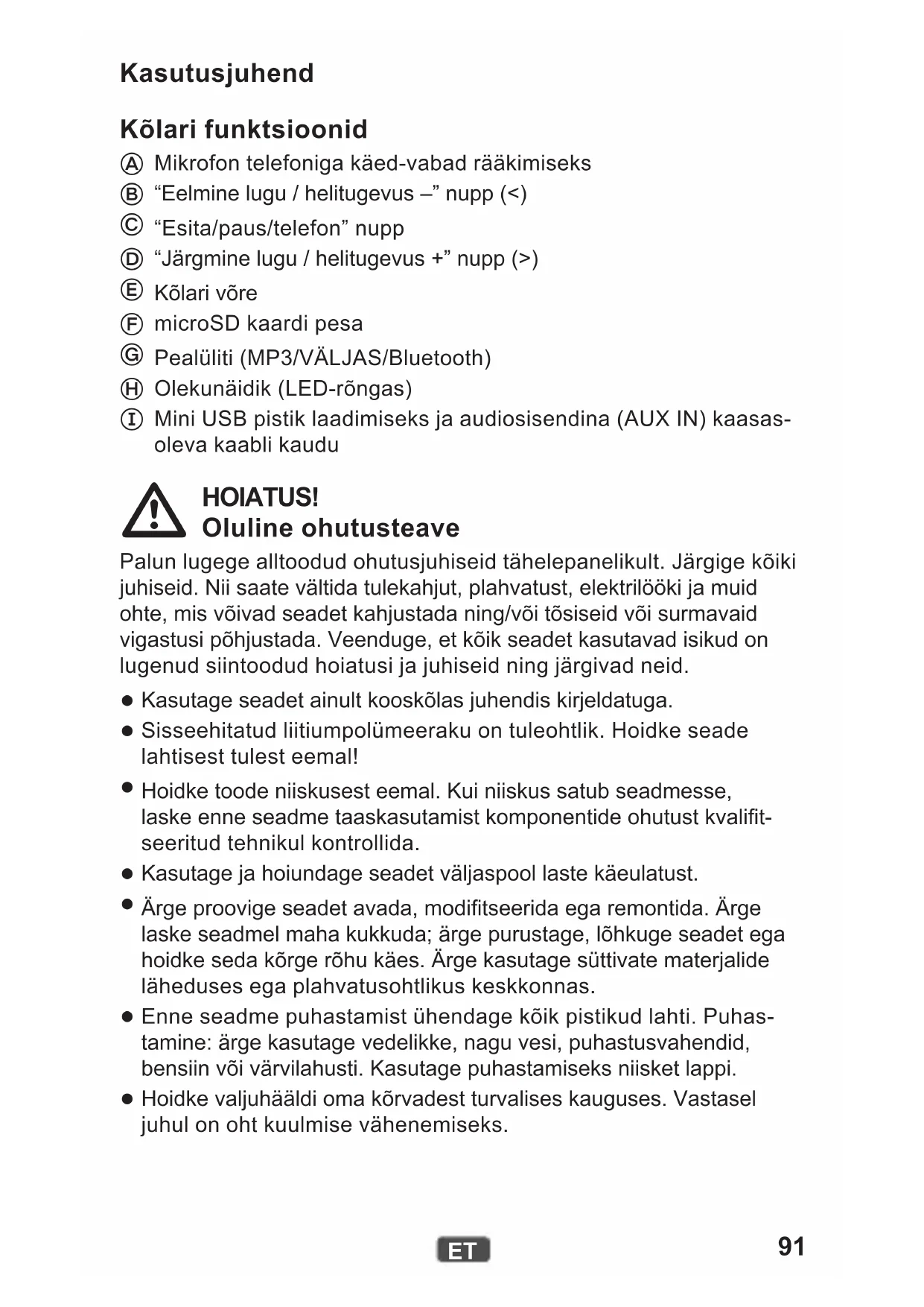 Mini USB pistik laadimiseks ja audiosisendina (AUX IN) kaasas- oleva kaabli kaudu HOIATUS! Oluline ohutusteave Palun lugege alltoodud ohutusjuhiseid tähelepanelikult. Järgige kõiki juhiseid. Nii saate vältida tulekahjut, plahvatust, elektrilööki ja muid ohte, mis võivad seadet kahjustada ning/või tõsiseid või surmavaid vigastusi põhjustada. Veenduge, et kõik seadet kasutavad isikud on lugenud siintoodud hoiatusi ja juhiseid ning järgivad neid.