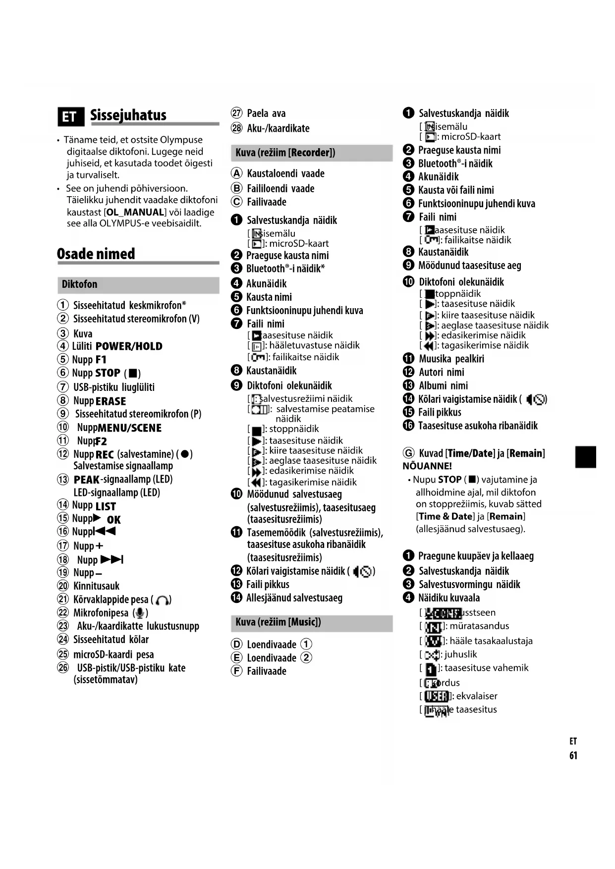 ES• Täname teid, et ostsite Olympuse digitaalse diktofoni. Lugege neid juhiseid, et kasutada toodet õigesti ja turvaliselt.
