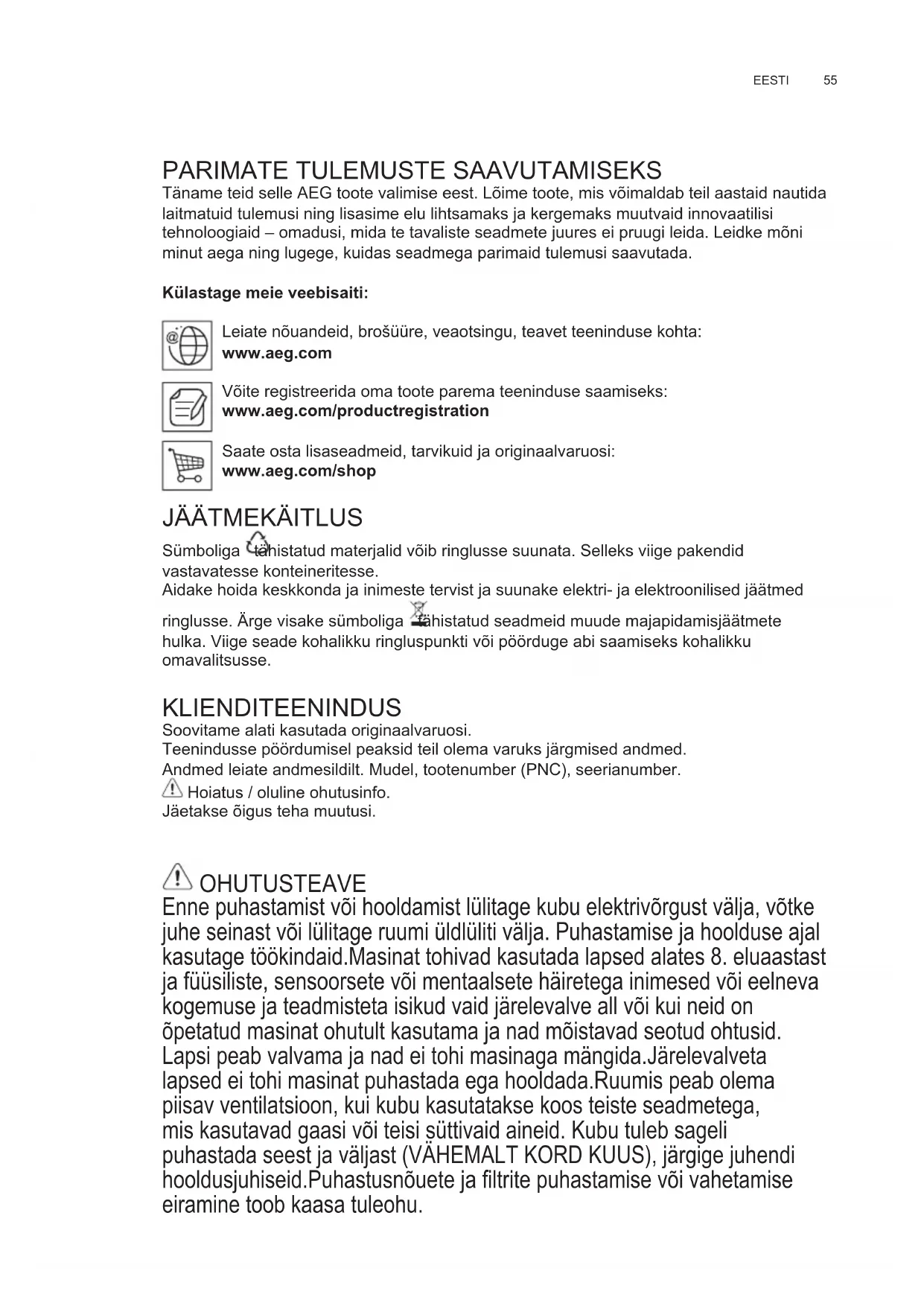 Täname teid selle AEG toote valimise eest. Lõime toote, mis võimaldab teil aastaid nautida laitmatuid tulemusi ning lisasime elu lihtsamaks ja kergemaks muutvaid innovaatilisi tehnoloogiaid – omadusi, mida te tavaliste seadmete juures ei pruugi leida. Leidke mõni minut aega ning lugege, kuidas seadmega parimaid tulemusi saavutada. Külastage meie veebisaiti: Leiate nõuandeid, brošüüre, veaotsingu, teavet teeninduse kohta: www.aeg.com Võite registreerida oma toote parema teeninduse saamiseks: www.aeg.com/productregistration Saate osta lisaseadmeid, tarvikuid ja originaalvaruosi: www.aeg.com/shop