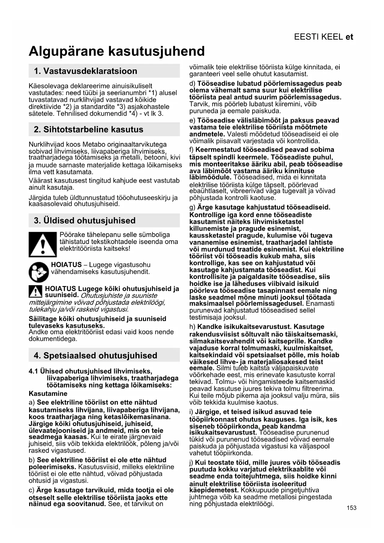 Algupärane kasutusjuhend Käesolevaga deklareerime ainuisikuliselt vastutades: need tüübi ja seerianumbri *1) alusel tuvastatavad nurklihvijad vastavad kõikide direktiivide *2) ja standardite *3) asjakohastele sätetele. Tehnilised dokumendid *4) - vt lk 3. Nurklihvijad koos Metabo originaaltarvikutega sobivad lihvimiseks, liivapaberiga lihvimiseks, traatharjadega töötamiseks ja metalli, betooni, kivi ja muude sarnaste materjalide kettaga lõikamiseks ilma vett kasutamata. Väärast kasutusest tingitud kahjude eest vastutab ainult kasutaja. Järgida tuleb üldtunnustatud tööohutuseeskirju ja kaasasolevaid ohutusjuhiseid. Pöörake tähelepanu selle sümboliga tähistatud tekstikohtadele iseenda oma elektritööriista kaitseks! HOIATUS – Lugege vigastusohu vähendamiseks kasutusjuhendit. HOIATUS Lugege kõiki ohutusjuhiseid ja suuniseid. Ohutusjuhiste ja suuniste mittejärgimine võivad põhjustada elektrilöögi, tulekahju ja/või raskeid vigastusi. Säilitage kõiki ohutusjuhiseid ja suuniseid tulevaseks kasutuseks. Andke oma elektritööriist edasi vaid koos nende dokumentidega.