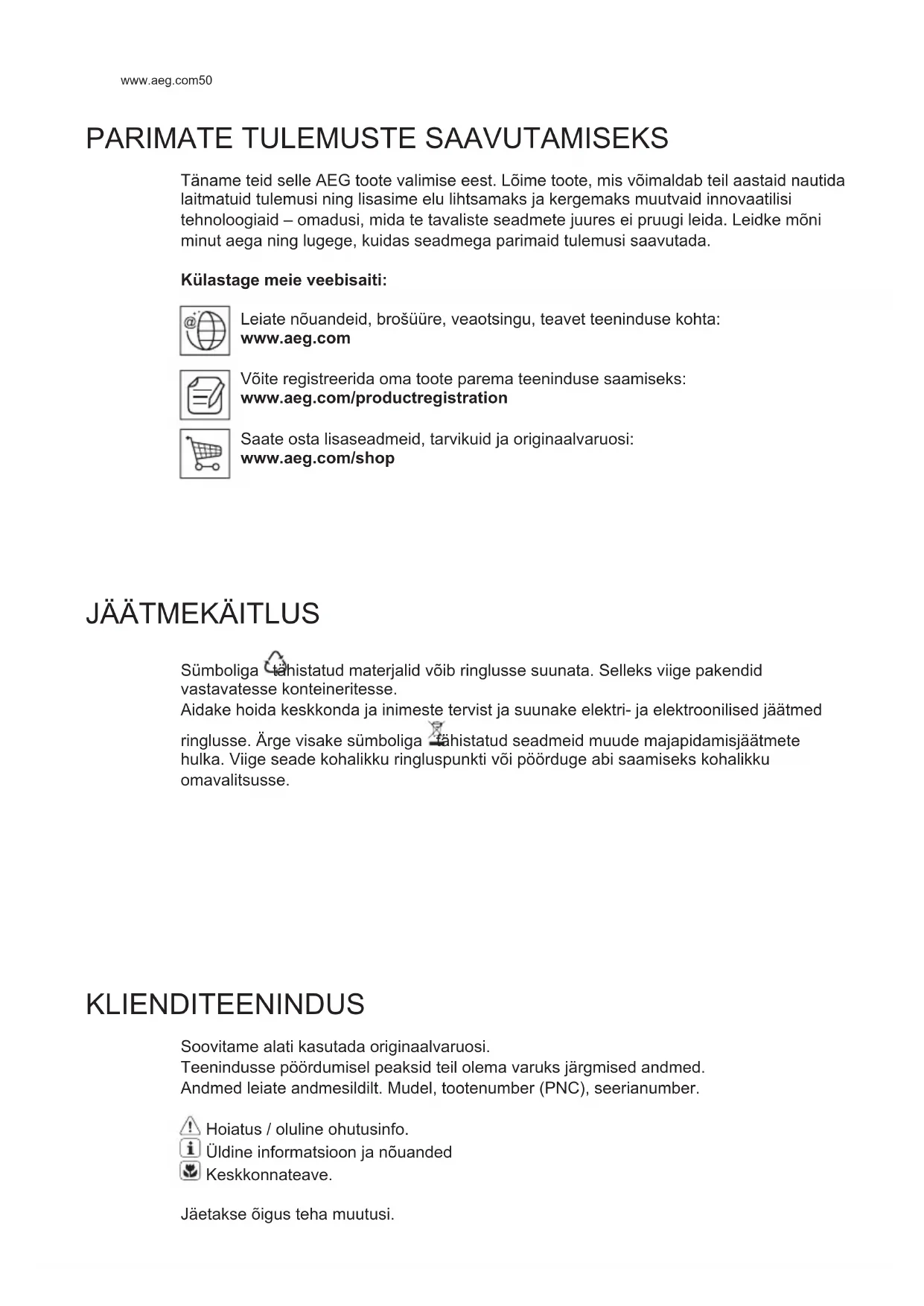 Sümboliga tähistatud materjalid võib ringlusse suunata. Selleks viige pakendid vastavatesse konteineritesse. Aidake hoida keskkonda ja inimeste tervist ja suunake elektri- ja elektroonilised jäätmed ringlusse. Ärge visake sümboliga tähistatud seadmeid muude majapidamisjäätmete hulka. Viige seade kohalikku ringluspunkti või pöörduge abi saamiseks kohalikku omavalitsusse. KLIENDITEENINDUS Soovitame alati kasutada originaalvaruosi. Teenindusse pöördumisel peaksid teil olema varuks järgmised andmed. Andmed leiate andmesildilt. Mudel, tootenumber (PNC), seerianumber. Hoiatus / oluline ohutusinfo. Üldine informatsioon ja nõuanded Keskkonnateave. Jäetakse õigus teha muutusi. ET KASUTUSJUHEND51 EESTI