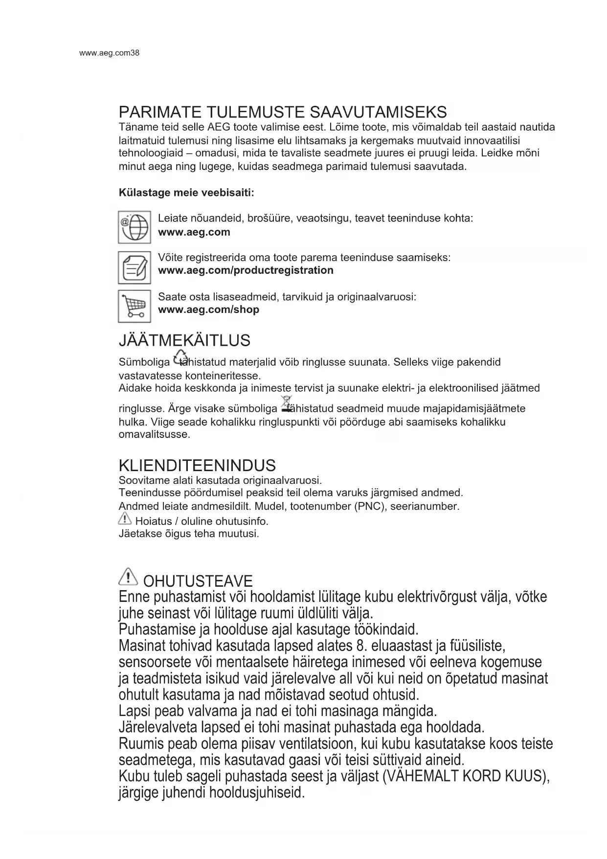 Täname teid selle AEG toote valimise eest. Lõime toote, mis võimaldab teil aastaid nautida laitmatuid tulemusi ning lisasime elu lihtsamaks ja kergemaks muutvaid innovaatilisi tehnoloogiaid – omadusi, mida te tavaliste seadmete juures ei pruugi leida. Leidke mõni minut aega ning lugege, kuidas seadmega parimaid tulemusi saavutada. Külastage meie veebisaiti: Leiate nõuandeid, brošüüre, veaotsingu, teavet teeninduse kohta: www.aeg.com Võite registreerida oma toote parema teeninduse saamiseks: www.aeg.com/productregistration Saate osta lisaseadmeid, tarvikuid ja originaalvaruosi: www.aeg.com/shop
