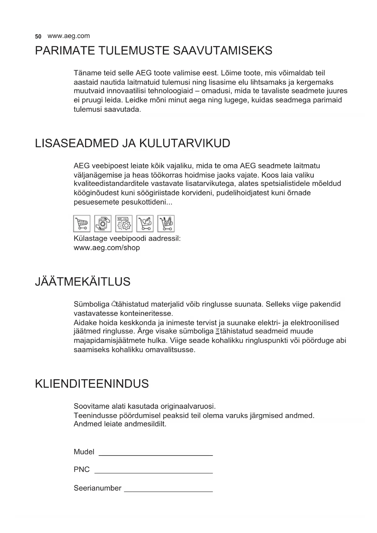 AEG veebipoest leiate kõik vajaliku, mida te oma AEG seadmete laitmatu väljanägemise ja heas töökorras hoidmise jaoks vajate. Koos laia valiku kvaliteedistandarditele vastavate lisatarvikutega, alates spetsialistidele mõeldud kööginõudest kuni söögiriistade korvideni, pudelihoidjatest kuni õrnade pesuesemete pesukottideni... Külastage veebipoodi aadressil: www.aeg.com/shop