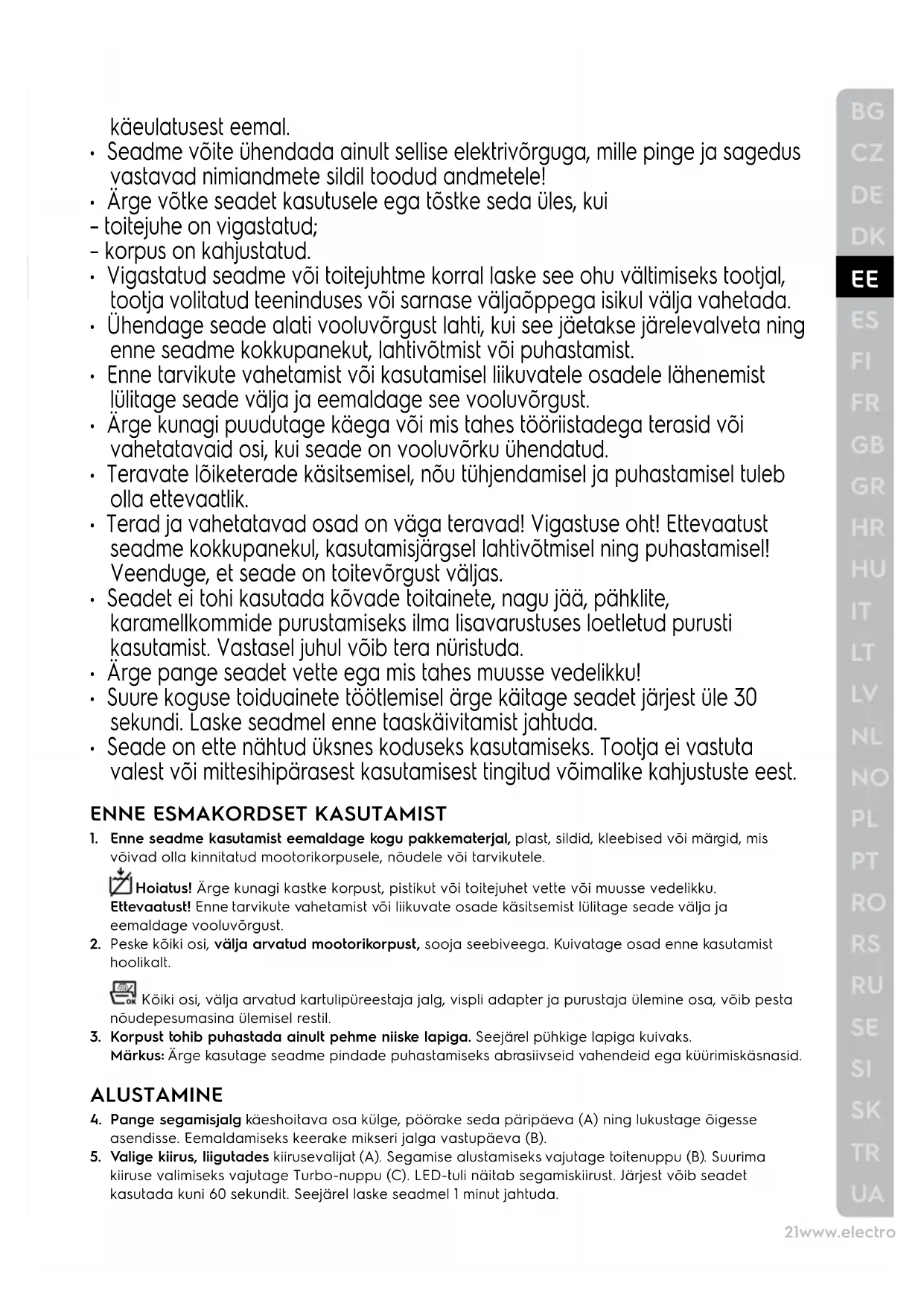 kiiruse valimiseks vajutage Turbo-nuppu (C). LED-tuli näitab segamiskiirust. Järjest võib seadet kasutada kuni 60 sekundit. Seejärel laske seadmel 1 minut jahtuda.22www.electrolux.com
