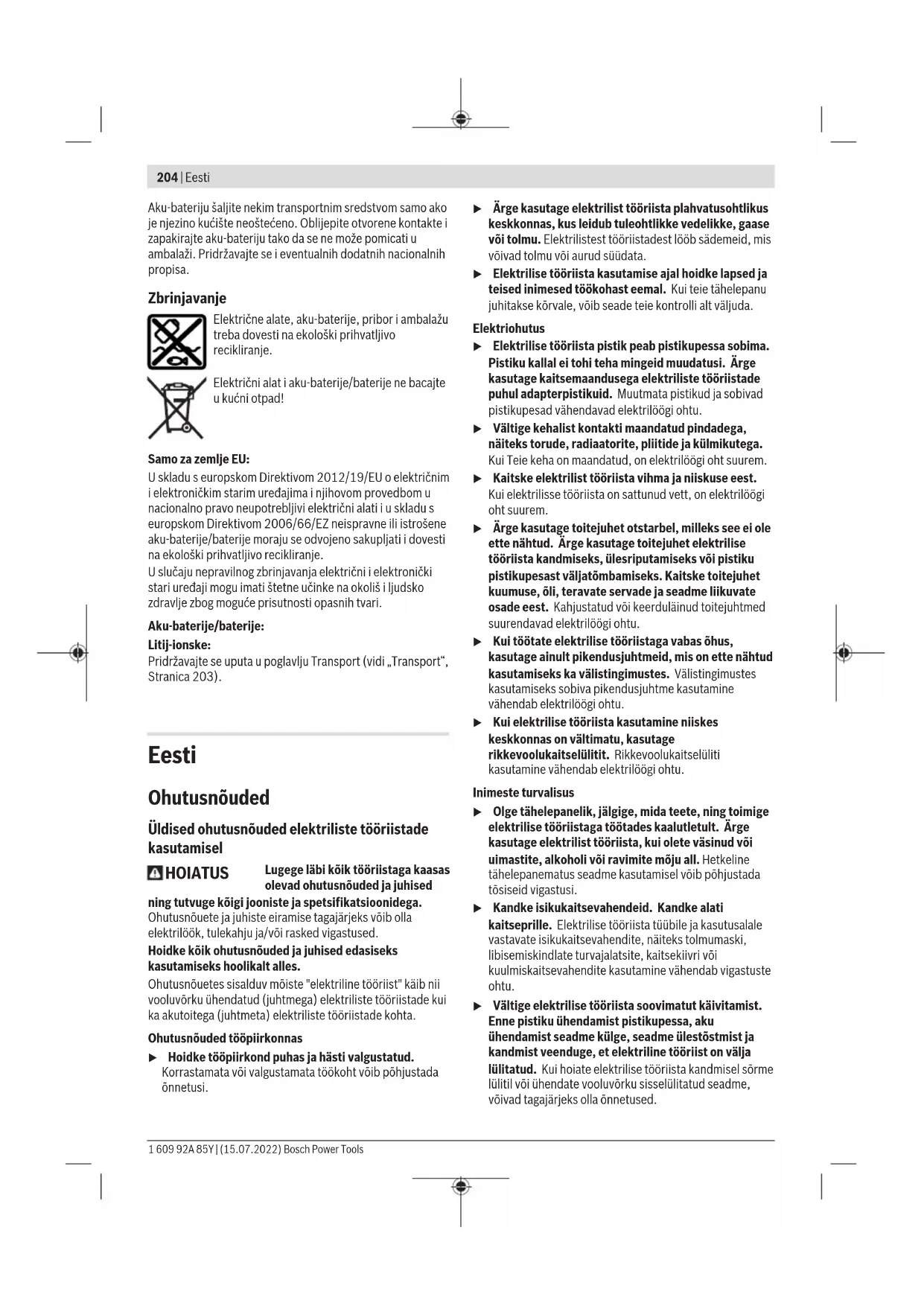 Mõõdetud 20−25°C juures akuga GBA10,8V2.0Ah. B) sõltuvalt kasutatud akust C) piiratud võimsus temperatuuril <0°C Andmed müra/vibratsiooni kohta Mürapäästuväärtused on määratud vastavalt standardile EN62841‑2‑11. Elektrilise tööriista A-korrigeeritud helirõhutase on tavaliselt 75dB(A). Mõõtemääramatus K=5dB. Töötamisel võib müratase nimetatud väärtusi ületada. Kasutage kuulmiskaitsevahendeid! Vibratsiooni koguväärtused a