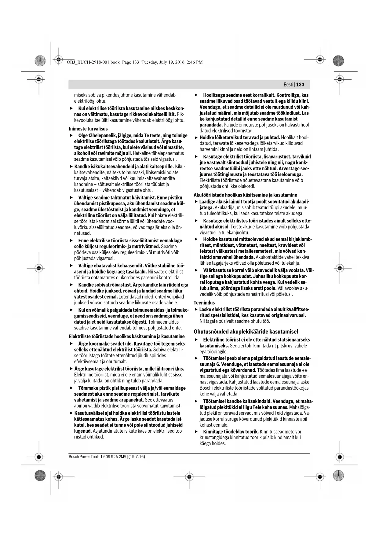 OBJ_BUCH-2918-001.book Page 131 Tuesday, July 19, 2016 2:46 PM132 | Eesti 1 609 92A 2MV | (19.7.16) Bosch Power Tools Napomena: Nož okrenite samo u smjeru prikazanom na slici, odnosno ugradite nož u položaj prikazan na slici. Sa pogrešno ugrađenim nožem ne može se rezati. –Vijak 9 za gornji nož, odnosno vijak 13 za donji nož ponov- no stegnite sa momentom stezanja od 3–4 Nm. Provjerite razmak noževa a (vidjeti »Podešavanje razmaka noževa a«, stranica 131). Gornji nož 10 i donji nož 11 ne smiju se naknadno oštriti. Servisiranje i savjetovanje o primjeni Ovlašteni servis će odgovoriti na vaša pitanja o popravcima i održavanju vašeg proizvoda te o rezervnim dijelovima. Pove- ćane crteže i informacije o rezervnim dijelovima možete naći na adresi: www.bosch-pt.com Bosch tim za savjetovanje o primjeni rado će vam pomoći od- govorom na pitanja o našim proizvodima i priboru. Za slučaj povratnih upita ili naručivanja rezervnih dijelova, molimo vas neizostavno navedite 10-znamenkasti kataloški broj sa tipske pločice proizvoda. Hrvatski Robert Bosch d.o.o Kneza Branimira 22 10040 Zagreb Tel.: (01) 2958051 Fax: (01) 2958050 Transport Li-ionske aku-baterije ugrađene u električnom alatu podliježu zakonu o transportu opasnih tvari. Aku-baterije korisnik može bez ikakvih preduvjeta transportirati cestovnim transportom. Ako transport obavlja treća strana (npr. transport zrakoplo- vom ili špedicijom), treba se pridržavati posebnih zahtjeva obzirom na ambalažu i označavanje. Kod pripreme ovakvih pošiljki za transport prethodno se treba savjetovati sa struč- njakom za transport opasnih tvari. Aku-bateriju šaljite nekim transportnim sredstvom samo ako je njeno kućište neoštećeno. Oblijepite otvorene kontakte i zapakirajte aku-bateriju tako da se ne može pomicati u amba- laži. Molimo pridržavajte se i eventualnih dodatnih nacionalnih propisa. Zbrinjavanje Električne alate, aku-baterije, pribor i ambalažu treba dovesti na ekološki prihvatljivo recikliranje. Električni alat i aku-bateriju ne bacajte u kućni otpad! Samo za zemlje EU: Prema Europskim smjernicama 2012/19/EU, neuporabivi električni alati i prema Smjernicama 2006/66/EZ neis- pravne ili istrošene aku-baterije moraju se odvojeno sakupljati i dovesti na ekološki prihvatljivo recikliranje. Aku-baterije/baterije: Li-ion: Molimo pridržavajte se uputa u poglav- lju »Transport« na stranici 132. Zadržavamo pravo na promjene. Eesti Ohutusnõuded Üldised ohutusjuhised Kõik ohutusnõuded ja juhised tuleb läbi lugeda. Ohutusnõuete ja juhiste eiramise tagajärjeks võib olla elektrilöök, tulekahju ja/või rasked vigastused. Hoidke kõik ohutusnõuded ja juhised edasiseks kasutami- seks hoolikalt alles. Allpool kasutatud mõiste „Elektriline tööriist“ käib võrgutoi- tega (toitejuhtmega) elektriliste tööriistade ja akutoitega (ilma toitejuhtmeta) elektriliste tööriistade kohta. Ohutusnõuded tööpiirkonnas Töökoht peab olema puhas ja hästi valgustatud. Tööko- has valitsev segadus ja hämarus võib põhjustada õnnetusi. Ärge kasutage elektrilist tööriista plahvatusohtlikus keskkonnas, kus leidub tuleohtlikke vedelikke, gaase või tolmu. Elektrilistest tööriistadest lööb sädemeid, mis võivad tolmu või aurud süüdata. Elektrilise tööriista kasutamise ajal hoidke lapsed ja teised isikud töökohast eema. Kui Teie tähelepanu kõr- vale juhitakse, võib seade Teie kontrolli alt väljuda. Elektriohutus Elektrilise tööriista pistik peab pistikupessa sobima. Pistiku kallal ei tohi teha mingeid muudatusi. Ärge ka- sutage kaitsemaandusega elektriliste tööriistade pu- hul adapterpistikuid. Muutmata pistikud ja sobivad pisti- kupesad vähendavad elektrilöögi saamise riski. Vältige kehakontakti maandatud pindadega, nagu to- rud, radiaatorid, pliidid ja külmikud. Kui Teie keha on maandatud, on elektrilöögi oht suurem. Hoidke seadet vihma ja niiskuse eest. Kui elektrilisse tööriista on sattunud vett, on elektrilöögi oht suurem. Ärge kasutage toitejuhet otstarvetel, milleks see ei ole ette nähtud, näiteks elektrilise tööriista kandmiseks, ülesriputamiseks või pistiku pistikupesast väljatõmba- miseks. Hoidke toitejuhet kuumuse, õli, teravate ser- vade ja seadme liikuvate osade eest. Kahjustatud või keerduläinud toitejuhtmed suurendavad elektrilöögi ohtu. Kui töötate elektrilise tööriistaga vabas õhus, kasutage ainult selliseid pikendusjuhtmeid, mida on lubatud ka- sutada ka välistingimustes. Välistingimustes kasuta- TÄHELEPANU OBJ_BUCH-2918-001.book Page 132 Tuesday, July 19, 2016 2:46 PMEesti | 133 Bosch Power Tools 1 609 92A 2MV | (19.7.16) miseks sobiva pikendusjuhtme kasutamine vähendab elektrilöögi ohtu. Kui elektrilise tööriista kasutamine niiskes keskkon- nas on vältimatu, kasutage rikkevoolukaitselülitit. Rik- kevoolukaitselüliti kasutamine vähendab elektrilöögi ohtu. Inimeste turvalisus Olge tähelepanelik, jälgige, mida Te teete, ning toimige elektrilise tööriistaga töötades kaalutletult. Ärge kasu- tage elektrilist tööriista, kui olete väsinud või uimastite, alkoholi või ravimite mõju all. Hetkeline tähelepanematus seadme kasutamisel võib põhjustada tõsiseid vigastusi. Kandke isikukaitsevahendeid ja alati kaitseprille. Isiku- kaitsevahendite, näiteks tolmumaski, libisemiskindlate turvajalatsite, kaitsekiivri või kuulmiskaitsevahendite kandmine – sõltuvalt elektrilise tööriista tüübist ja kasutusalast – vähendab vigastuste ohtu. Vältige seadme tahtmatut käivitamist. Enne pistiku ühendamist pistikupessa, aku ühendamist seadme kül- ge, seadme ülestõstmist ja kandmist veenduge, et elektriline tööriist on välja lülitatud. Kui hoiate elektrili- se tööriista kandmisel sõrme lülitil või ühendate voo- luvõrku sisselülitatud seadme, võivad tagajärjeks olla õn- netused. Enne elektrilise tööriista sisselülitamist eemaldage selle küljest reguleerimis- ja mutrivõtmed. Seadme pö