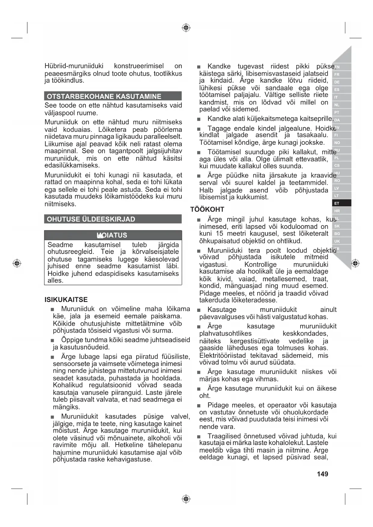 RASHOID ■ Lugege aku ja akulaadija komplektis olevad ohutusjuhised läbi ja tehke need endale selgeks. Selle nõude eiramine võib põhjustada elektrilööki, tulekahju ja muid ohtlikke olukordi. Hoidke kõiki juhiseid ühes kindlas kohas, et saaksite neid tulevikus lugeda. ■ Akutoitega tööriistu ei pea pingestamiseks vooluvõrgu pistikupessa ühendama – need on pinge all kogu aeg. Kui seadet ei kasutata, eemaldage sellelt lahklüliti võti. ■ Enne reguleerimist, hooldamist või lõigatavast materjalist puhastamist võtke akupakett välja. ■ Enne akupaketi sissepanekut võtke lülitusvõti välja. ■ Akupaketti tohib laadida ainult tootja poolt ettenähtud laadijaga. Akupaketiga mittesobiva laadija kasutamine võib põhjustada tuleohtu. Kasutage akupaketi laadimiseks ainult juhendis mainitud laadijat. ■ Kasutage ainult seda akupaketti, mis on 150 | Eestisellele seadmele ette nähtud. Muude akupakettide kasutamise korral võib tekkida tulekahju, elektrilöögi või kehavigastuse oht. ■ Sel ajal kui akupakett ei ole kasutusel, hoidke seda eemal metallesemetest nagu kirjaklambrid, mündid, võtmed, naelad, kruvid ja muudest väikestest metallobjektidest, mis võivad akuklemmid lühistada. Akupaketi klemmide lühistamine võib põhjustada sädemeid, põletust, tulekahju või plahvatust. ■ Ärge jätke akusid või toiteelemente lahtise tule lähedusse või kuuma kohta. Selle juhise järgimine vähendab plahvatuse ja võimaliku kehavigastuse ohtu. ■ Ärge akupaketti avage ega osadeks lahutage. Vabanev elektrolüüt on korrodeeriv ja võib põhjustada silma- ja nahavigastusi. Allaneelamisel on see mürgine. ■ Kaitske akut niiskuse ja vee vastu. Ärge laadige akut niiskes või märjas kohas. Vee sattumisel laadija sisemusse suureneb elektrilöögi saamise oht. ■ Aku vigastamise või ebaõige kasutamise korral võib eralduda gaase. Kaebuste korral minge värske õhu kätte ja kutsuge arstiabi. Gaasid võivad ärritada hingamissüsteemi. ■ Ärge jätke akupaketti kuuma või külma ilmaga sõidukile või õue. ■ Ärge püüdke akut põletamise teel hävitada. Kui aku kasutusaeg on ületanud kasutusea, utiliseerige see vastavalt kasutuskohal kehtivatele eeskirjadele. ■ Aku vale kasutamise korral võib akuvedelik välja voolata - vältige sellega kokkupuudet. Akuvedeliku nahale sattumisel peske see veega maha. Akuvedeliku silma sattumisel pöörduge arsti poole. Väljapritsiv akuvedelik võib tekitada nahaärritust või -põletust. MURUNIIDUKI OHUTUSEESKIRJAD