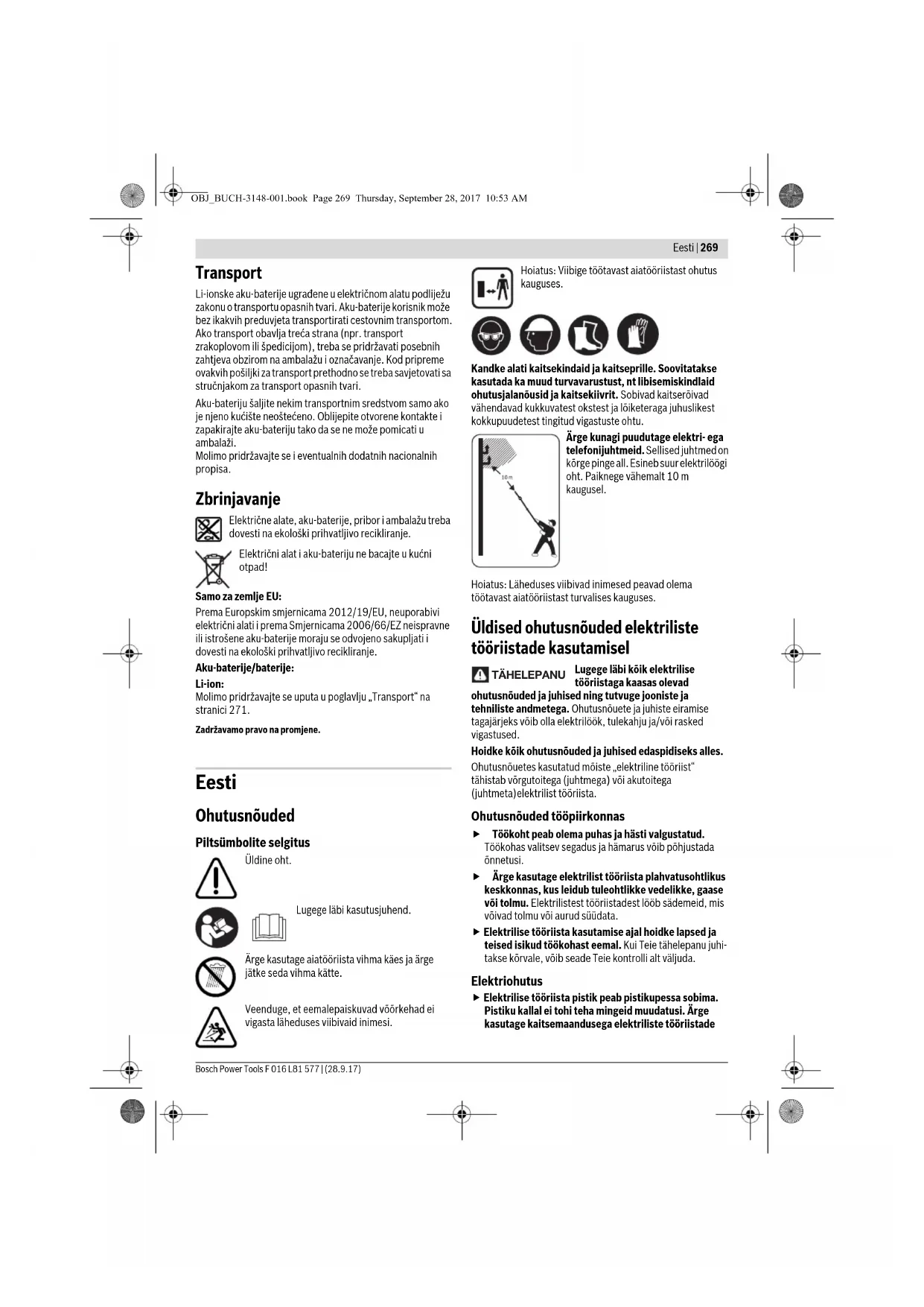 0... +45 -20...+50 OBJ_BUCH-3148-001.book Page 273 Thursday, September 28, 2017 10:53 AM274 | Eesti F 016 L81 577 | (28.9.17) Bosch Power Tools Andmed müra/vibratsiooni kohta Müratase määratud kooskõlas standardiga EN 60335-1. Seadme A-korrigeeritud müratase on üldjuhul: Helirõhu tase 72 dB(A); helivõimsuse tase 86 dB(A). Mõõtemääramatus K=4 dB. Vibratsioonitase a