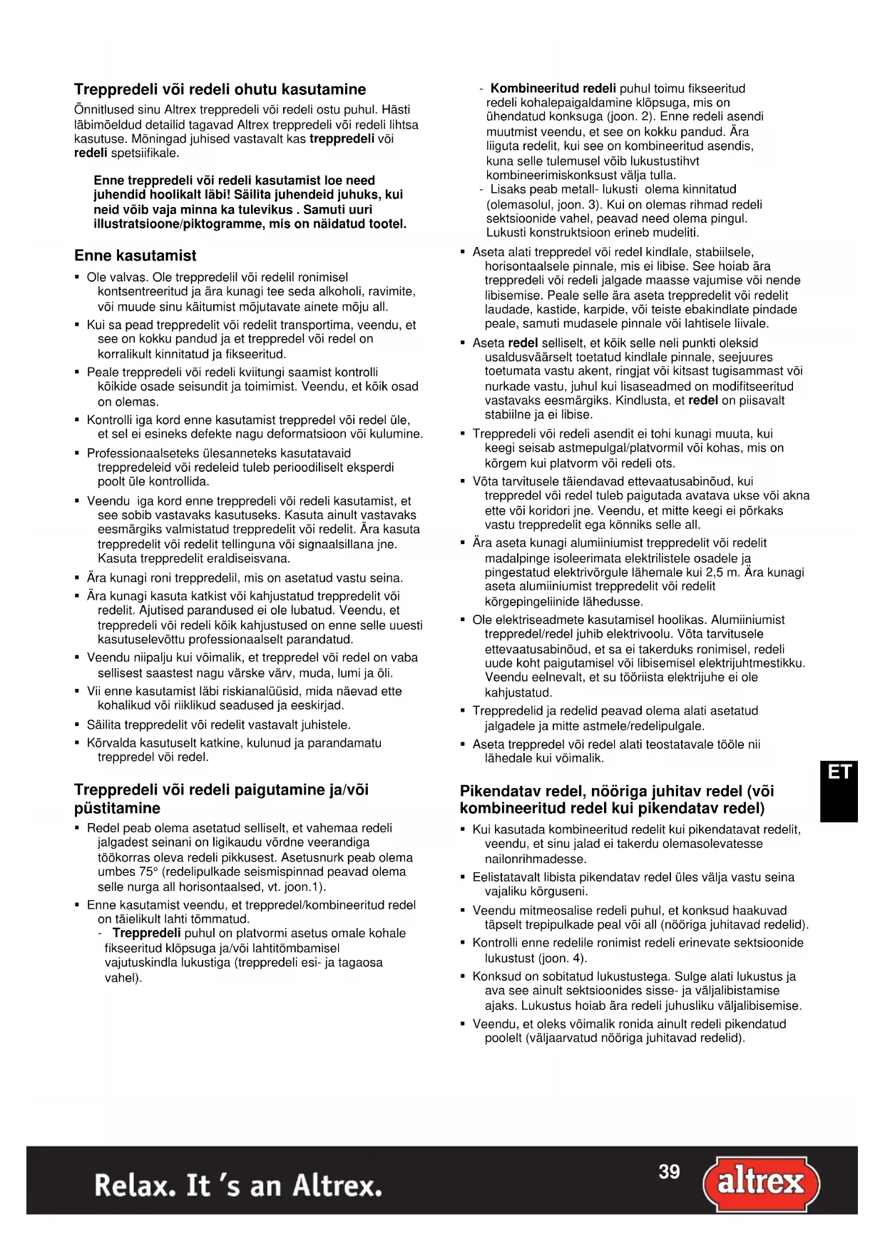 Treppredeli või redeli ohutu kasutamine Õnnitlused sinu Altrex treppredeli või redeli ostu puhul. Hästi läbimõeldud detailid tagavad Altrex treppredeli või redeli lihtsa kasutuse. Mõningad juhised vastavalt kas treppredeli või redeli spetsiifikale. Enne treppredeli või redeli kasutamist loe need juhendid hoolikalt läbi! Säilita juhendeid juhuks, kui neid võib vaja minna ka tulevikus . Samuti uuri illustratsioone/piktogramme, mis on näidatud tootel. Enne kasutamist Ole valvas. Ole treppredelil või redelil ronimisel kontsentreeritud ja ära kunagi tee seda alkoholi, ravimite, või muude sinu käitumist mõjutavate ainete mõju all. Kui sa pead treppredelit või redelit transportima, veendu, et see on kokku pandud ja et treppredel või redel on korralikult kinnitatud ja fikseeritud. Peale treppredeli või redeli kviitungi saamist kontrolli kõikide osade seisundit ja toimimist. Veendu, et kõik osad on olemas. Kontrolli iga kord enne kasutamist treppredel või redel üle, et sel ei esineks defekte nagu deformatsioon või kulumine. Professionaalseteks ülesanneteks kasutatavaid treppredeleid või redeleid tuleb perioodiliselt eksperdi poolt üle kontrollida. Veendu iga kord enne treppredeli või redeli kasutamist, et see sobib vastavaks kasutuseks. Kasuta ainult vastavaks eesmärgiks valmistatud treppredelit või redelit. Ära kasuta treppredelit või redelit tellinguna või signaalsillana jne. Kasuta treppredelit eraldiseisvana. Ära kunagi roni treppredelil, mis on asetatud vastu seina. Ära kunagi kasuta katkist või kahjustatud treppredelit või redelit. Ajutised parandused ei ole lubatud. Veendu, et treppredeli või redeli kõik kahjustused on enne selle uuesti kasutuselevõttu professionaalselt parandatud. Veendu niipalju kui võimalik, et treppredel või redel on vaba sellisest saastest nagu värske värv, muda, lumi ja õli. Vii enne kasutamist läbi riskianalüüsid, mida näevad ette kohalikud või riiklikud seadused ja eeskirjad. Säilita treppredelit või redelit vastavalt juhistele. Kõrvalda kasutuselt katkine, kulunud ja parandamatu treppredel või redel. Treppredeli või redeli paigutamine ja/või püstitamine Redel peab olema asetatud selliselt, et vahemaa redeli jalgadest seinani on ligikaudu võrdne veerandiga töökorras oleva redeli pikkusest. Asetusnurk peab olema umbes 75° (redelipulkade seismispinnad peavad olema selle nurga all horisontaalsed, vt. joon.1). Enne kasutamist veendu, et treppredel/kombineeritud redel on täielikult lahti tõmmatud. - Treppredeli puhul on platvormi asetus omale kohale fikseeritud klõpsuga ja/või lahtitõmbamisel vajutuskindla lukustiga (treppredeli esi- ja tagaosa vahel).