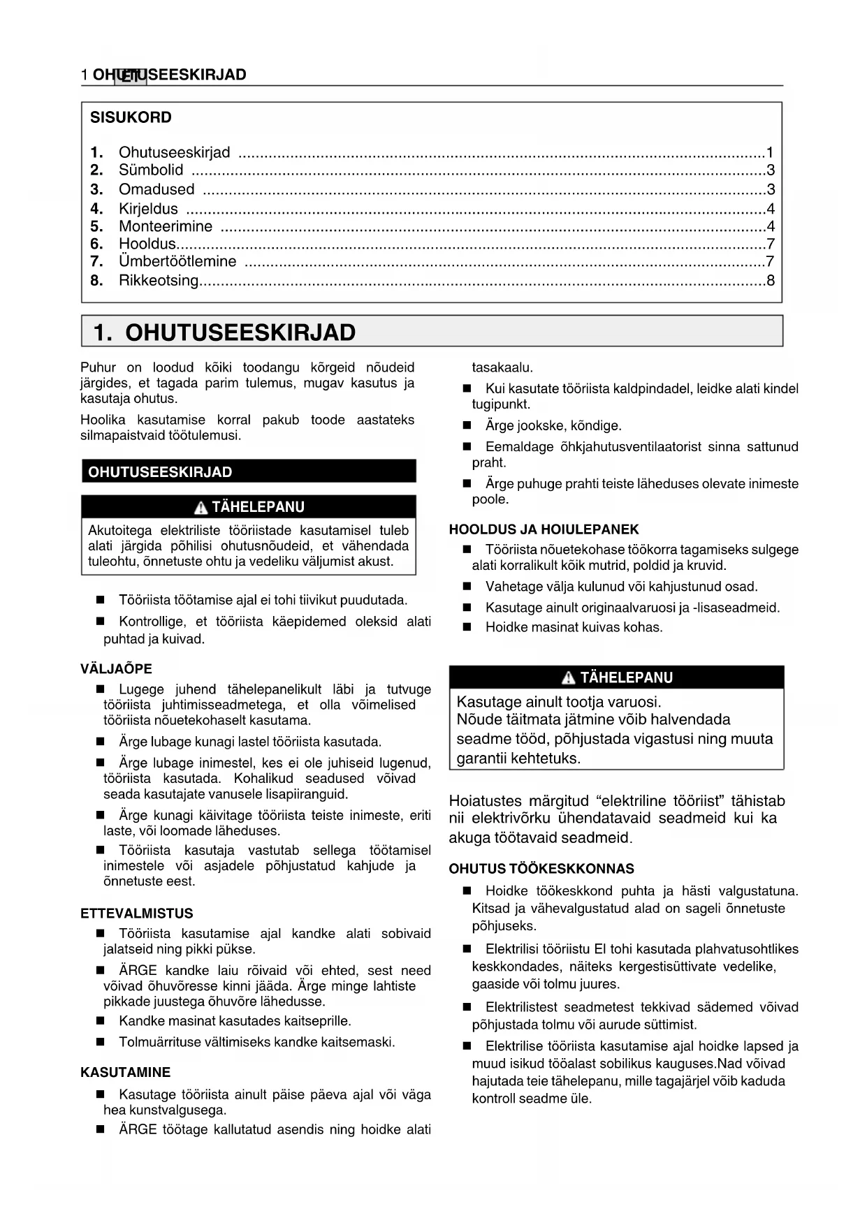 Tööriista nõuetekohase töökorra tagamiseks sulgege alati korralikult kõik mutrid, poldid ja kruvid. Vahetage välja kulunud või kahjustunud osad. Kasutage ainult originaalvaruosi ja -lisaseadmeid. Hoidke masinat kuivas kohas. TÄHELEPANU Kasutage ainult tootja varuosi. Nõude täitmata jätmine võib halvendada seadme tööd, põhjustada vigastusi ning muuta garantii kehtetuks. Hoiatustes märgitud “elektriline tööriist” tähistab nii elektrivõrku ühendatavaid seadmeid kui ka akuga töötavaid seadmeid