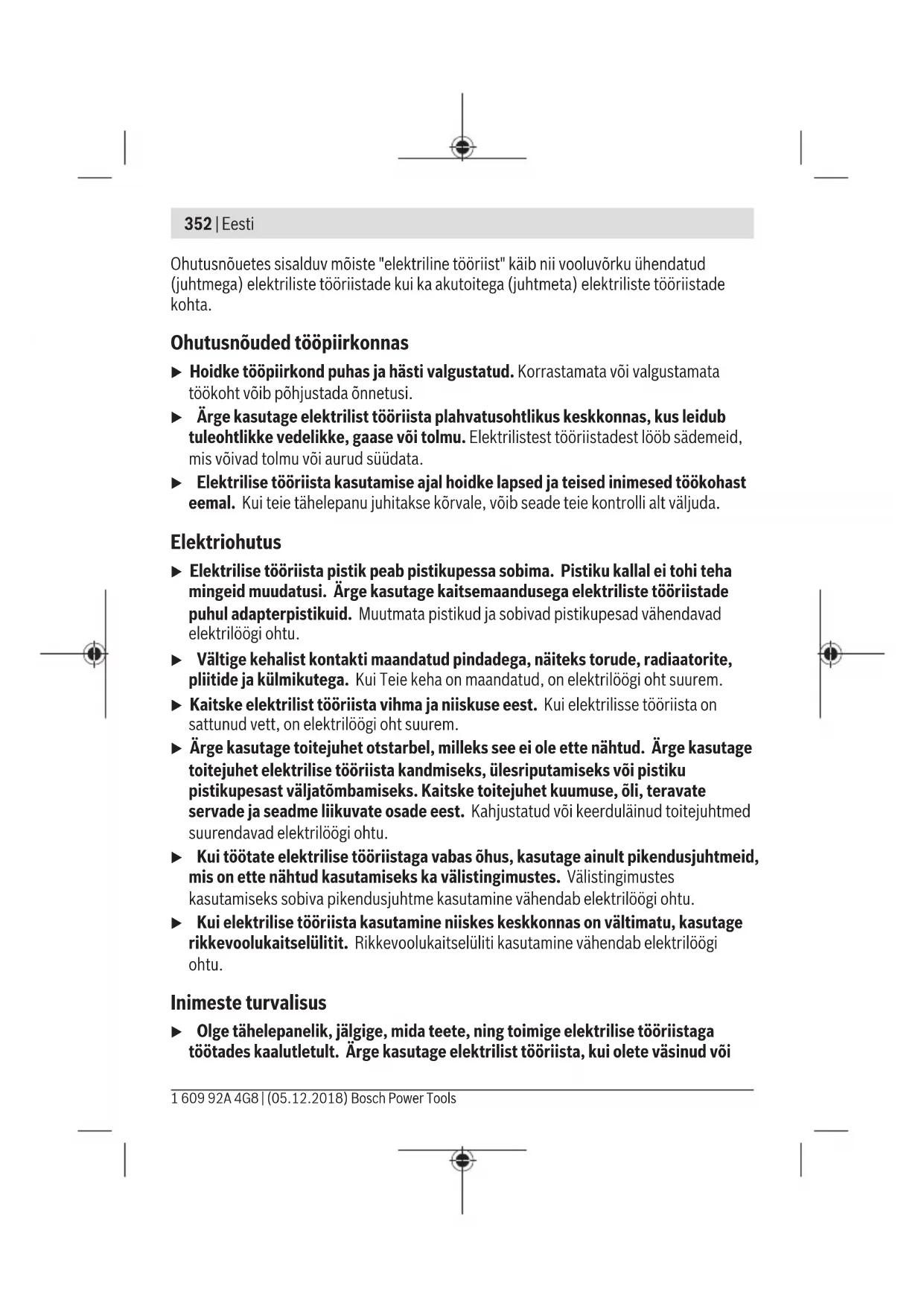 puksi kate (8) oleks töö ajal suletud. Nii väldite tolmu sissepääsemist. Töörežiimi seadmine Soovitud töörežiimi saate seada töörežiimi valikulülitiga (3). Seadke lüliti selleks vastava töörežiimi sümbolile. Sümbol Töörežiim Kruvimine = päripäeva + 1. käik Puurimine = päripäeva + 2. käik R = vastupäeva + 1. käik Sisse-/väljalülitamine Elektrilise tööriista kasutuselevõtmiseks vajutage elektrilise tööriista sisse-/väljalülitit (4) ja hoidke seda surutult. Elektrilise tööriista väljalülitamiseks vabastage sisse-/väljalüliti (4). Bosch Power Tools 1 609 92A 4G8 | (05.12.2018)362 | Eesti Hooldus ja korrashoid Hooldus ja puhastus u Eemaldage aku seadmest enne mis tahes töid seadme kallal (nt hooldus, tarvikute vahetus jmt), samuti enne seadme transportimist ja hoiulepanekut. Lüliti (sisse/välja) juhuslik käsitsemine toob kaasa vigastuste ohu. u Seadme laitmatu ja ohutu töö tagamiseks hoidke seade ja selle ventilatsiooniavad puhtad. Müügijärgne teenindus ja kasutusalane nõustamine Müügijärgse teeninduse töötajad nõustavad kliente tooteremondi ja -hoolduse ning varuosadega seotud küsimustes. Joonised ja info varuosade kohta leiate ka veebisaidilt: www.bosch-pt.com Boschi nõustajad aitavad Teid meeleldi toodete ja lisatarvikute küsimustes. Päringute esitamisel ja varuosade tellimisel näidake kindlasti ära seadme andmesildil olev 10‑kohaline tootenumber. Eesti Vabariik Mercantile Group AS Boschi elektriliste käsitööriistade remont ja hooldus Pärnu mnt. 549 76401 Saue vald, Laagri Tel.: 6549 568 Faks: 679 1129 Transport Komplektis sisalduvate liitium-ioonakude suhtes kohaldatakse ohtlike ainete vedu reguleerivaid nõudeid. Akude puhul on lubatud kasutajapoolne piiranguteta maanteevedu. Kolmandate isikute teostatava veo korral (nt õhuvedu või ekspedeerimine) tuleb järgida pakendi ja tähistuse osas kehtivaid erinõudeid. Sellisel juhul peab veose ettevalmistamisel alati osalema ohtlike ainete veo ekspert. Aku vedu on lubatud vaid siis, kui aku korpus on vigastusteta. Katke lahtised kontaktid teibiga ja pakkige aku nii, et see pakendis ei liiguks. Järgige ka võimalikke täiendavaid siseriiklikke nõudeid. 1 609 92A 4G8 | (05.12.2018) Bosch Power ToolsLatviešu | 363 Kasutuskõlbmatuks muutunud seadmete käitlus Elektrilised tööriistad, akud, lisatarvikud ja pakendid tuleb keskkonnasäästlikult ringlusse võtta. Ärge käidelge elektrilisi tööriistu ja akusid/ patareisid koos olmejäätmetega! Üksnes ELliikmesriikidele: Vastavalt Euroopa Liidu direktiividele 2012/19/EL ja 2006/66/EÜ tuleb kasutusressursi ammendanud elektrilised tööriistad ning defektsed või kasutusressursi ammendanud akud/patareid eraldi kokku koguda ja keskkonnasäästlikult korduskasutada. Akud/patareid: Li-Ion: Järgige punktis Transport toodud juhiseid (vaadake „Transport“, Lehekülg362). Latviešu Vispārēji drošības noteikumi elektroinstrumentiem