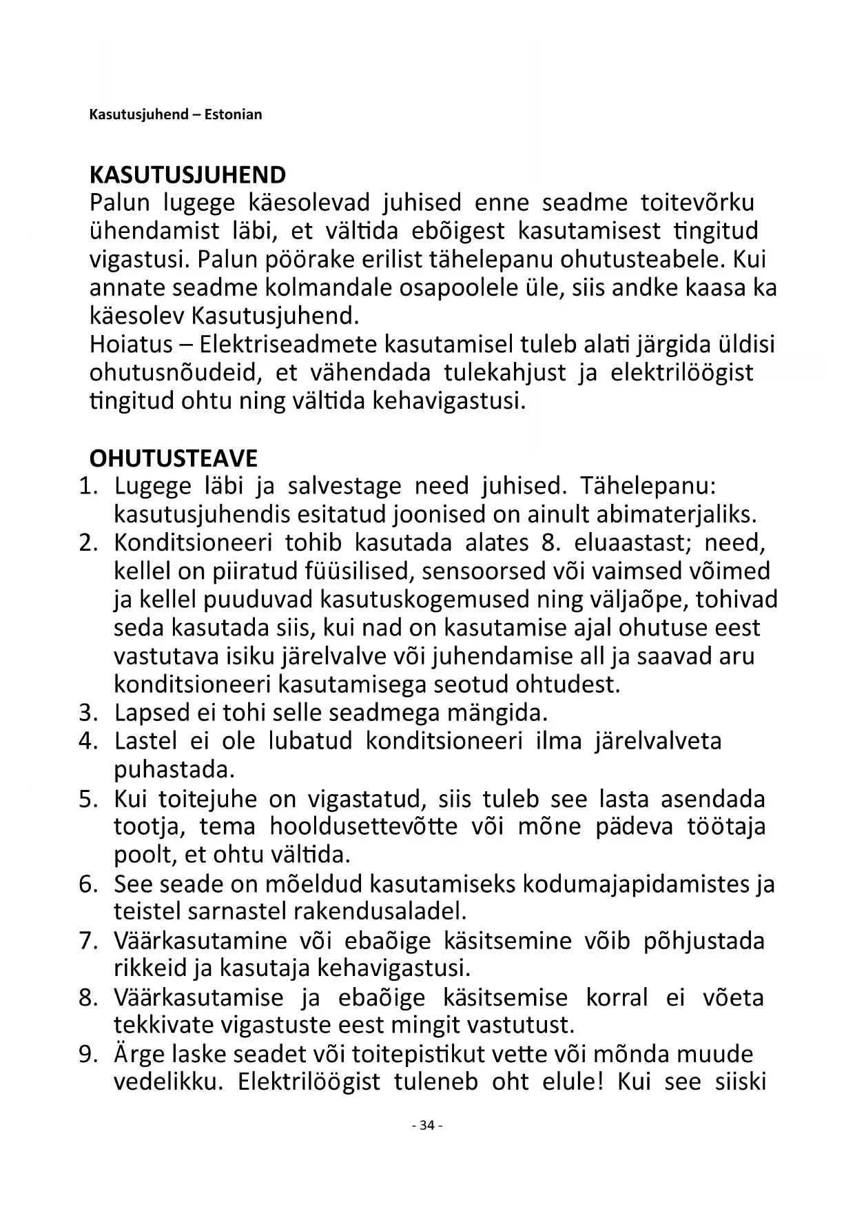 Consulte el manual de instrucciones que se adjunta al aparato para obtener información para los consumidores sobre la instalación, el uso y el mantenimiento del producto, así como información sobre RAEE.- 34 - Kasutusjuhend – Estonian KASUTUSJUHEND Palun lugege käesolevad juhised enne seadme toitevõrku ühendamist läbi, et vältida ebõigest kasutamisest tingitud vigastusi. Palun pöörake erilist tähelepanu ohutusteabele. Kui annate seadme kolmandale osapoolele üle, siis andke kaasa ka käesolev Kasutusjuhend. Hoiatus – Elektriseadmete kasutamisel tuleb alati järgida üldisi ohutusnõudeid, et vähendada tulekahjust ja elektrilöögist tingitud ohtu ning vältida kehavigastusi. OHUTUSTEAVE