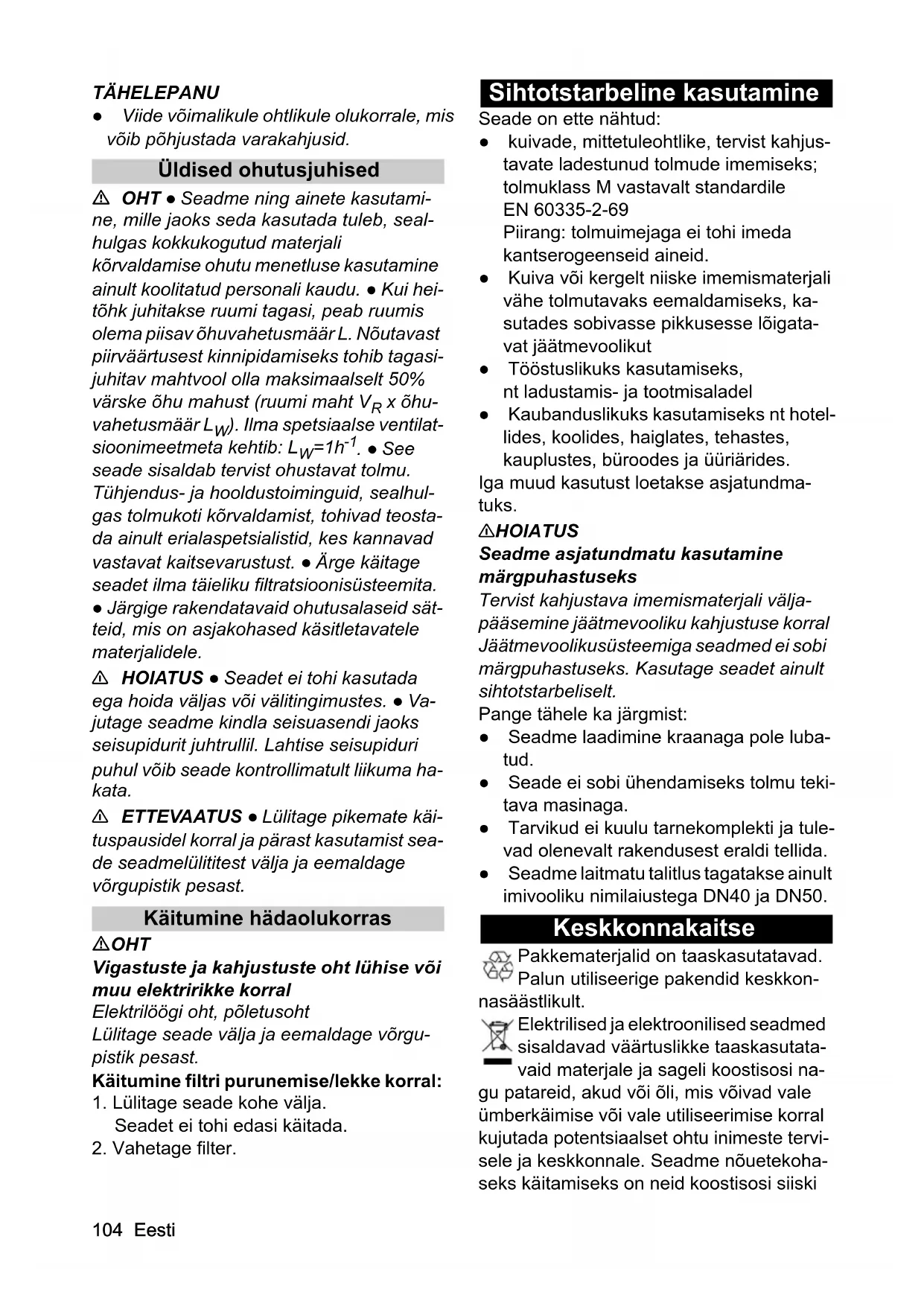- EL vastavusdeklaratsioon 04 Eesti TÄHELEPANU ● Viide võimalikule ohtlikule olukorrale, mis võib põhjustada varakahjusid. Üldised ohutusjuhised OHT ● Seadme ning ainete kasutami- ne, mille jaoks seda kasutada tuleb, seal- hulgas kokkukogutud materjali kõrvaldamise ohutu menetluse kasutamine ainult koolitatud personali kaudu. ● Kui hei- tõhk juhitakse ruumi tagasi, peab ruumis olema piisav õhuvahetusmäär L. Nõutavast piirväärtusest kinnipidamiseks tohib tagasi- juhitav mahtvool olla maksimaalselt 50% värske õhu mahust (ruumi maht V p. 1101