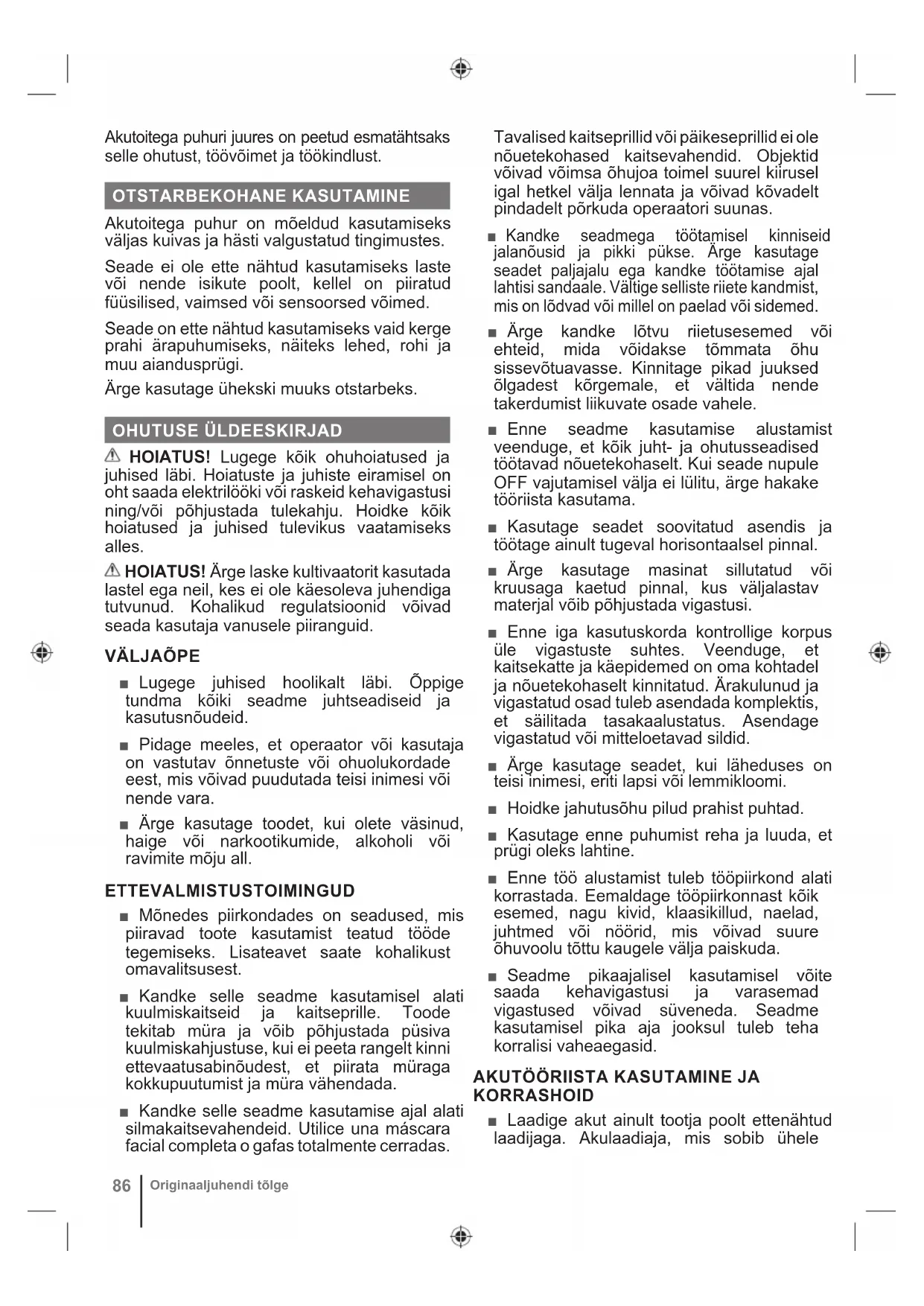 ■ Lugege juhised hoolikalt läbi. Õppige tundma kõiki seadme juhtseadiseid ja kasutusnõudeid. ■ Pidage meeles, et operaator või kasutaja on vastutav õnnetuste või ohuolukordade eest, mis võivad puudutada teisi inimesi või nende vara. ■ Ärge kasutage toodet, kui olete väsinud, haige või narkootikumide, alkoholi või ravimite mõju all. ETTEVALMISTUSTOIMINGUD ■ Mõnedes piirkondades on seadused, mis piiravad toote kasutamist teatud tööde tegemiseks. Lisateavet saate kohalikust omavalitsusest. ■ Kandke selle seadme kasutamisel alati kuulmiskaitseid ja kaitseprille. Toode tekitab müra ja võib põhjustada püsiva kuulmiskahjustuse, kui ei peeta rangelt kinni ettevaatusabinõudest, et piirata müraga kokkupuutumist ja müra vähendada. ■ Kandke selle seadme kasutamise ajal alati silmakaitsevahendeid. Utilice una máscara facial completa o gafas totalmente cerradas. Tavalised kaitseprillid või päikeseprillid ei ole nõuetekohased kaitsevahendid. Objektid võivad võimsa õhujoa toimel suurel kiirusel igal hetkel välja lennata ja võivad kõvadelt pindadelt põrkuda operaatori suunas. ■ Kandke seadmega töötamisel kinniseid jalanõusid ja pikki pükse. Ärge kasutage seadet paljajalu ega kandke töötamise ajal lahtisi sandaale. Vältige selliste riiete kandmist, mis on lõdvad või millel on paelad või sidemed. ■ Ärge kandke lõtvu riietusesemed või ehteid, mida võidakse tõmmata õhu sissevõtuavasse. Kinnitage pikad juuksed õlgadest kõrgemale, et vältida nende takerdumist liikuvate osade vahele. ■ Enne seadme kasutamise alustamist veenduge, et kõik juht- ja ohutusseadised töötavad nõuetekohaselt. Kui seade nupule OFF vajutamisel välja ei lülitu, ärge hakake tööriista kasutama. ■ Kasutage seadet soovitatud asendis ja töötage ainult tugeval horisontaalsel pinnal. ■ Ärge kasutage masinat sillutatud või kruusaga kaetud pinnal, kus väljalastav materjal võib põhjustada vigastusi. ■ Enne iga kasutuskorda kontrollige korpus üle vigastuste suhtes. Veenduge, et kaitsekatte ja käepidemed on oma kohtadel ja nõuetekohaselt kinnitatud. Ärakulunud ja vigastatud osad tuleb asendada komplektis, et säilitada tasakaalustatus. Asendage vigastatud või mitteloetavad sildid. ■ Ärge kasutage seadet, kui läheduses on teisi inimesi, eriti lapsi või lemmikloomi. ■ Hoidke jahutusõhu pilud prahist puhtad. ■ Kasutage enne puhumist reha ja luuda, et prügi oleks lahtine. ■ Enne töö alustamist tuleb tööpiirkond alati korrastada. Eemaldage tööpiirkonnast kõik esemed, nagu kivid, klaasikillud, naelad, juhtmed või nöörid, mis võivad suure õhuvoolu tõttu kaugele välja paiskuda. ■ Seadme pikaajalisel kasutamisel võite saada kehavigastusi ja varasemad vigastused võivad süveneda. Seadme kasutamisel pika aja jooksul tuleb teha korralisi vaheaegasid.