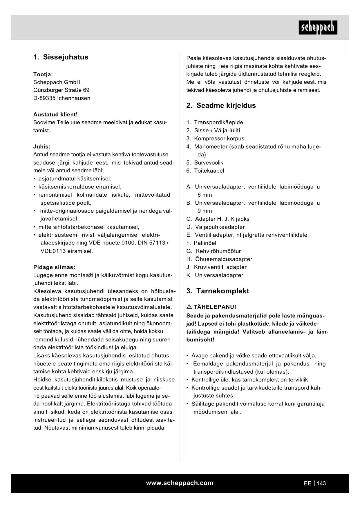 Tootja: Scheppach GmbH Günzburger Straße 69 D-89335 Ichenhausen Austatud klient! Soovime Teile uue seadme meeldivat ja edukat kasu- tamist. Juhis: Antud seadme tootja ei vastuta kehtiva tootevastutuse seaduse järgi kahjude eest, mis tekivad antud sead- mele või antud seadme läbi: