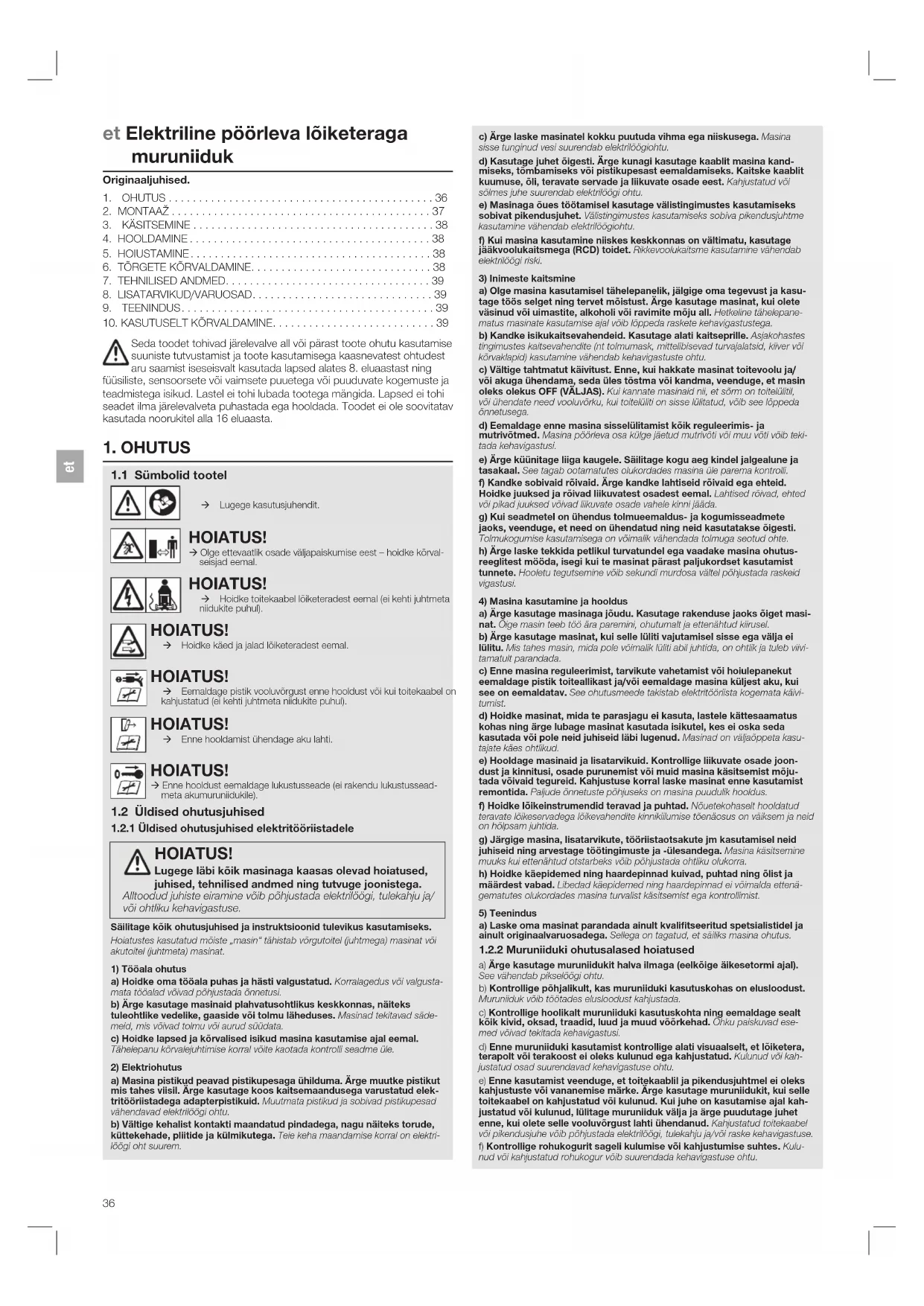 Æ Lugege kasutusjuhendit. HOIATUS! Æ Olge ettevaatlik osade väljapaiskumise eest – hoidke kõrval- seisjad eemal. HOIATUS! Æ Hoidke toitekaabel lõiketeradest eemal (ei kehti juhtmeta niidukite puhul). HOIATUS! Æ Hoidke käed ja jalad lõiketeradest eemal. HOIATUS! Æ Eemaldage pistik vooluvõrgust enne hooldust või kui toitekaabel on kahjustatud (ei kehti juhtmeta niidukite puhul). HOIATUS! Æ Enne hooldamist ühendage aku lahti. HOIATUS! Æ Enne hooldust eemaldage lukustusseade (ei rakendu lukustussead- meta akumuruniidukile).