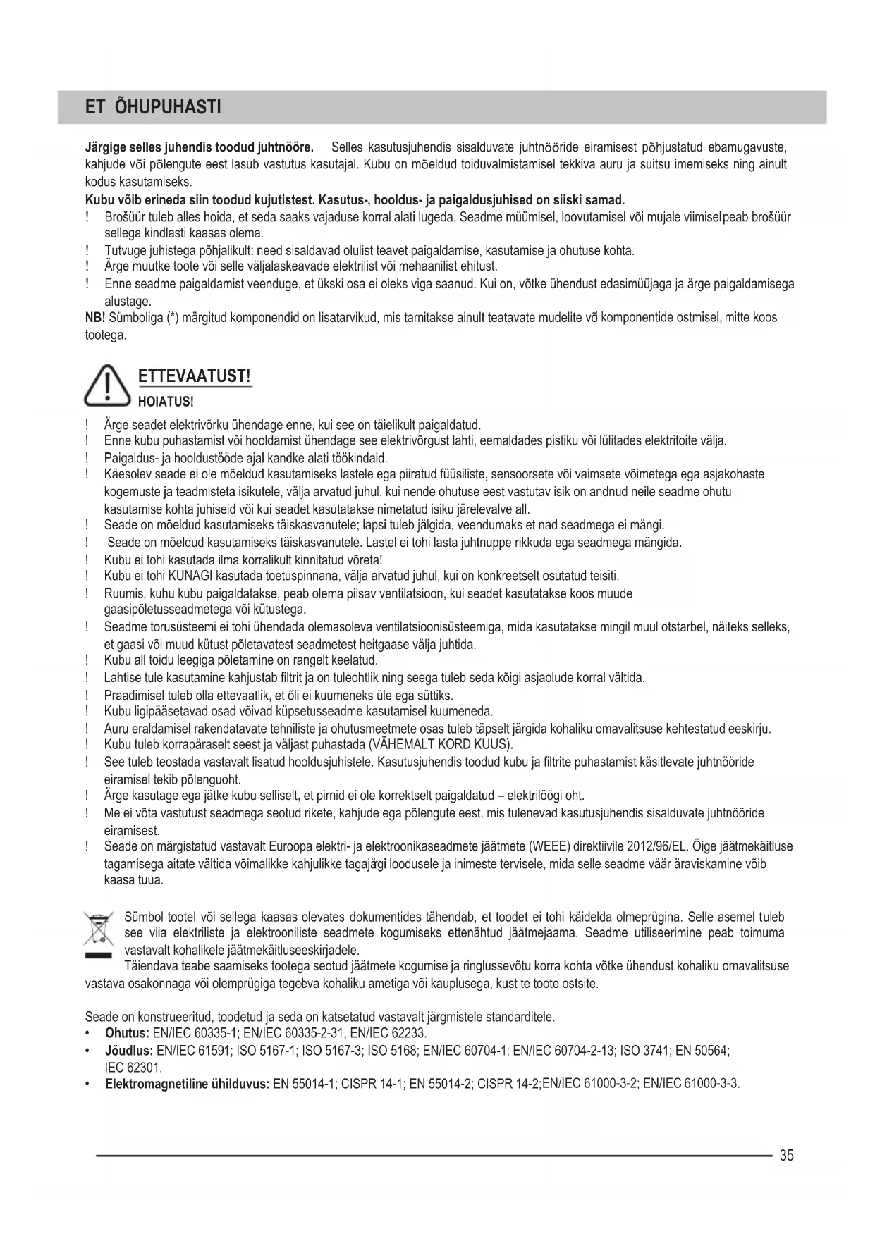 Järgige selles juhendis toodud juhtnööre. Selles kasutusjuhendis sisalduvate juhtnööride eiramisest põhjustatud ebamugavuste, kahjude või põlengute eest lasub vastutus kasutajal. Kubu on mõeldud toiduvalmistamisel tekkiva auru ja suitsu imemiseks ning ainult kodus kasutamiseks. Kubu võib erineda siin toodud kujutistest. Kasutus-, hooldus- ja paigaldusjuhised on siiski samad. ! Brošüür tuleb alles hoida, et seda saaks vajaduse korral alati lugeda. Seadme müümisel, loovutamisel või mujale viimisel peab brošüür sellega kindlasti kaasas olema. ! Tutvuge juhistega põhjalikult: need sisaldavad olulist teavet paigaldamise, kasutamise ja ohutuse kohta. ! Ärge muutke toote või selle väljalaskeavade elektrilist või mehaanilist ehitust. ! Enne seadme paigaldamist veenduge, et ükski osa ei oleks viga saanud. Kui on, võtke ühendust edasimüüjaga ja ärge paigaldamisega alustage. NB! Sümboliga (*) märgitud komponendid on lisatarvikud, mis tarnitakse ainult teatavate mudelite võ i komponentide ostmisel, mitte koos tootega. ETTEVAATUST! HOIATUS! ! Ärge seadet elektrivõrku ühendage enne, kui see on täielikult paigaldatud. ! Enne kubu puhastamist või hooldamist ühendage see elektrivõrgust lahti, eemaldades pistiku või lülitades elektritoite välja. ! Paigaldus- ja hooldustööde ajal kandke alati töökindaid. ! Käesolev seade ei ole mõeldud kasutamiseks lastele ega piiratud füüsiliste, sensoorsete või vaimsete võimetega ega asjakohaste kogemuste ja teadmisteta isikutele, välja arvatud juhul, kui nende ohutuse eest vastutav isik on andnud neile seadme ohutu kasutamise kohta juhiseid või kui seadet kasutatakse nimetatud isiku järelevalve all. ! Seade on mõeldud kasutamiseks täiskasvanutele; lapsi tuleb jälgida, veendumaks et nad seadmega ei mängi. ! Seade on mõeldud kasutamiseks täiskasvanutele. Lastel ei tohi lasta juhtnuppe rikkuda ega seadmega mängida. ! Kubu ei tohi kasutada ilma korralikult kinnitatud võreta! ! Kubu ei tohi KUNAGI kasutada toetuspinnana, välja arvatud juhul, kui on konkreetselt osutatud teisiti. ! Ruumis, kuhu kubu paigaldatakse, peab olema piisav ventilatsioon, kui seadet kasutatakse koos muude gaasipõletusseadmetega või kütustega. ! Seadme torusüsteemi ei tohi ühendada olemasoleva ventilatsioonisüsteemiga, mida kasutatakse mingil muul otstarbel, näiteks selleks, et gaasi või muud kütust põletavatest seadmetest heitgaase välja juhtida. ! Kubu all toidu leegiga põletamine on rangelt keelatud. ! Lahtise tule kasutamine kahjustab filtrit ja on tuleohtlik ning seega tuleb seda kõigi asjaolude korral vältida. ! Praadimisel tuleb olla ettevaatlik, et õli ei kuumeneks üle ega süttiks. ! Kubu ligipääsetavad osad võivad küpsetusseadme kasutamisel kuumeneda. ! Auru eraldamisel rakendatavate tehniliste ja ohutusmeetmete osas tuleb täpselt järgida kohaliku omavalitsuse kehtestatud eeskirju. ! Kubu tuleb korrapäraselt seest ja väljast puhastada (VÄHEMALT KORD KUUS). ! See tuleb teostada vastavalt lisatud hooldusjuhistele. Kasutusjuhendis toodud kubu ja filtrite puhastamist käsitlevate juhtnööride eiramisel tekib põlenguoht. ! Ärge kasutage ega jätke kubu selliselt, et pirnid ei ole korrektselt paigaldatud – elektrilöögi oht. ! Me ei võta vastutust seadmega seotud rikete, kahjude ega põlengute eest, mis tulenevad kasutusjuhendis sisalduvate juhtnööride eiramisest. ! Seade on märgistatud vastavalt Euroopa elektri- ja elektroonikaseadmete jäätmete (WEEE) direktiivile 2012/96/EL. Õige jäätmekäitluse tagamisega aitate vältida võimalikke kahjulikke tagajä rgi loodusele ja inimeste tervisele, mida selle seadme väär äraviskamine võib kaasa tuua. Sümbol tootel või sellega kaasas olevates dokumentides tähendab, et toodet ei tohi käidelda olmeprügina. Selle asemel tuleb see viia elektriliste ja elektrooniliste seadmete kogumiseks ettenähtud jäätmejaama. Seadme utiliseerimine peab toimuma vastavalt kohalikele jäätmekäitluseeskirjadele. Täiendava teabe saamiseks tootega seotud jäätmete kogumise ja ringlussevõtu korra kohta võtke ühendust kohaliku omavalitsuse vastava osakonnaga või olemprügiga tegel eva kohaliku ametiga või kauplusega, kust te toote ostsite. Seade on konstrueeritud, toodetud ja seda on katsetatud vastavalt järgmistele standarditele.