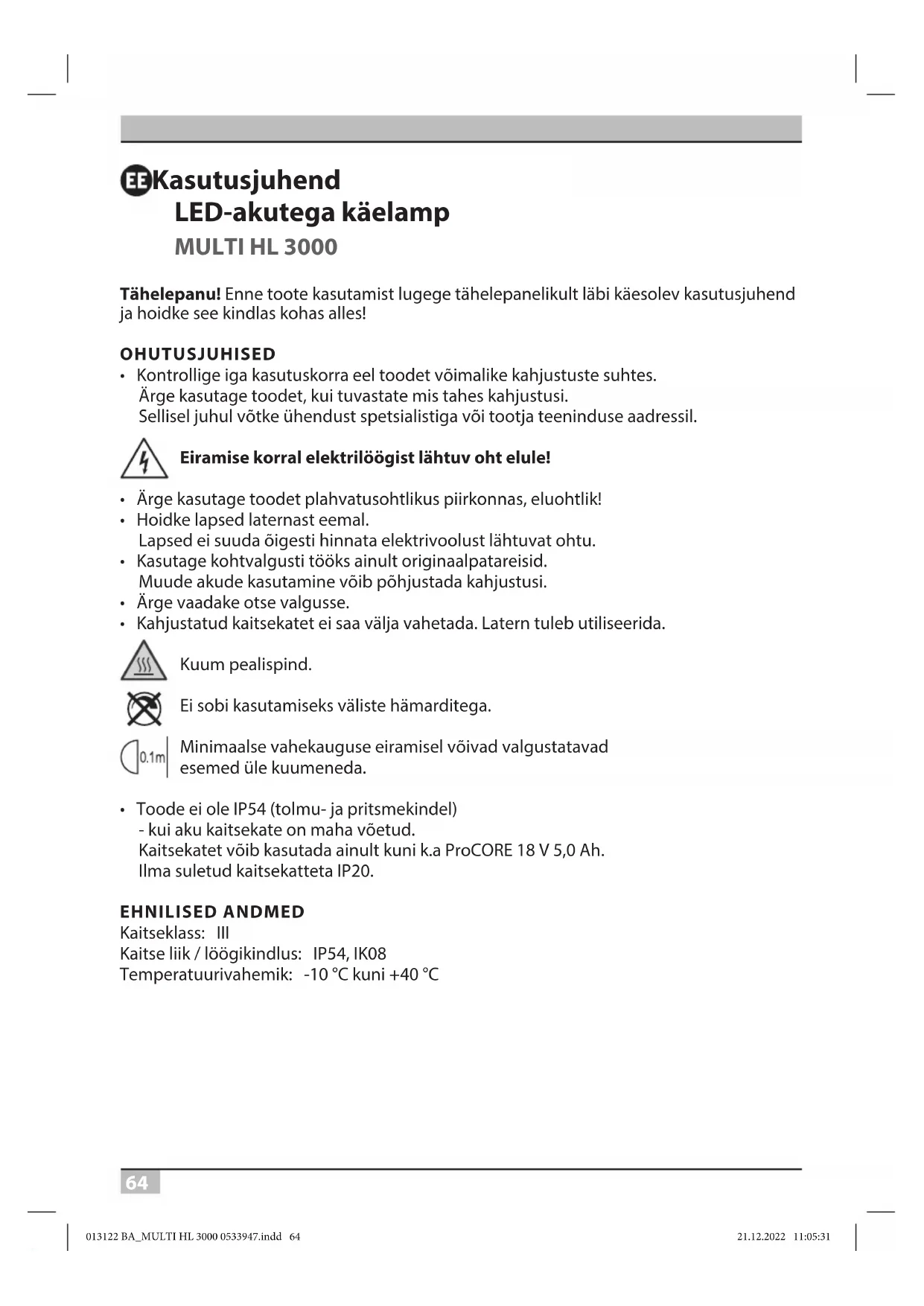 - Toode ei ole IP54 (tolmu- ja pritsmekindel) - kui aku kaitsekate on maha võetud. Kaitsekatet võib kasutada ainult kuni k.a ProCORE 18 V 5,0 Ah. Ilma suletud kaitsekatteta IP20. EHNILISED ANDMED Kaitseklass: III Kaitse liik / löögikindlus: IP54, IK08 Temperatuurivahemik: -10 °C kuni +40 °C 013122 BA_MULTI HL 3000 0533947.indd 64013122 BA_MULTI HL 3000 0533947.indd 64 21.12.2022 11:05:3121.12.2022 11:05:3165 MULTI HL 3000 Kasutusjuhend Tüüp: MULTI HL 3000 Ühilduvad akutüübid: Ülevaate kõigist saadaolevatest adapteritest ja sobivatest akudest leiate meie kodulehelt www.brennenstuhl.com Max. projitseeritav pind: 183,63 cm