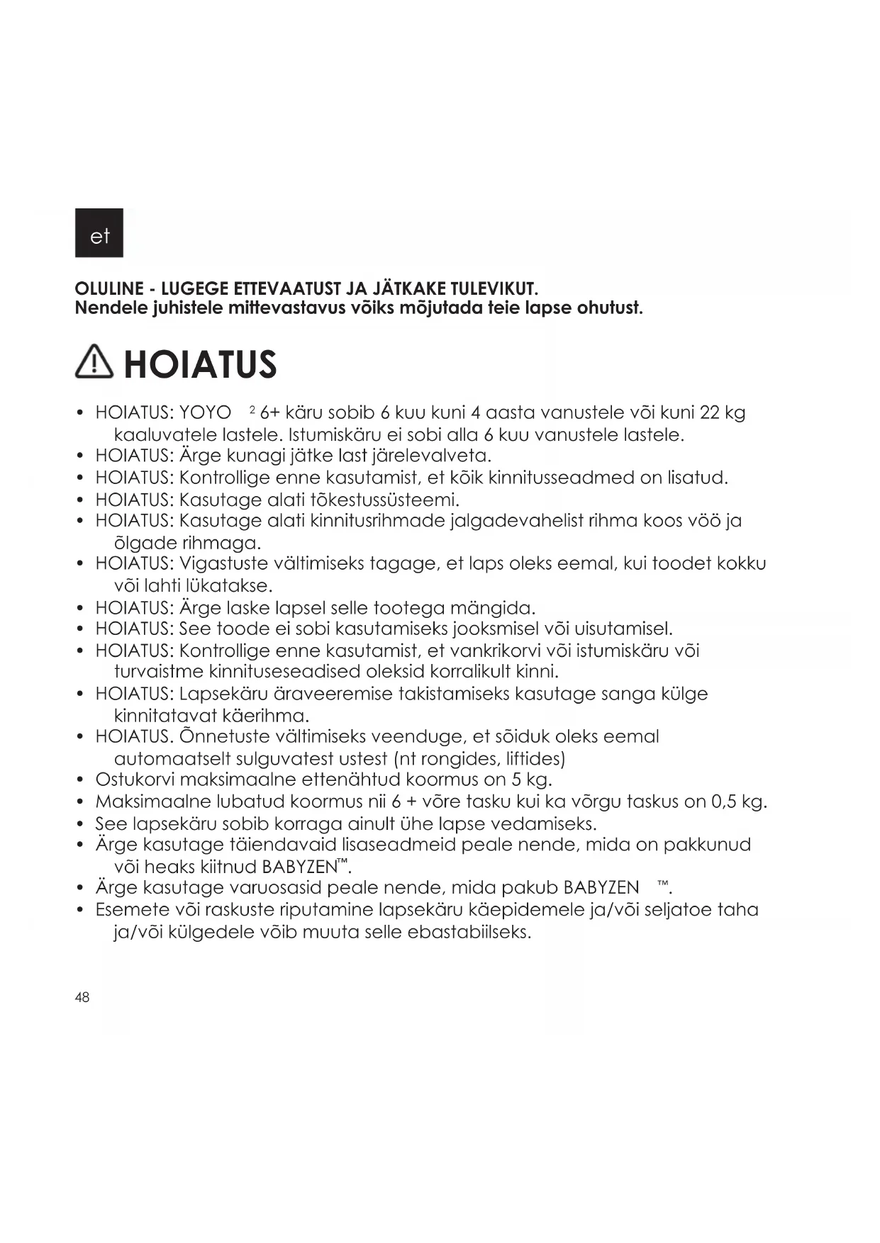 - Esemete või raskuste riputamine lapsekäru käepidemele ja/või seljatoe taha ja/või külgedele võib muuta selle ebastabiilseks. 48et