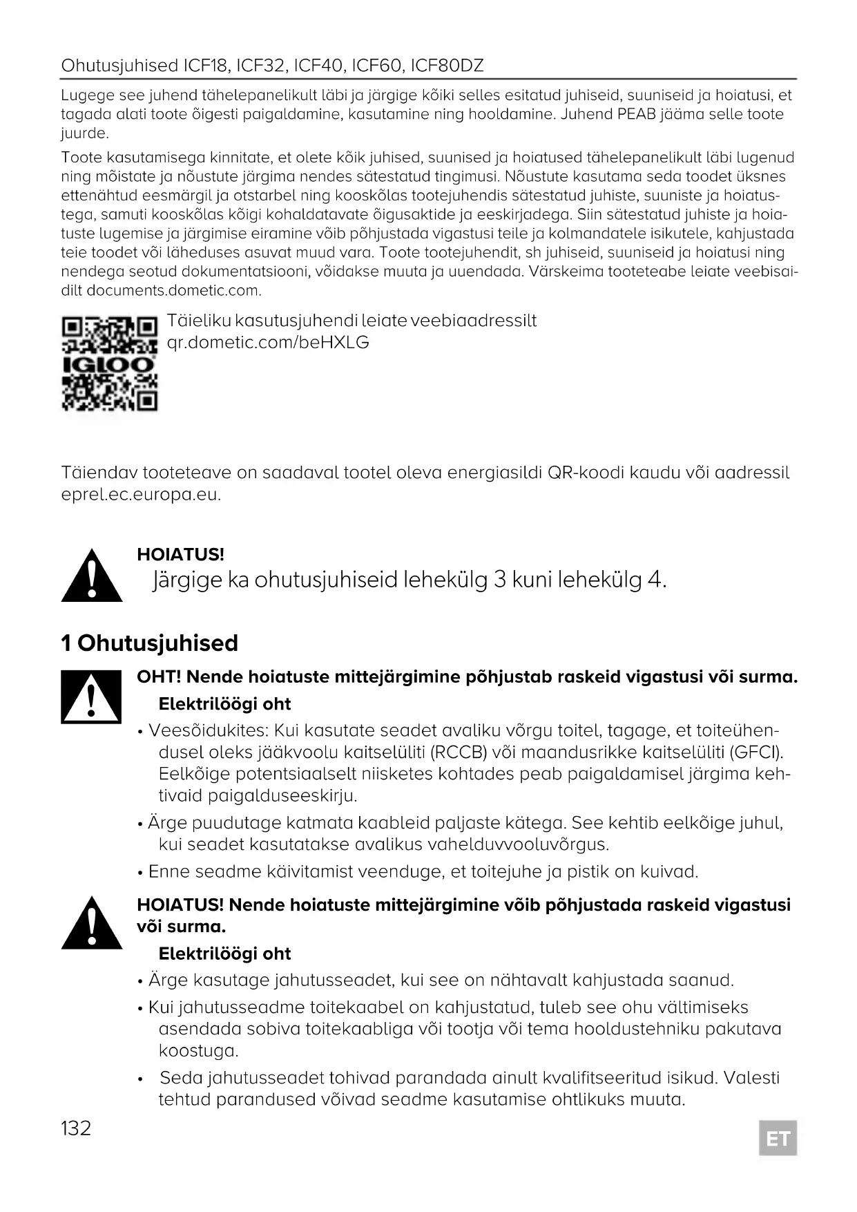 - Seda jahutusseadet tohivad parandada ainult kvalifitseeritud isikud. Valesti tehtud parandused võivad seadme kasutamise ohtlikuks muuta. Täieliku kasutusjuhendi leiate veebiaadressilt qr.dometic.com/beHXLG Igloo ICF18, ICF32, ICF40, ICF60, ICF80DZ_ SOM_4445103836_ EMEA24-ar _202x-xx-xx.book Page 132 Friday, September 15, 2023 12:50 P MICF18, ICF32, ICF40, ICF60, ICF80DZ Ohutusjuhised