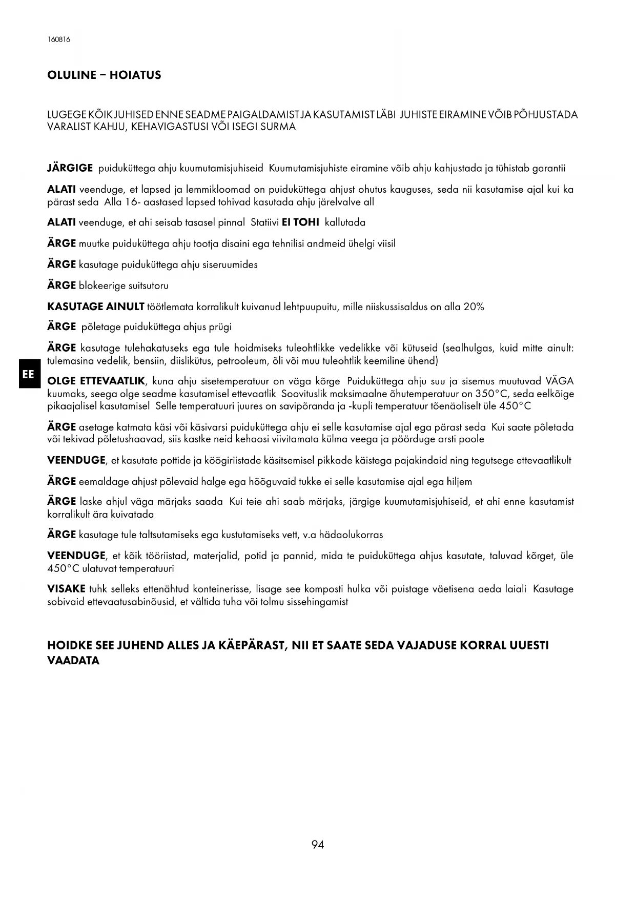 OLULINE – HOIATUS LUGEGE KÕIK JUHISED ENNE SEADME PAIGALDAMIST JA KASUTAMIST LÄBI JUHISTE EIRAMINE VÕIB PÕHJUSTADA VARALIST KAHJU, KEHAVIGASTUSI VÕI ISEGI SURMA JÄRGIGE puiduküttega ahju kuumutamisjuhiseid Kuumutamisjuhiste eiramine võib ahju kahjustada ja tühistab garantii ALATI veenduge, et lapsed ja lemmikloomad on puiduküttega ahjust ohutus kauguses, seda nii kasutamise ajal kui ka pärast seda Alla 16- aastased lapsed tohivad kasutada ahju järelvalve all ALATI veenduge, et ahi seisab tasasel pinnal Statiivi EI TOHI kallutada ÄRGE muutke puiduküttega ahju tootja disaini ega tehnilisi andmeid ühelgi viisil ÄRGE kasutage puiduküttega ahju siseruumides ÄRGE blokeerige suitsutoru KASUTAGE AINULT töötlemata korralikult kuivanud lehtpuupuitu, mille niiskussisaldus on alla 20% ÄRGE põletage puiduküttega ahjus prügi ÄRGE kasutage tulehakatuseks ega tule hoidmiseks tuleohtlikke vedelikke või kütuseid (sealhulgas, kuid mitte ainult: tulemasina vedelik, bensiin, diislikütus, petrooleum, õli või muu tuleohtlik keemiline ühend) OLGE ETTEVAATLIK, kuna ahju sisetemperatuur on väga kõrge Puiduküttega ahju suu ja sisemus muutuvad VÄGA kuumaks, seega olge seadme kasutamisel ettevaatlik Soovituslik maksimaalne õhutemperatuur on 350°C, seda eelkõige pikaajalisel kasutamisel Selle temperatuuri juures on savipõranda ja -kupli temperatuur tõenäoliselt üle 450°C ÄRGE asetage katmata käsi või käsivarsi puiduküttega ahju ei selle kasutamise ajal ega pärast seda Kui saate põletada või tekivad põletushaavad, siis kastke neid kehaosi viivitamata külma veega ja pöörduge arsti poole VEENDUGE, et kasutate pottide ja köögiriistade käsitsemisel pikkade käistega pajakindaid ning tegutsege ettevaatlikult ÄRGE eemaldage ahjust põlevaid halge ega hõõguvaid tukke ei selle kasutamise ajal ega hiljem ÄRGE laske ahjul väga märjaks saada Kui teie ahi saab märjaks, järgige kuumutamisjuhiseid, et ahi enne kasutamist korralikult ära kuivatada ÄRGE kasutage tule taltsutamiseks ega kustutamiseks vett, v.a hädaolukorras VEENDUGE, et kõik tööriistad, materjalid, potid ja pannid, mida te puiduküttega ahjus kasutate, taluvad kõrget, üle 450°C ulatuvat temperatuuri VISAKE tuhk selleks ettenähtud konteinerisse, lisage see komposti hulka või puistage väetisena aeda laiali Kasutage sobivaid ettevaatusabinõusid, et vältida tuha või tolmu sissehingamist HOIDKE SEE JUHEND ALLES JA KÄEPÄRAST, NII ET SAATE SEDA VAJADUSE KORRAL UUESTI VAADATA