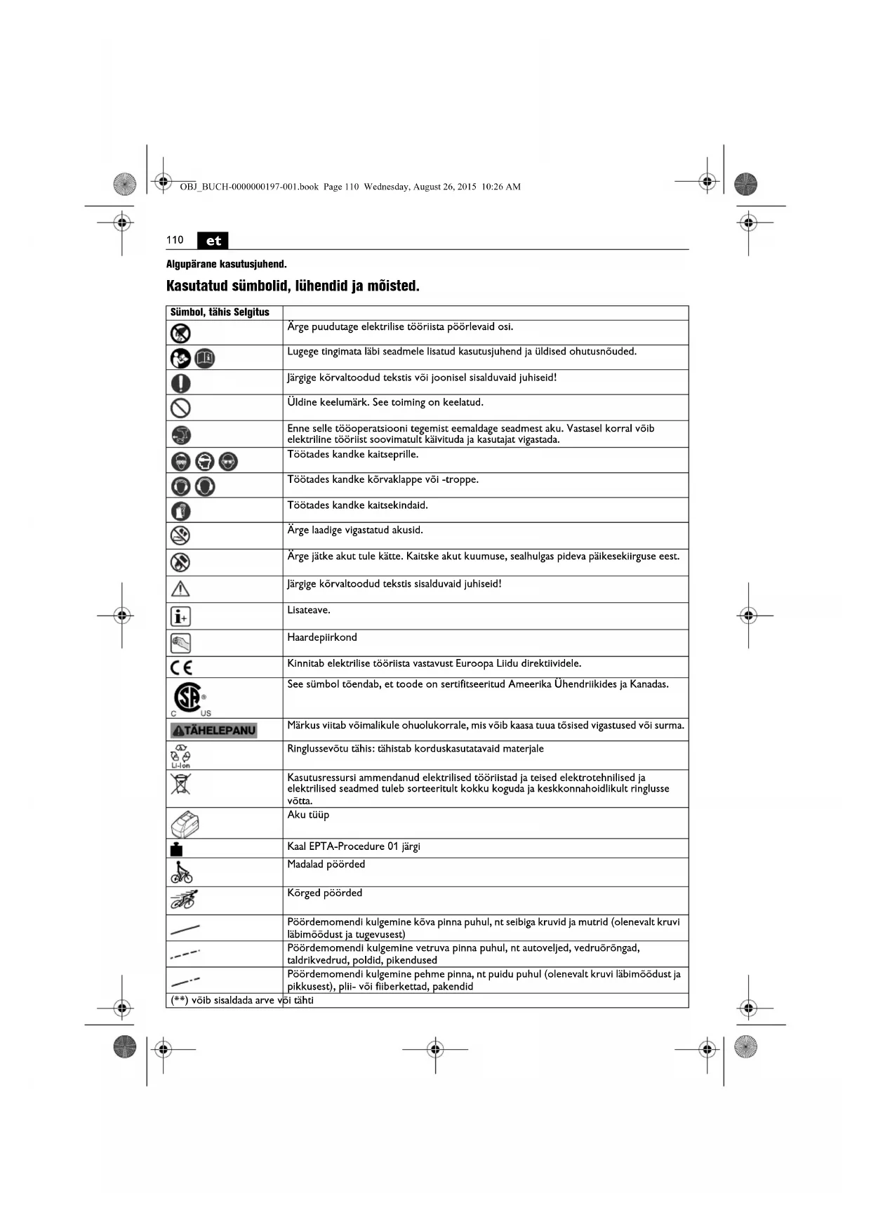 Elektrilisele tööriistale ei tohi kruvide või neetidega kinnitada silte ja märgiseid. Kahjustatud isolatsioon ei taga kaltset elektrilöögl eest. Kasutage kleebiseld.